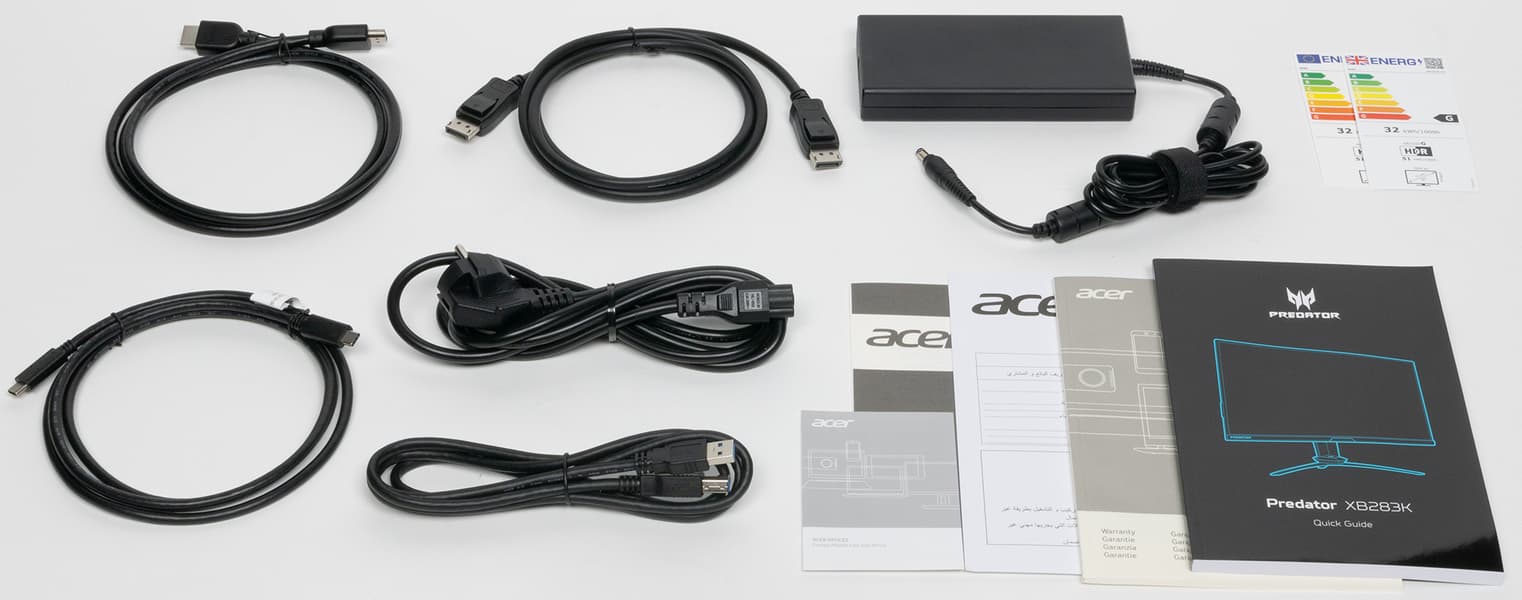 К монитору прилагается неплохой комплект кабелей (но не очень длинных), а на кабеле HDMI даже указано, что он поддерживает сигнал 8К. Качество кабелей с виду хорошее, и качество подтверждено тем, что в ходе тестирования с их использованием даже на предельных режимах никаких артефактов не было выявлено.