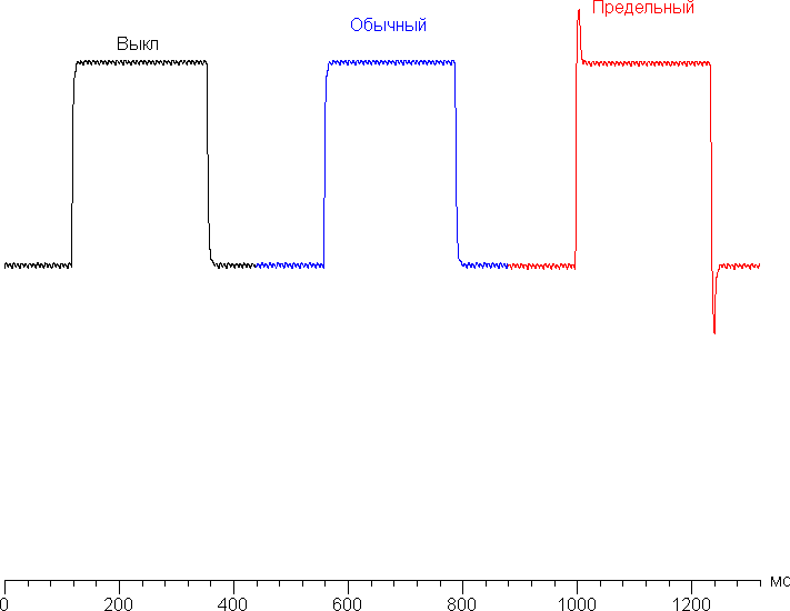 Время отклика зависит от значения одноименной настройки, которая управляет разгоном матрицы. Ступени регулировки три. График ниже показывает, как меняется время включения и выключения при переходе черный-белый-черный (столбики «вкл.» и «выкл.»), а также среднее суммарное время для переходов между полутонами (столбики GTG):