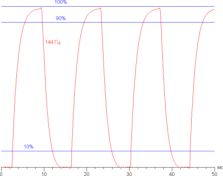 Видно, что при 144 Гц чередования максимальная яркость белого кадра гораздо выше уровня 90% белого, а минимальная яркость черного кадра равна черному в статике. Амплитуда изменения яркости значительно выше 80% от уровня белого. То есть согласно этому формальному критерию скорости матрицы достаточно для вывода изображения с кадровой частотой 144 Гц.