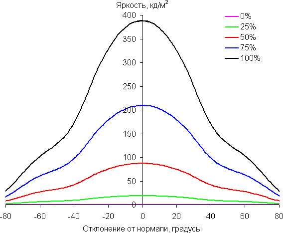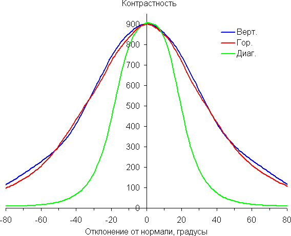 Отметим плавное уменьшение яркости при отклонении от перпендикуляра к экрану в горизонтальном направлении, при этом графики не пересекаются во всем диапазоне измеряемых углов. Чуть быстрее падает яркость при отклонении в вертикальном направлении. При отклонении в диагональном направлении поведение яркости оттенков имеет промежуточный характер между вертикальным и горизонтальным направлениями, за исключением яркости черного поля, которая начинает резко возрастать уже при 20°-30° отклонения от перпендикуляра к экрану. Контрастность в диапазоне углов ±82° приближается к отметке 10:1 только при отклонении по диагонали, и при отклонении к одному углу (из двух протестированных) опускается ниже на отметке 74°.