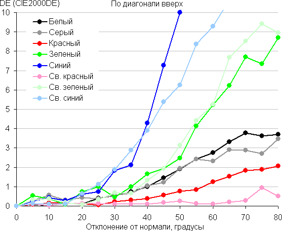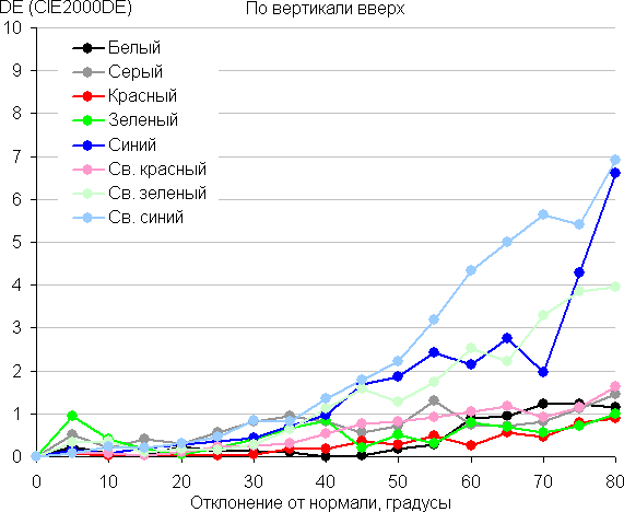 Для количественной характеристики изменения цветопередачи мы провели колориметрические измерения для белого, серого (127, 127, 127), красного, зеленого и синего, а также светло-красного, светло-зеленого и светло-синего полей во весь экран с использованием установки, подобной той, что применялась в предыдущем тесте. Измерения проводились в диапазоне углов от 0° (датчик направлен перпендикулярно к экрану) до 80° с шагом в 5°. Полученные значения интенсивностей были пересчитаны в ΔE относительно замера каждого поля при перпендикулярном положении датчика относительно экрана. Результаты представлены ниже: