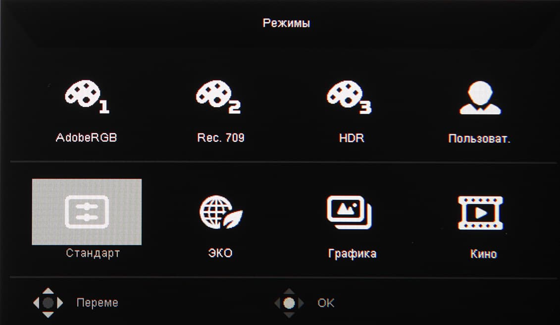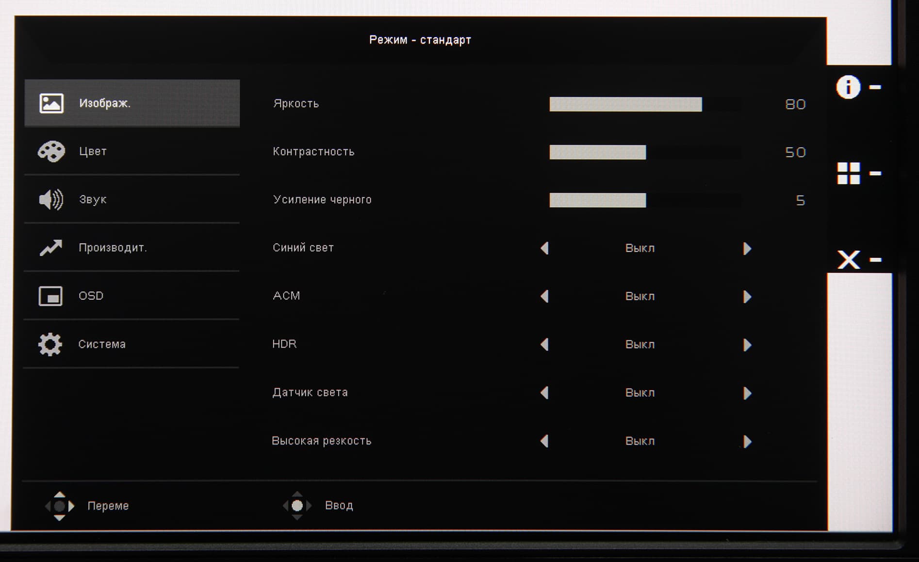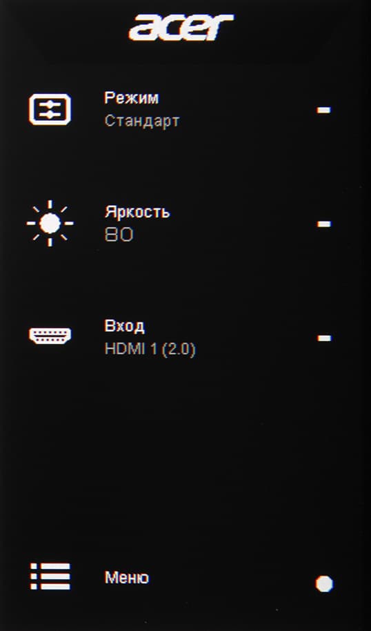 Индикатор питания при работе неярко светится синим (яркость регулируется в меню), в режиме ожидания — оранжевым и не горит, если монитор условно выключен. Когда монитор включен и на экране нет меню, то при первом нажатии на кнопки (кроме кнопки питания) на экран выводится стартовое меню из четырех пунктов.