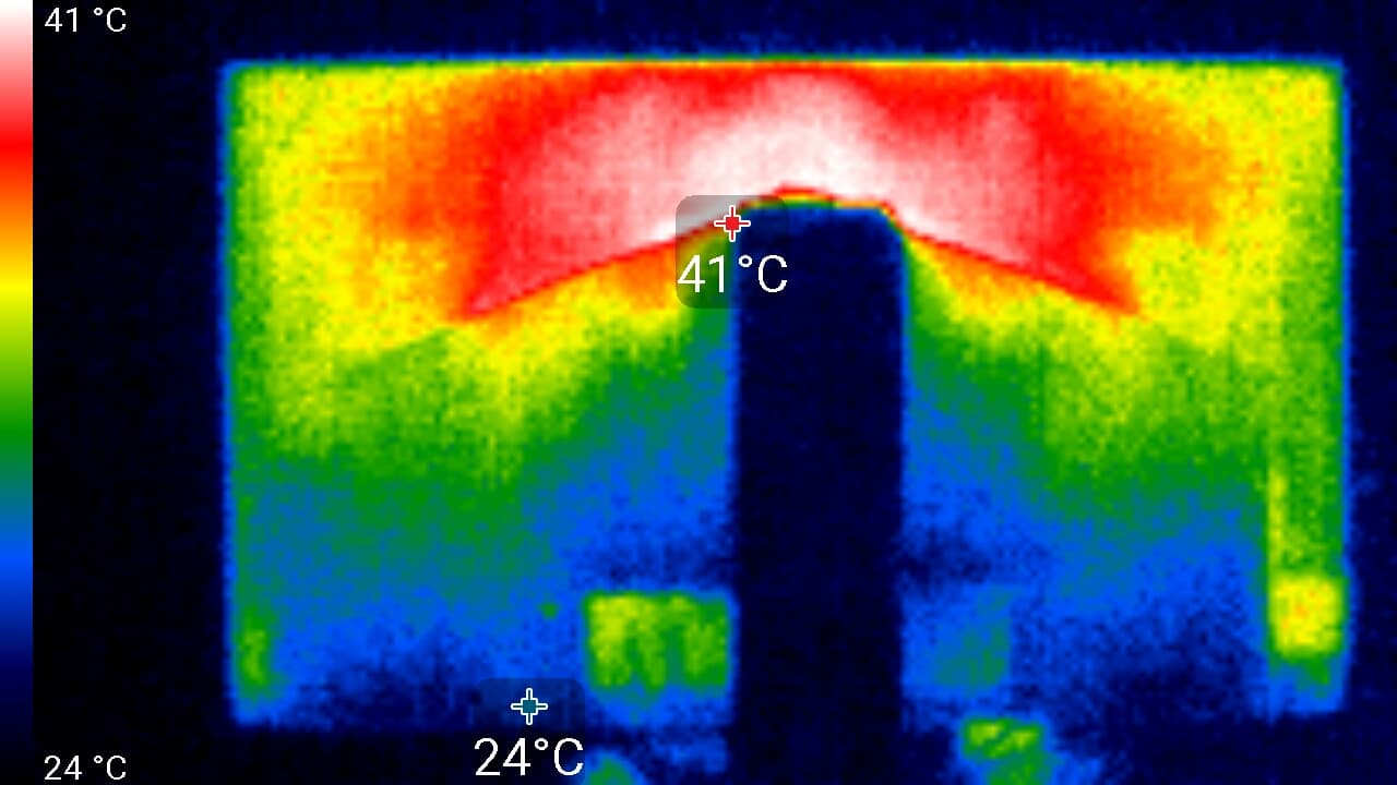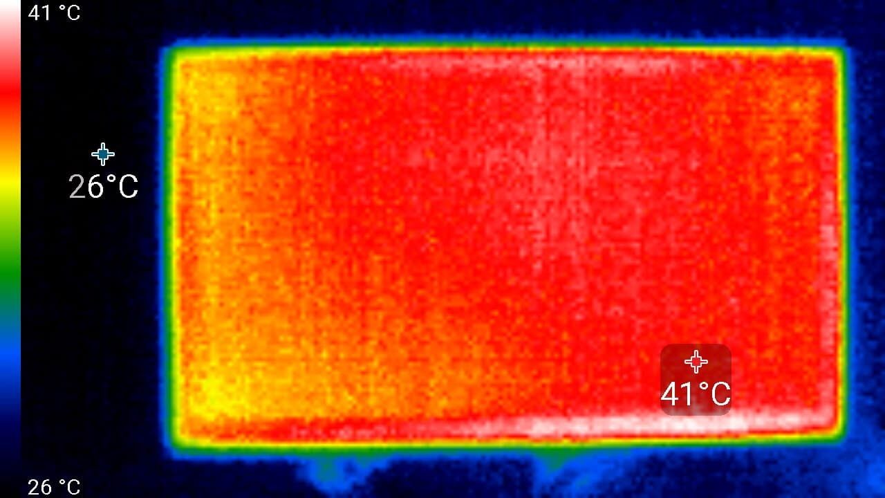Спереди нагрев выше в нижней части экрана, но все же он достаточно равномерный, чтобы можно было предположить наличие задней прямой подсветки.