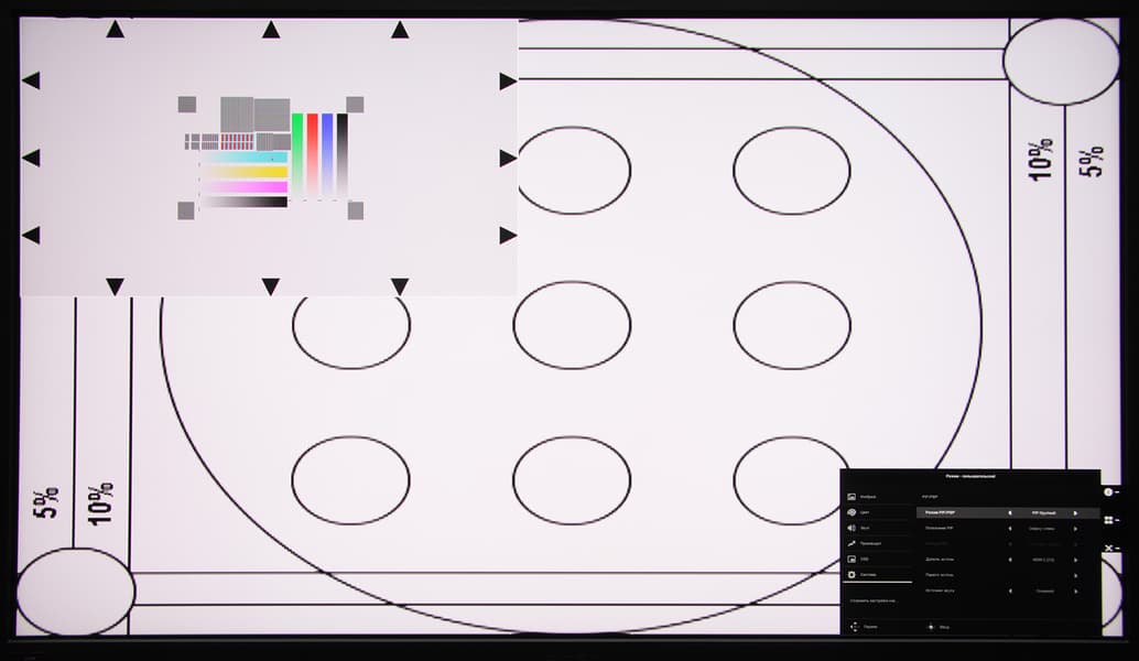Воспроизведение тестовых видеороликов с 10-битным цветом и плавными градиентами показало, что с большой вероятностью вывод действительно идет в режиме с глубиной на цвет выше, чем 8 бит. По крайней мере, заметность переходов между оттенками существенно ниже, чем при 8-битном выводе. Функция смешения цветов в настройках видеорендерера была, разумеется, отключена. Вывод в HDR точно возможен при подключении по HDMI, и не возможен по DisplayPort, вход USB-C не проверялся. В режиме HDR при выводе светлого изображения яркость подсветки динамически повышается, например, на белом поле почти во весь экран потребление от сети возрастает до 78,1 Вт. Также для локального управления яркостью используется ЖК-матрица: на обычном белом пропускание ЖК-матрицы снижено, а на ярком белом повышено. В итоге максимальная зафиксированная нами статическая яркость достигла 608 кд/м², и, возможно, в динамике яркость может повышаться и до большей величины. Напомним, что для режима HDR заявлена пиковая яркость в 1000 кд/м². Таким образом, данный монитор имеет полноценную поддержку HDR, так как сигнал HDR принимается и вывод осуществляется в режиме широкого цветового охвата (см. ниже), с повышенной битностью на цвет и с повышенной максимальной яркостью.