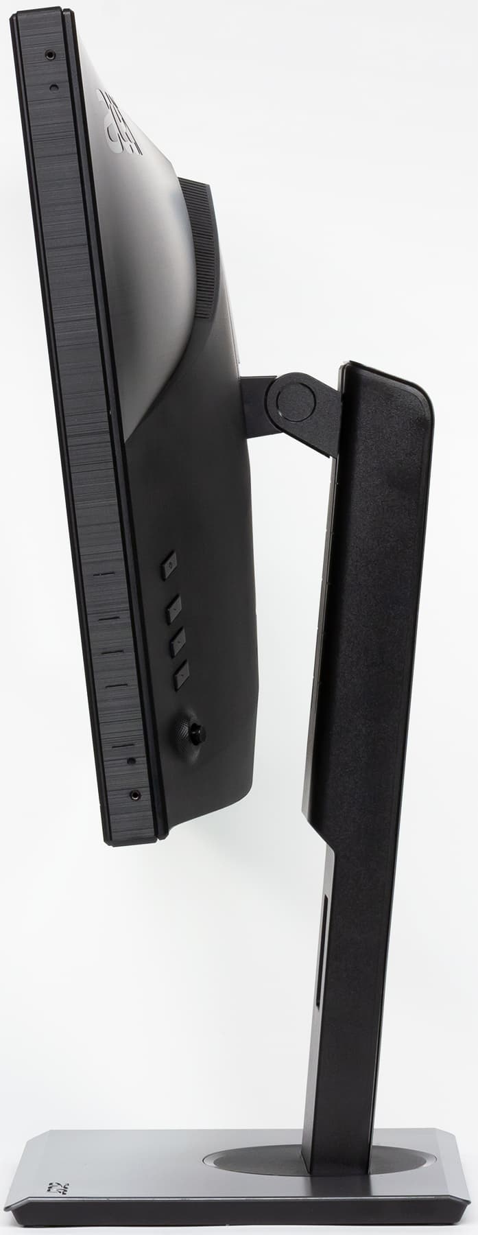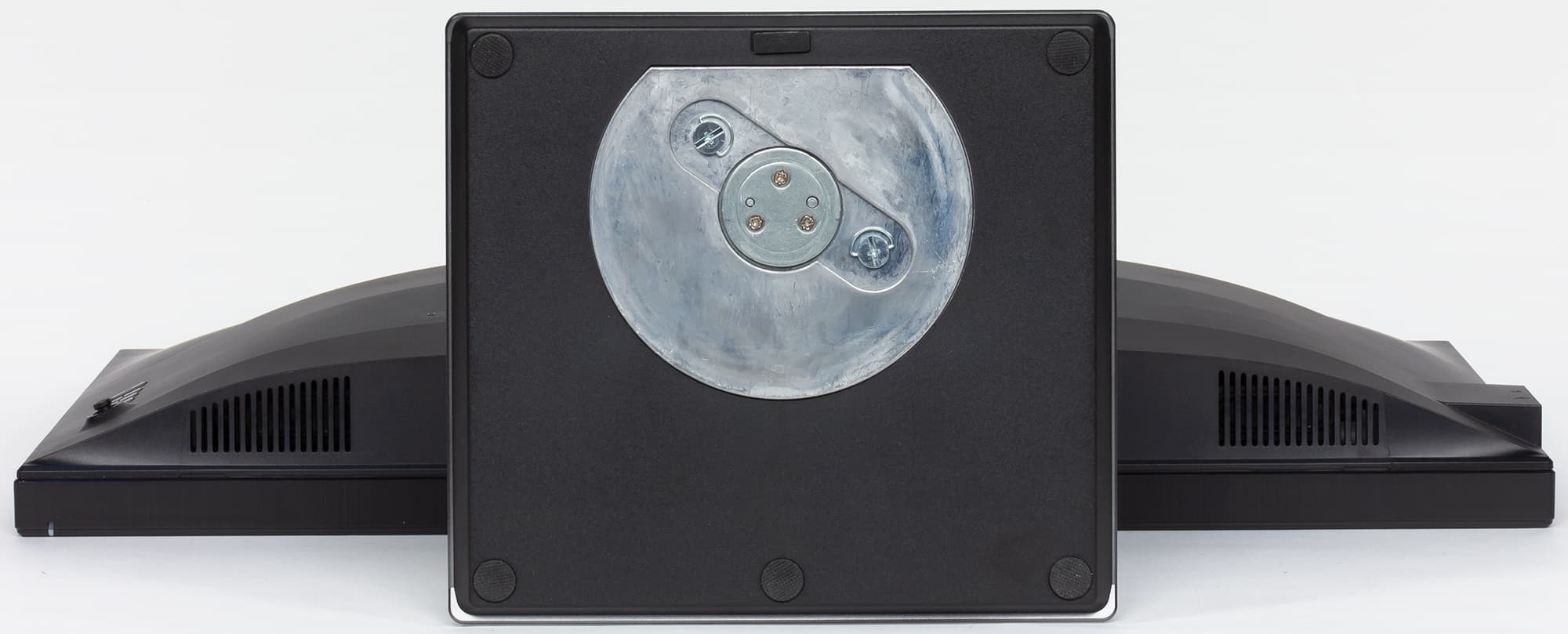 На шарнире в основании стойки блок экрана вместе со стойкой поворачивается вправо-влево. Несущие элементы стойки и основания подставки изготовлены из штампованной стали и отлиты из магний-алюминиевого сплава. Снизу на основание подставки наклеены резиновые площадки, благодаря чему монитор фиксируется на гладких поверхностях и не царапает их при перемещении. Конструкция подставки жесткая. Стоит монитор устойчиво. Плоская горизонтальная поверхность основания подставки позволяет что-то на ней хранить. При необходимости подставку можно отсоединить от блока экрана, снять декоративные пластиковые щитки, прикрутить винтами адаптер с резьбовыми отверстиями по углам квадрата со стороной 100 мм и закрепить монитор на VESA-совместимом кронштейне.