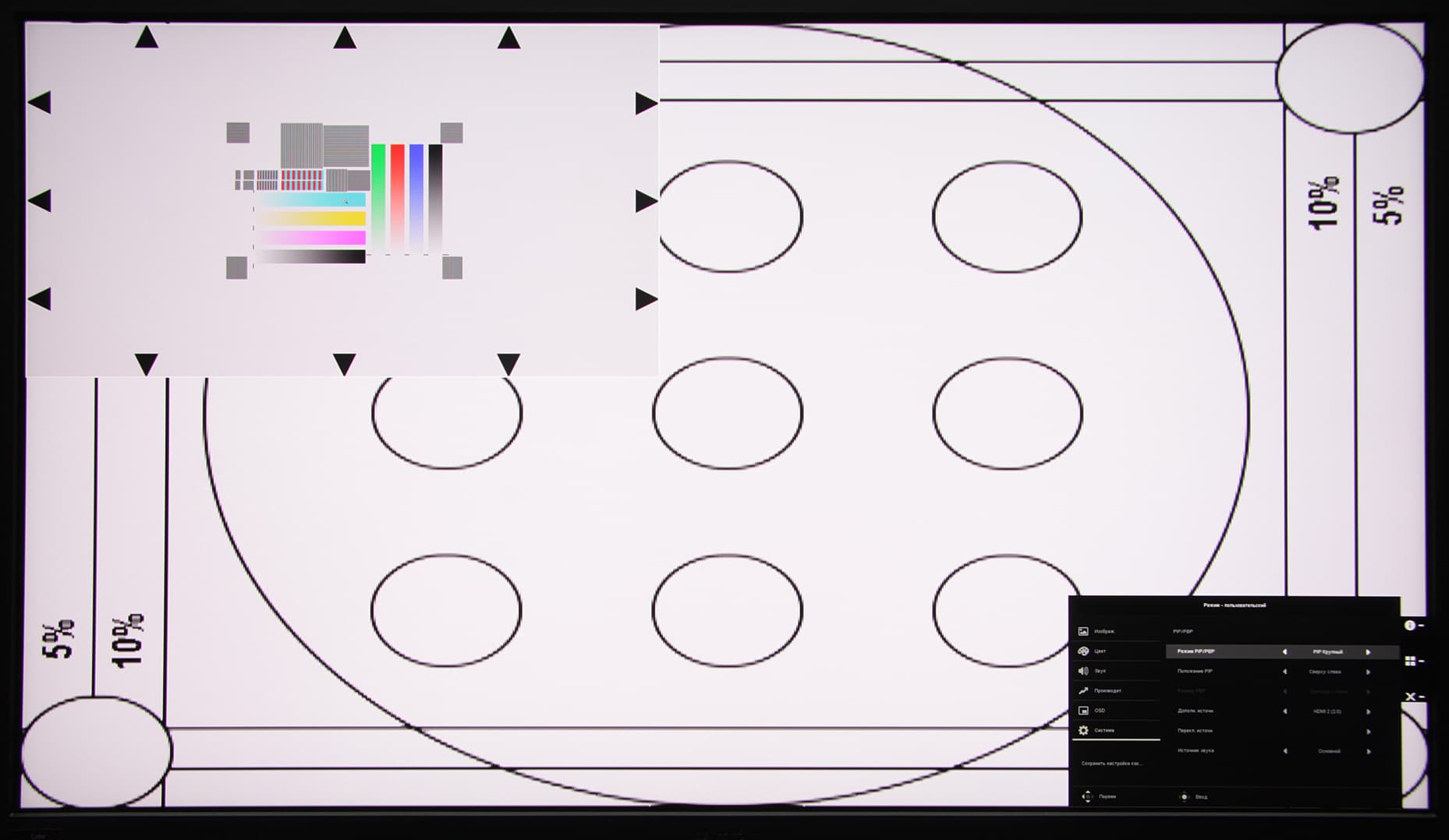Присутствуют функции картинка-в-картинке (PIP) и картинка-рядом-с-картинкой (PBP). В режиме PIP выбирается положение дополнительного окна в одном из четырех углов, а также его размер из двух возможных (но ни в одном мы не получили вывод пиксель в пиксель для дополнительного окна).