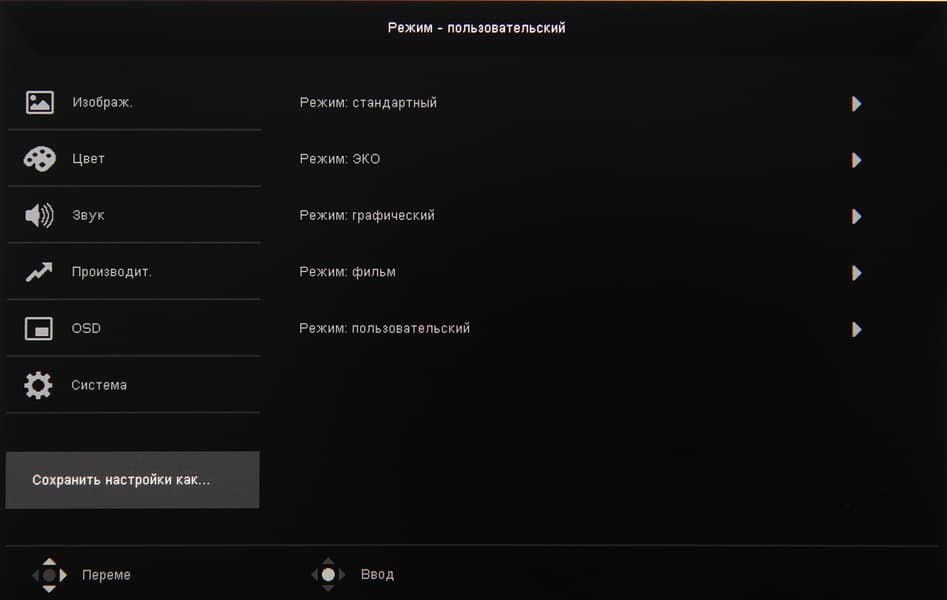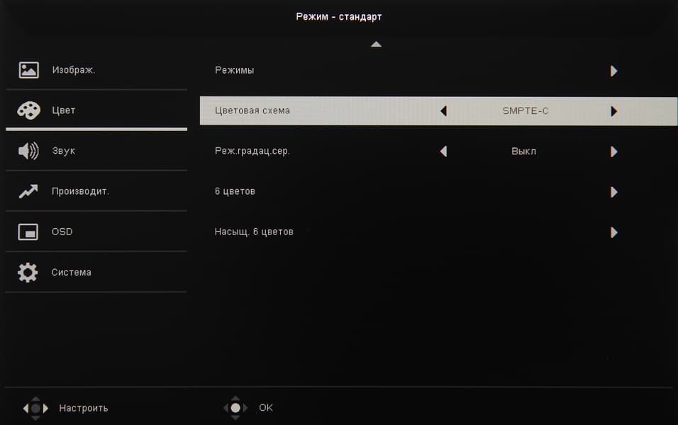 Есть несколько предустановленных профилей (списки Режимы и Цветовая схема).
