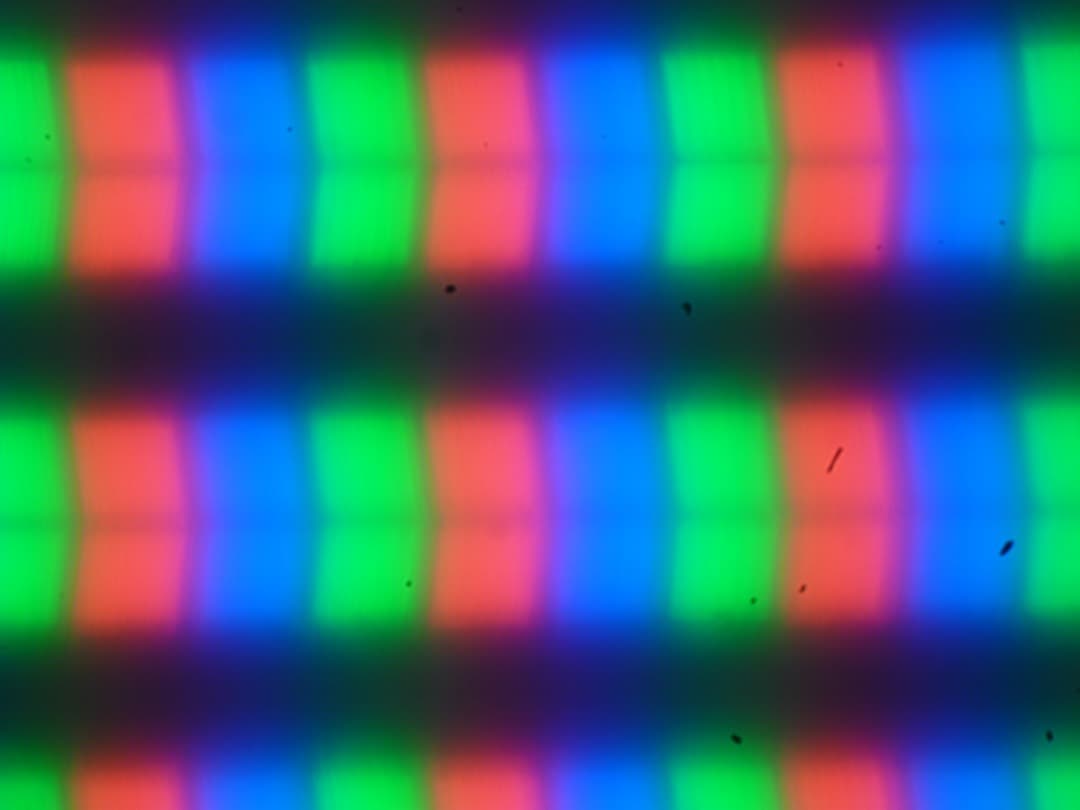 Четкое изображение структуры пикселей из-за матовой поверхности получить не удается, впрочем, при желании на фрагменте ниже можно разглядеть типичную для IPS структуру в виде параллельных полосок, а также, что каждый субпиксель делится на два примерно равных домена (черные точки — это пыль на матрице фотоаппарата):