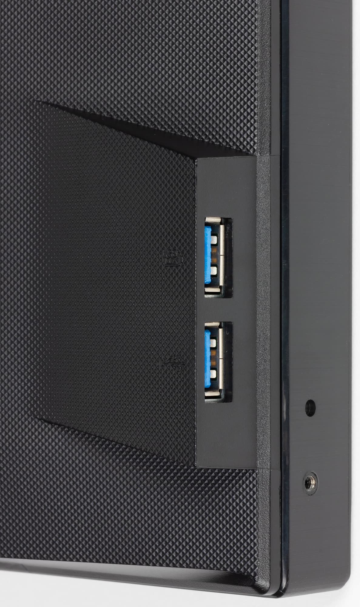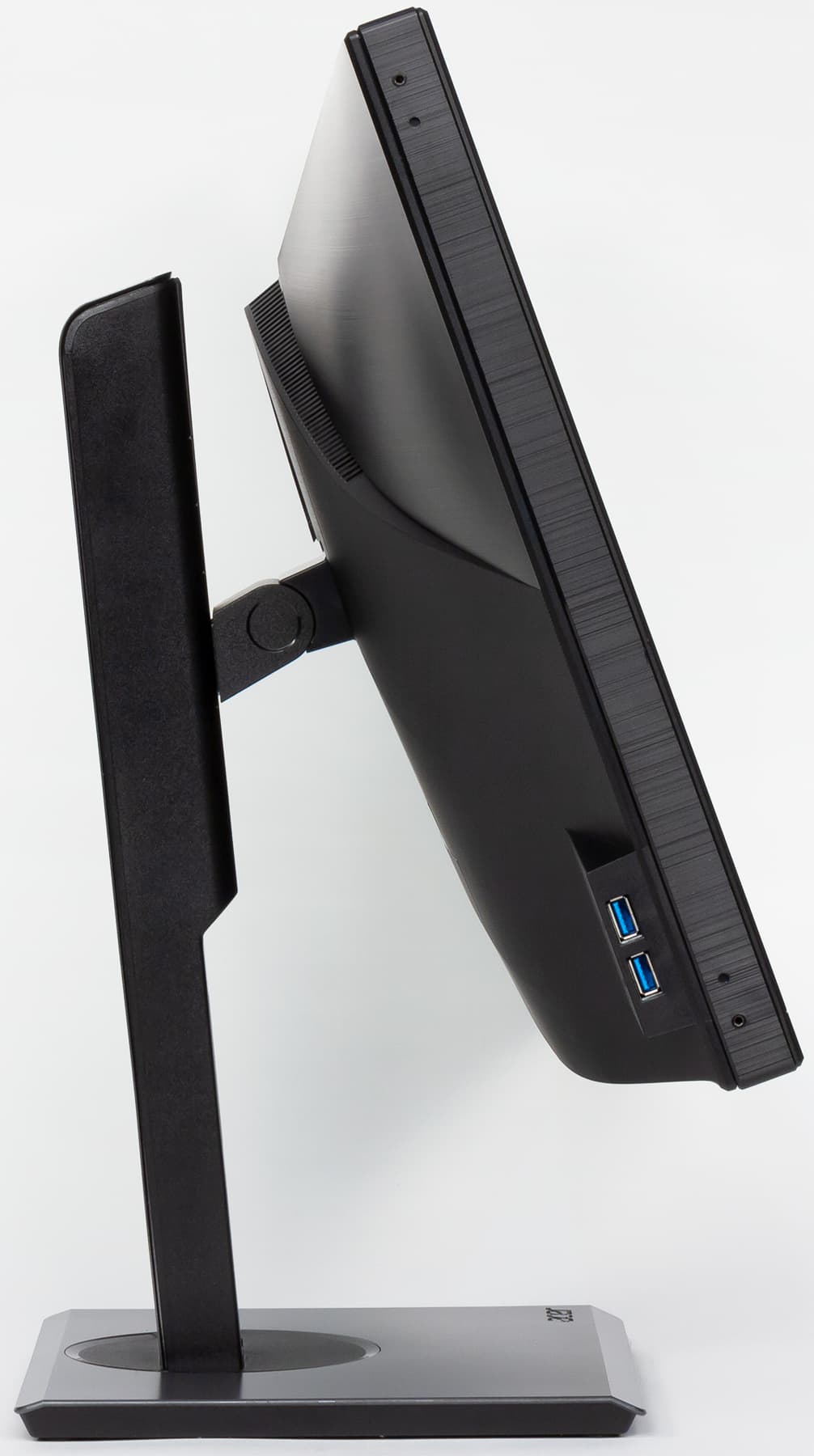 Разъем питания и большая часть интерфейсных разъемов расположены в нише сзади и ориентированы вниз. Эту нишу можно закрыть декоративным щитком: так сзади монитор выглядит аккуратнее. Рядом с нишей есть разъем для кенсингтонского замка. Два из четырех выходных USB-портов концентратора вынесены на левый торец блока экрана. Отходящие кабели можно пропустить через прямоугольное отверстие в стойке.