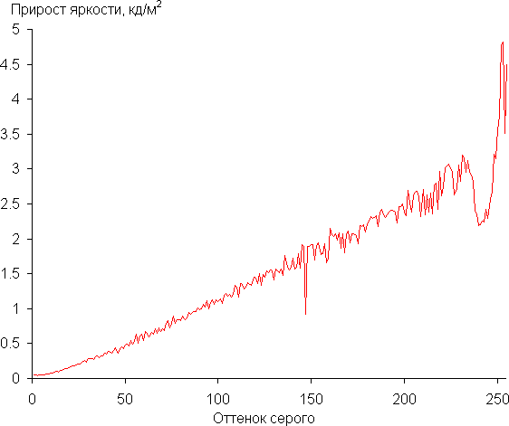 Реальная гамма-кривая ближе всего к стандартной при выборе Гамма = 2.2, поэтому далее мы измерили яркость 256 оттенков серого (от 0, 0, 0 до 255, 255, 255) при этом значении. График ниже показывает прирост (не абсолютное значение!) яркости между соседними полутонами: