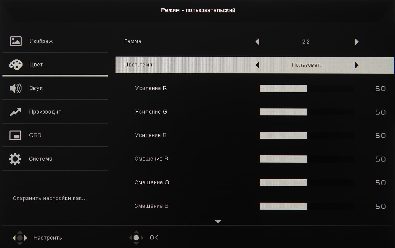 Настроек, влияющих на яркостный и цветовой баланс, относительно много. Значения настроек можно сохранить в некоторых профилях.