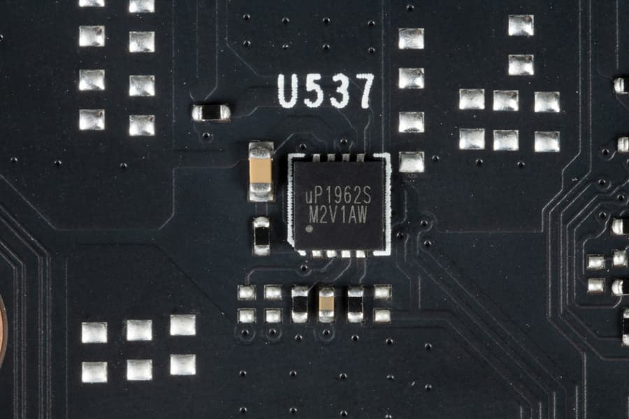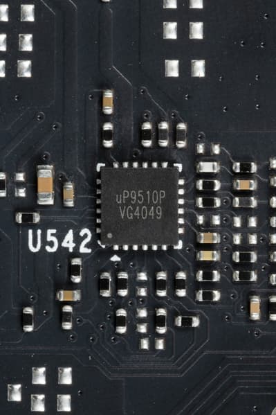 Зеленым цветом отмечена схема питания ядра, красным — памяти. Для управления схемой питания GPU используется ШИМ-контроллер uP9510P (uPI Semiconductor), рассчитанный максимум на 4 фазы.