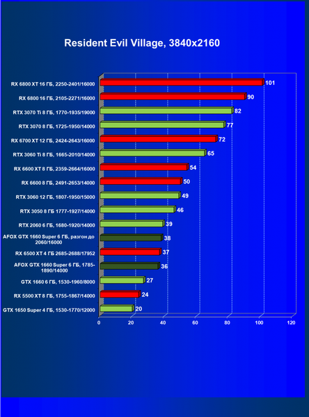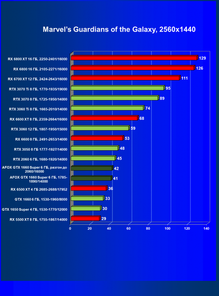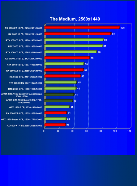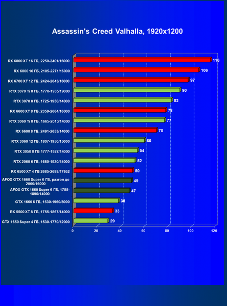 | 16 | RX 5500 XT 8 ГБ, 1755—1867/14000 | 100 | 53 | 19 000 |
