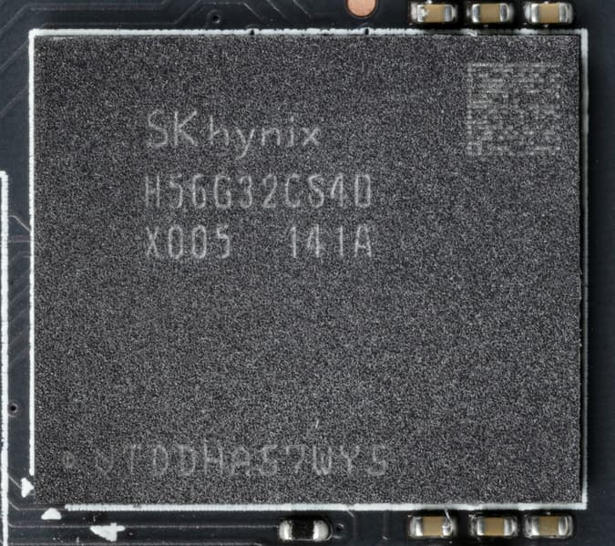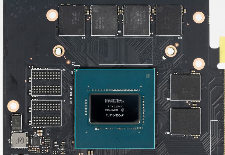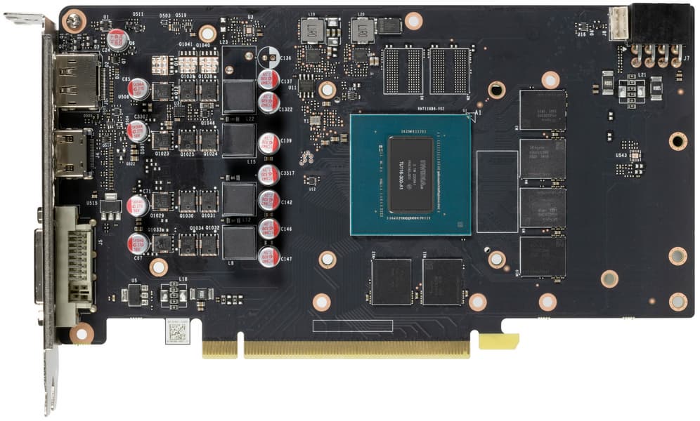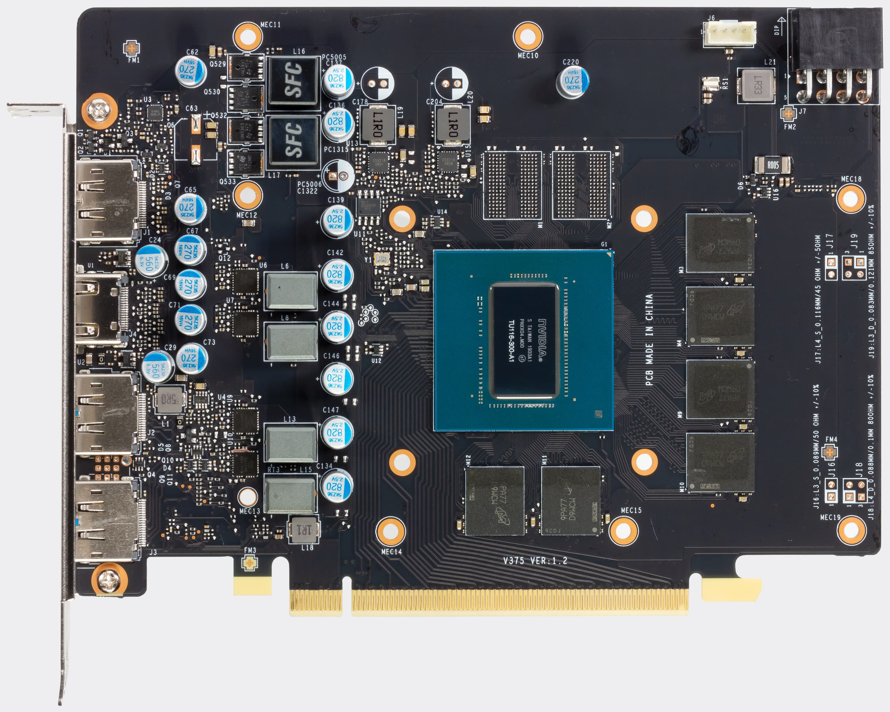 Карта имеет 6 ГБ памяти GDDR6 SDRAM, размещенной в 6 микросхемах по 8 Гбит на лицевой стороне PCB. Микросхемы памяти SK Hynix (GDDR6) рассчитаны на номинальную частоту работы в 3500 (14000) МГц.