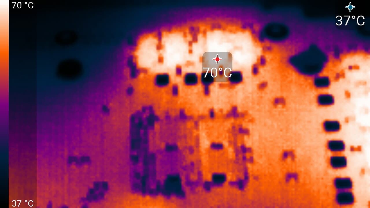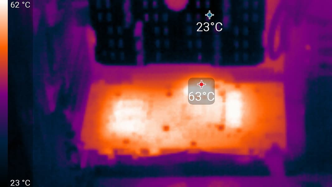 После 2-часового прогона под нагрузкой максимальная температура ядра не превысила 70 градусов, что является приемлемым результатом для видеокарт такого уровня. Максимальная мощность была зафиксирована на уровне 126 Вт, а максимальный нагрев наблюдался в районе преобразователей питания.