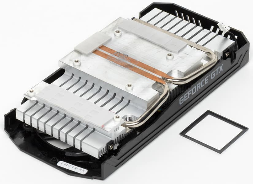 Основой СО является довольно простой пластинчатый алюминиевый радиатор с парой тепловых трубок, впрессованных в подошву прямого контакта с GPU и микросхемами памяти (с помощью термоинтерфейса). Этот же радиатор служит охладителем и для компонентов преобразователей питания VRM с помощью небольшой подошвы.