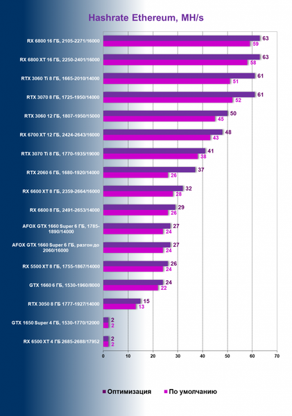 | 01 | Afox GTX 1660 Super 6 ГБ, разгон до 2060/16000 | 64 | 140 | 22 000 |