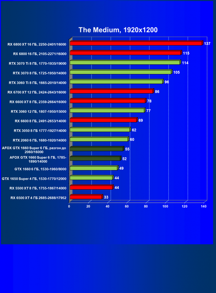 По скоростным показателям Nvidia GeForce GTX 1660 Super находится примерно на уровне AMD Radeon RX 6500 XT и чуть выше уровня Radeon RX 5500 XT 8 ГБ. Этот ускоритель подходит для достаточно комфортной игры при максимальных настройках качества в разрешениях до 1920×1080/1200 включительно. Правда, в ряде современных игр с особо тяжелой графикой все-таки придется несколько снизить настройки графики для Full HD. Видеокарта Afox в плане производительности находится на уровне референс-аналога.