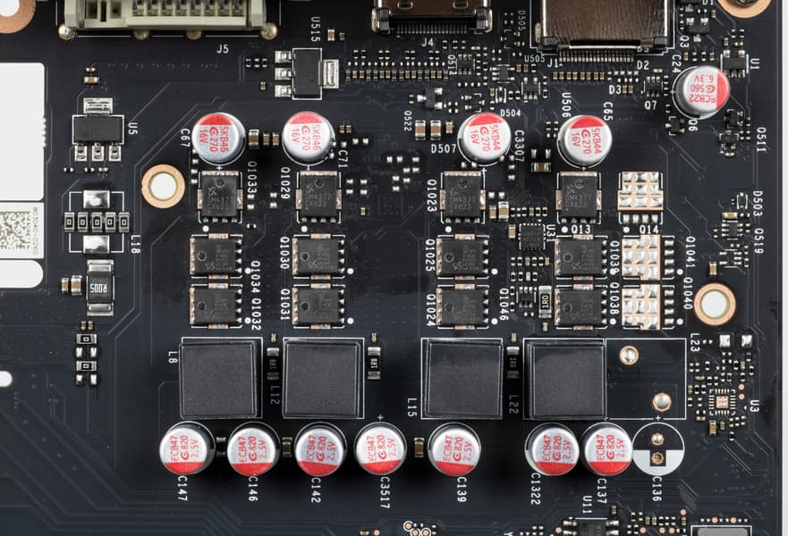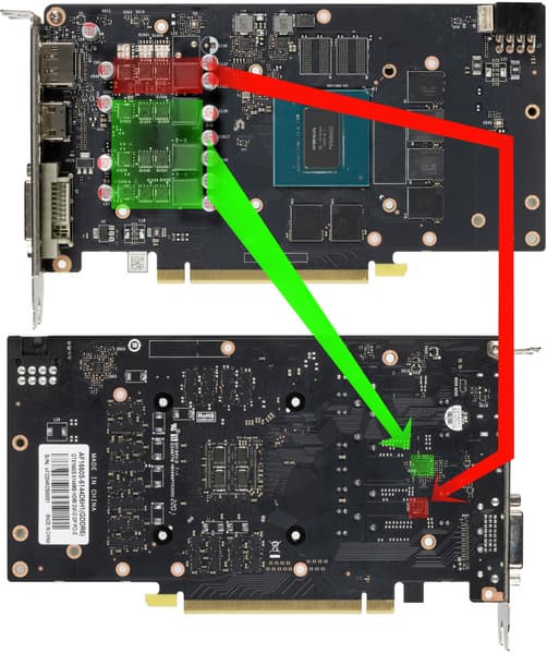 Прекрасно видно, что дизайн карт очень похож только в части расположения микросхем памяти вокруг GPU. Схемы питания отличаются, при этом в обоих случаях для питания достаточно одного 8-контактного разъема: в целом графический процессор с набором микросхем памяти потребляют не так уж много, а Nvidia не позволяет сильно повышать частоту работы (чтобы не было пересечения по производительности с более дорогими решениями).