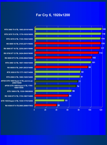 | 15 | RX 6500 XT 4 ГБ, 2685—2688/17952 | 100 | 53 | 19 000 |