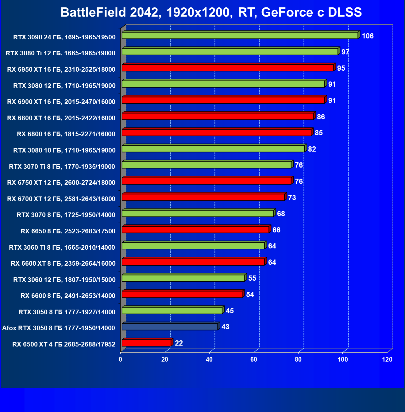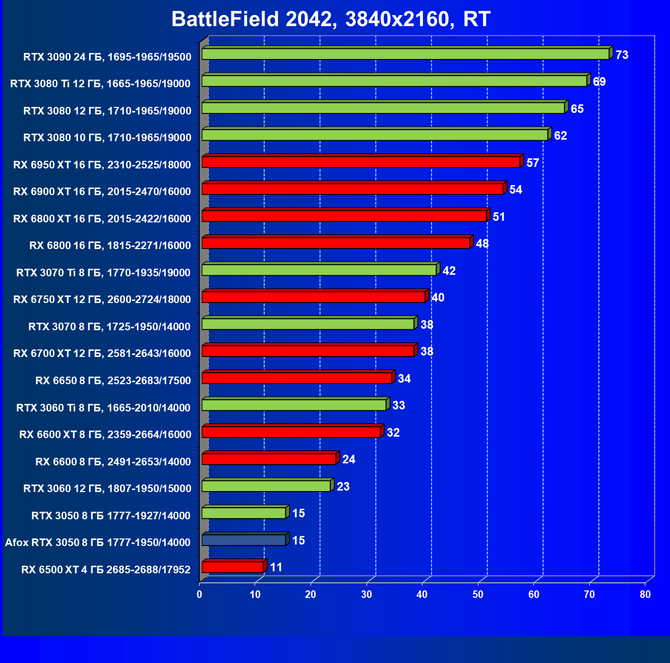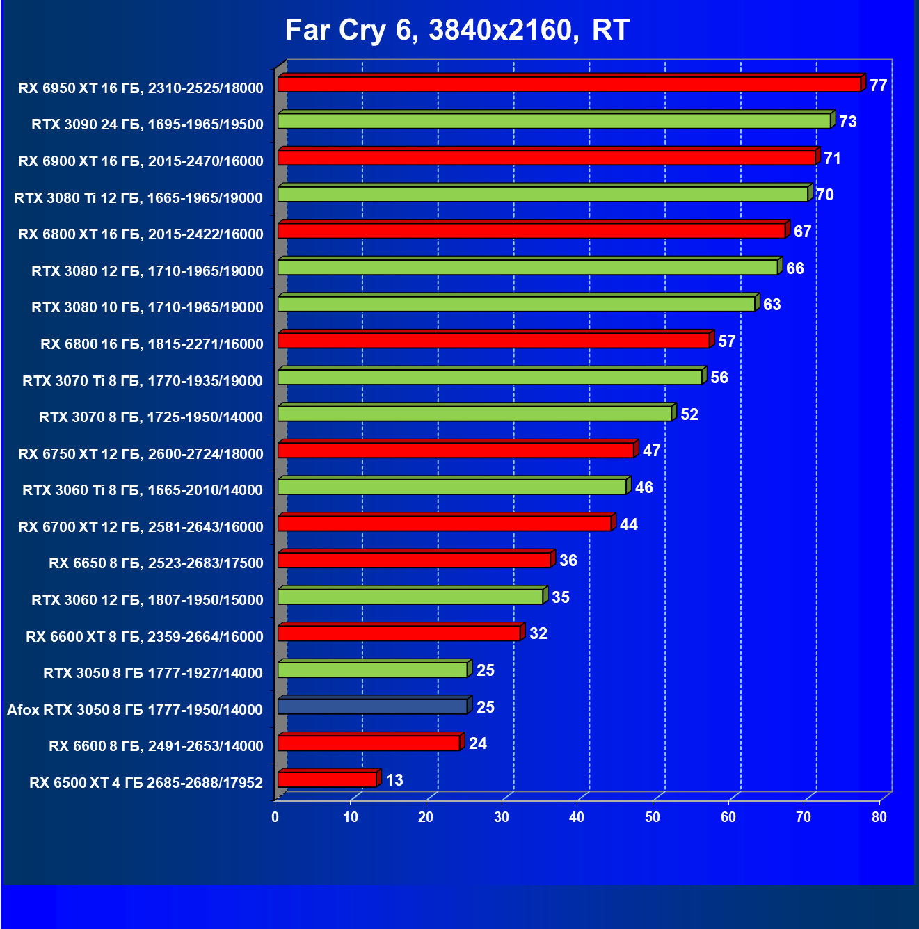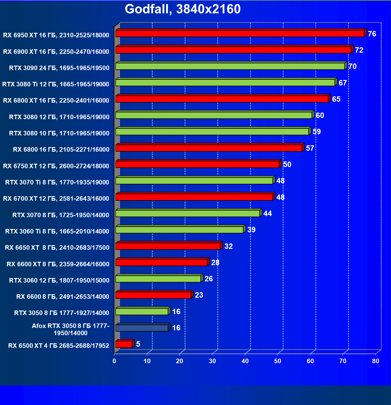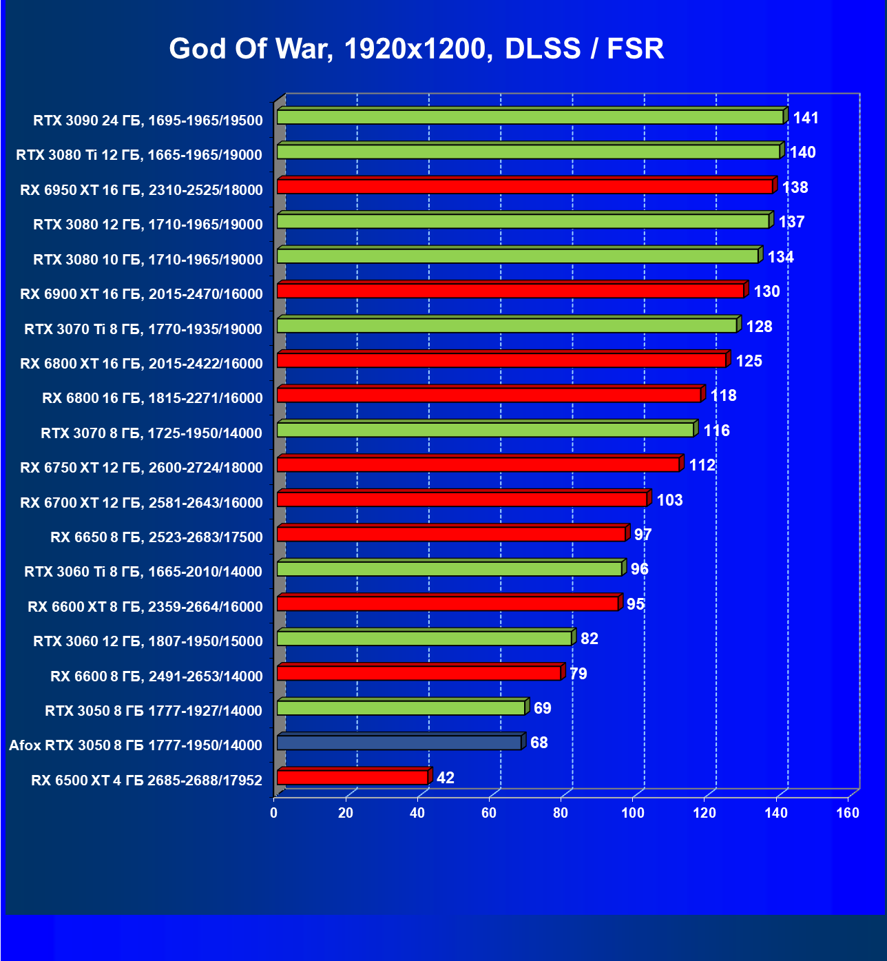 Рейтинг составлен по 9 тестам с применением технологии трассировки лучей (с Nvidia DLSS и с AMD FSR в играх God of War, The Medium и Far Cry 6).