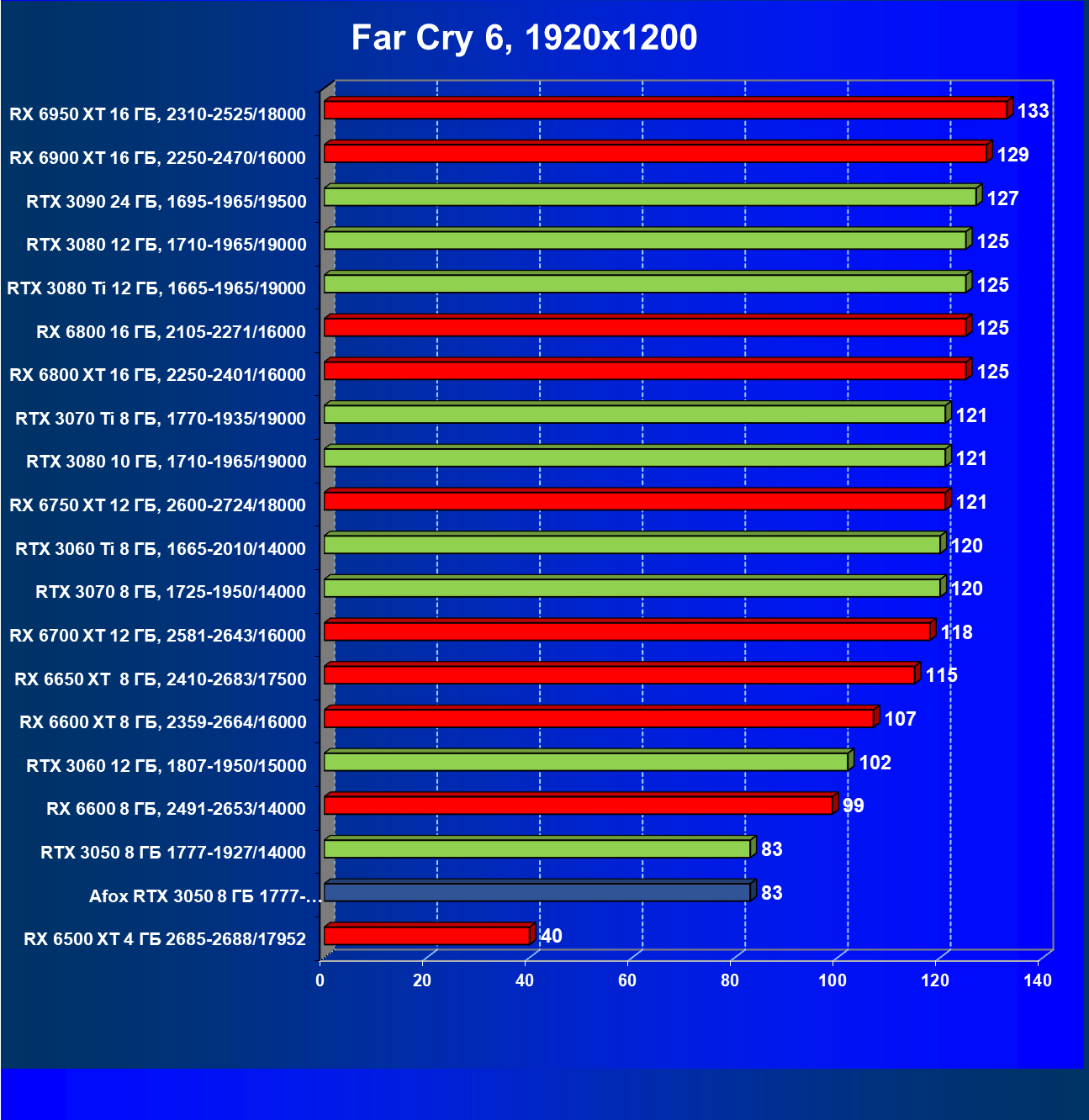 Наши тесты показали, что GeForce RTX 3050 хорошо подходит для многих «классических» игр без использования трассировки лучей в разрешении Full HD при условии максимального качества графики, однако в ряде игр FPS все же может быть низковат для 1920×1080, тогда придется снижать настройки качества графики. Ближайший конкурент из стана AMD — Radeon RX 6600, эта видеокарта немного шустрее и потянет уже все игры с растеризацией в Full HD без снижения настроек. Видеокарта Afox в плане производительности равна референс-аналогу.