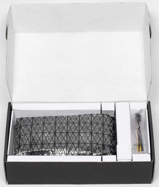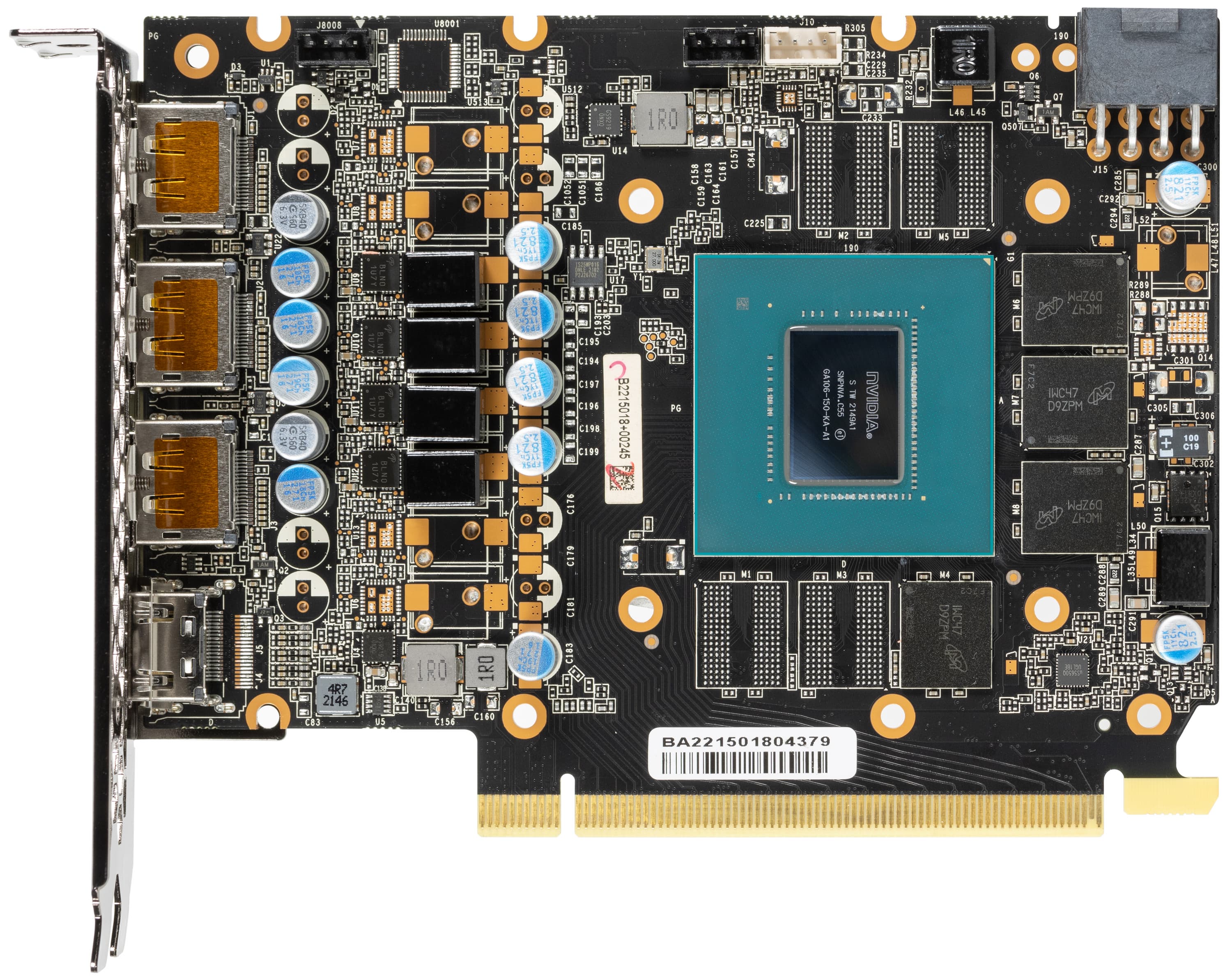Микросхемы памяти охлаждаются (через термопрокладки) тем же основным радиатором, что и GPU. Для охлаждения преобразователя питания VRM есть отдельная подошва на том же радиаторе. Задняя пластина служит элементом дизайна, защиты PCB и усиливает жесткость платы в целом.