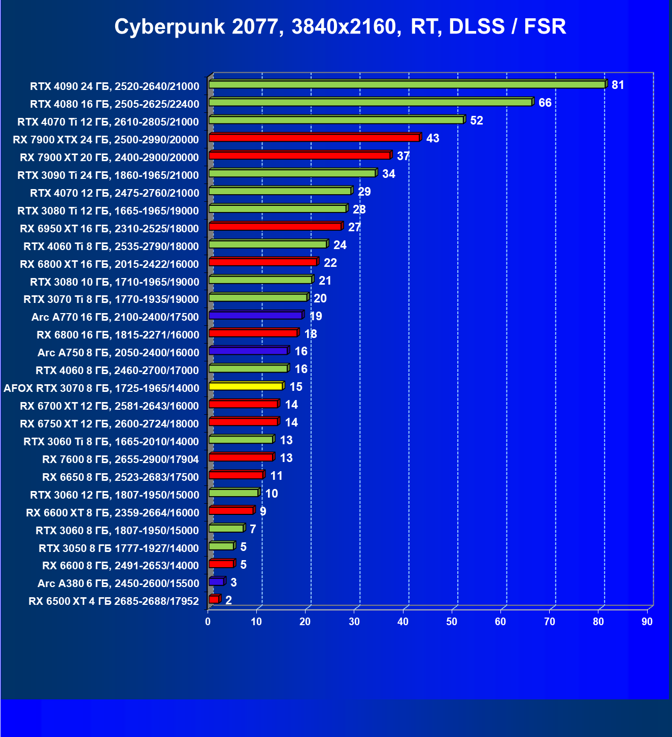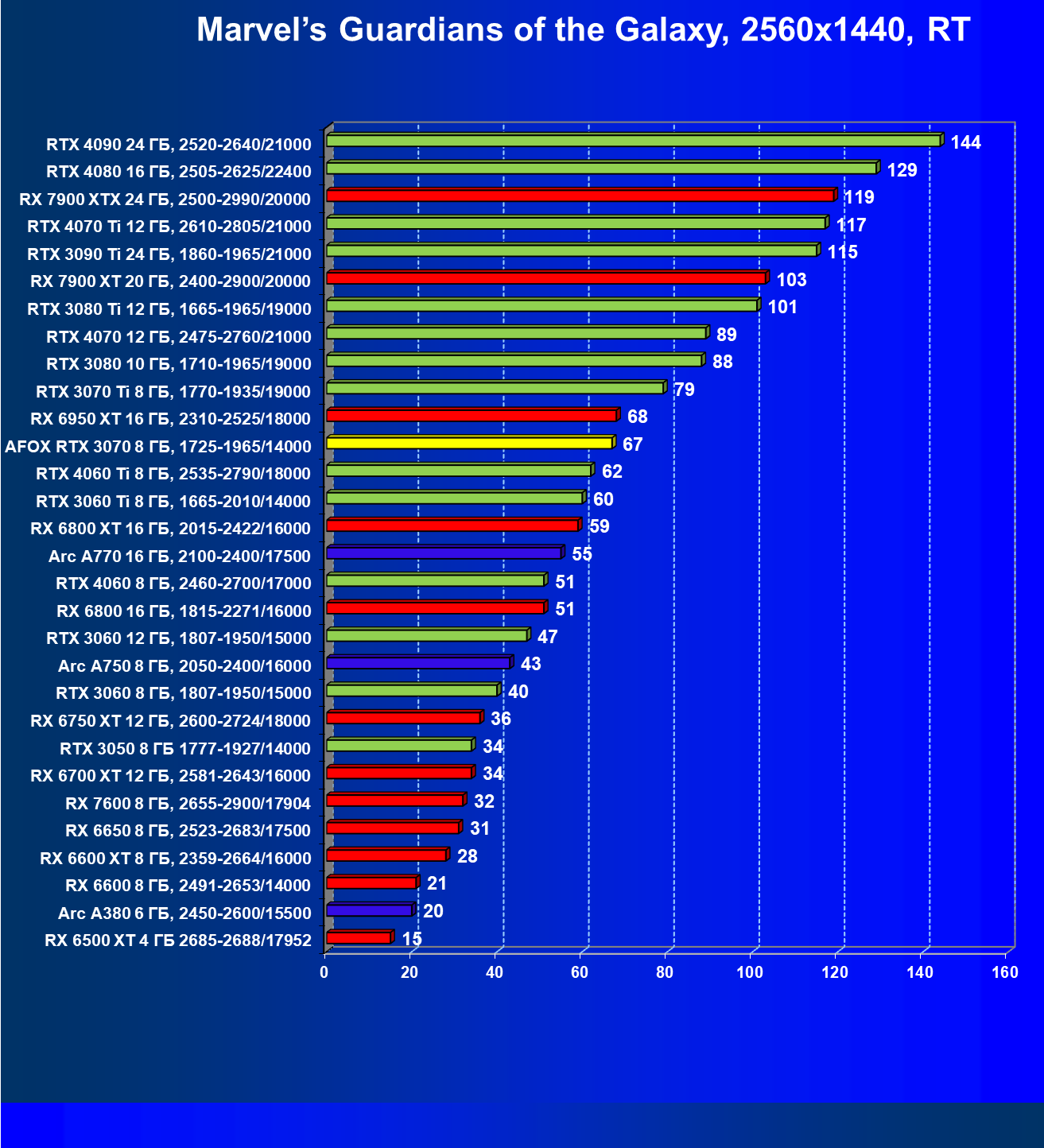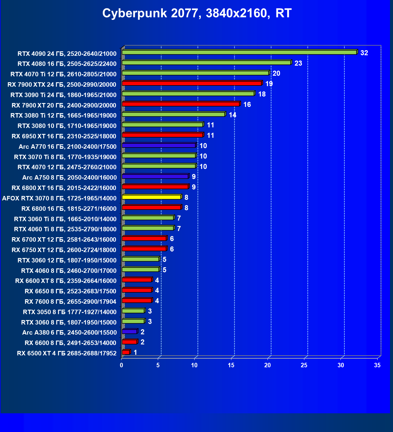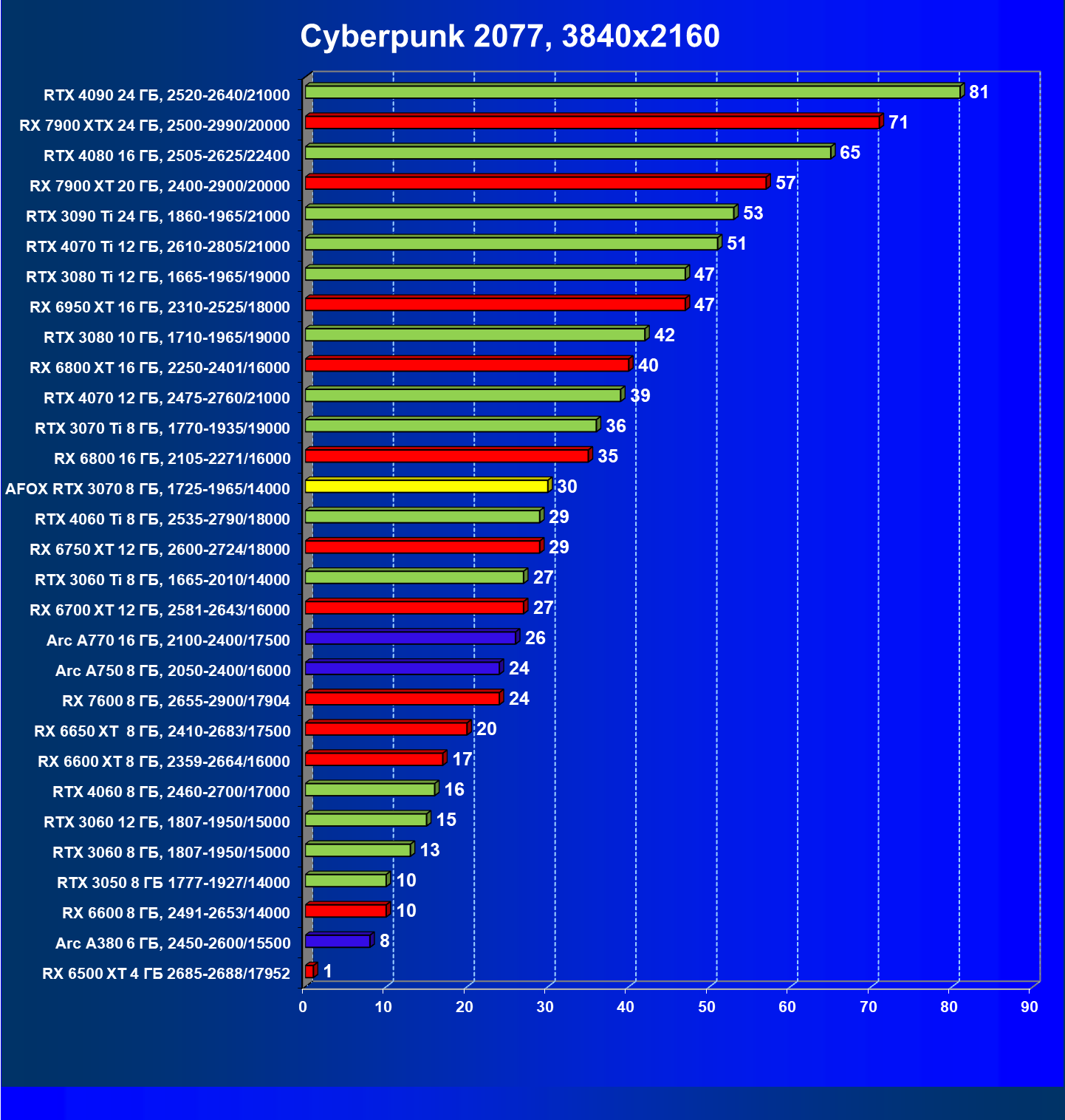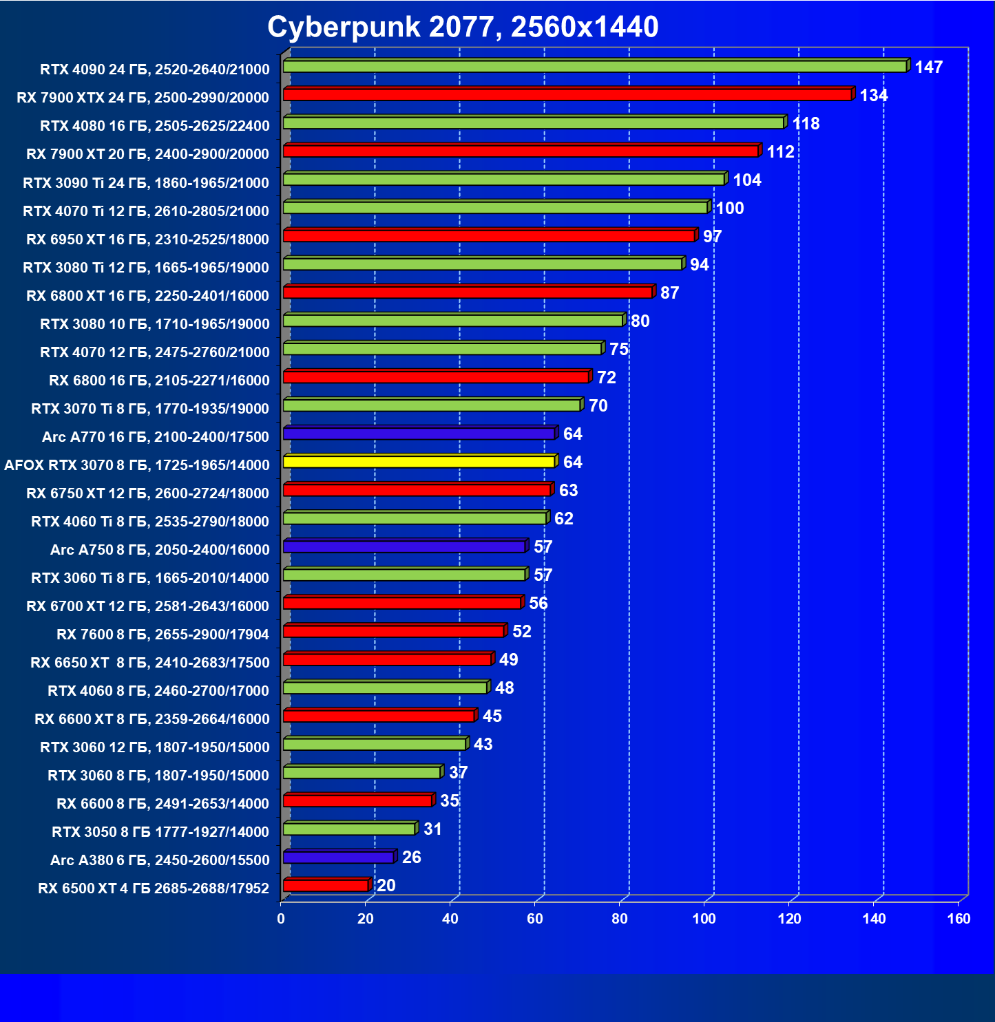 | 15 | Afox RTX 3070 8 ГБ, 1725—1965/14000 | 518 | 144 | 36 000 |