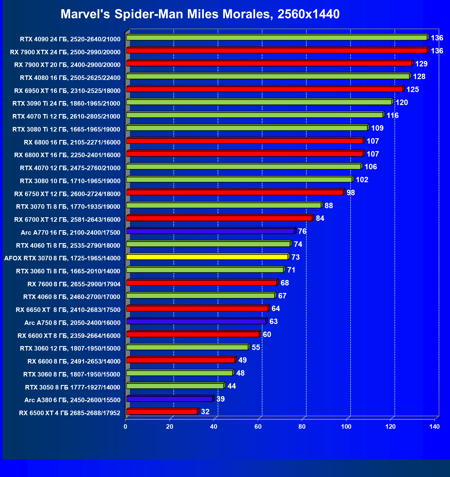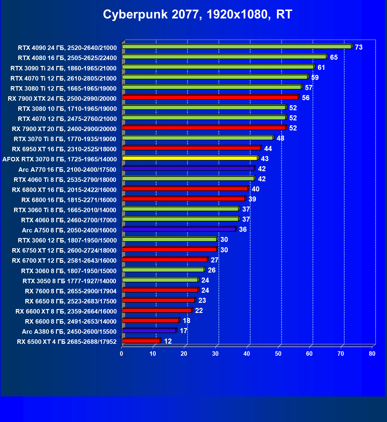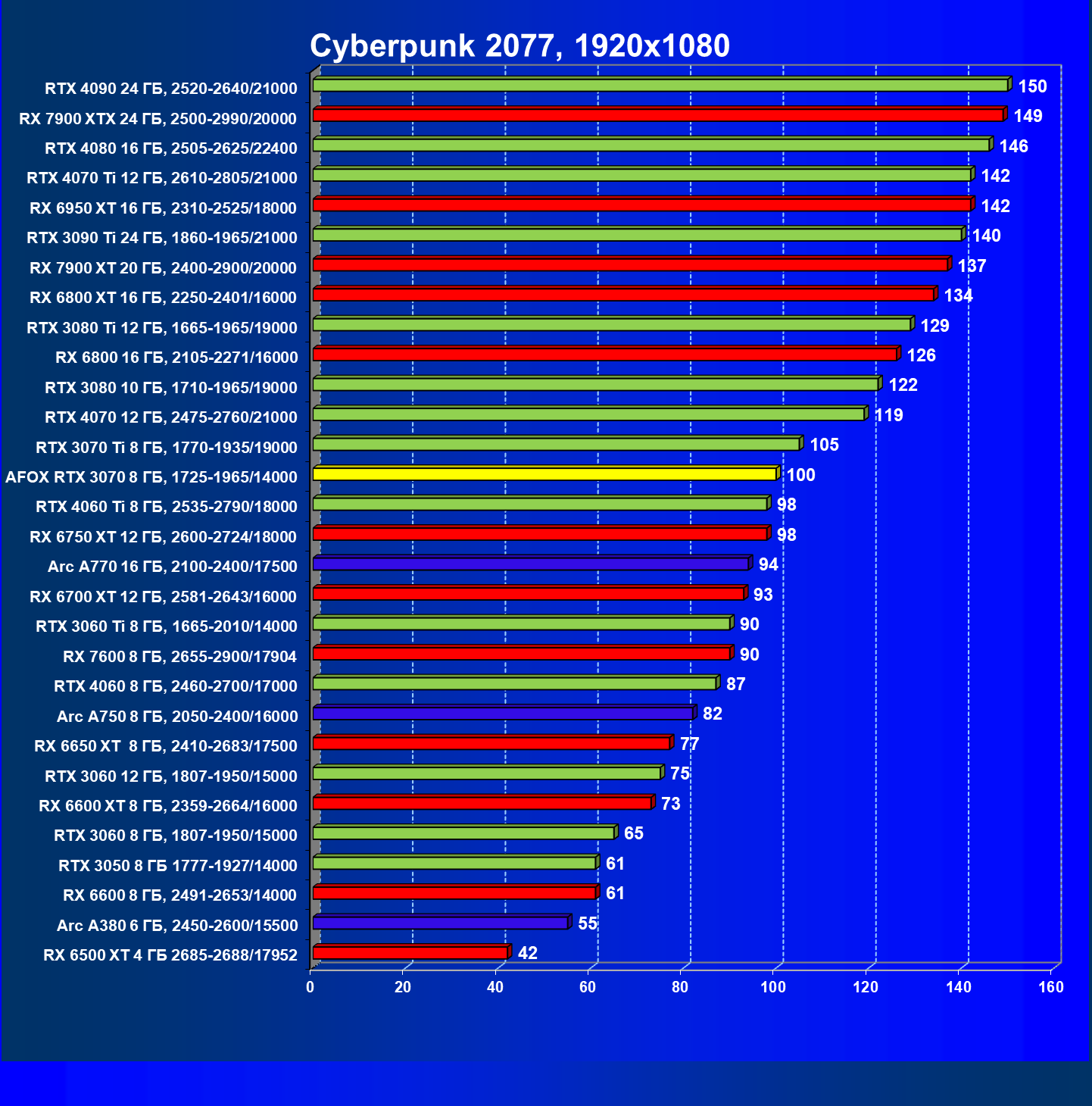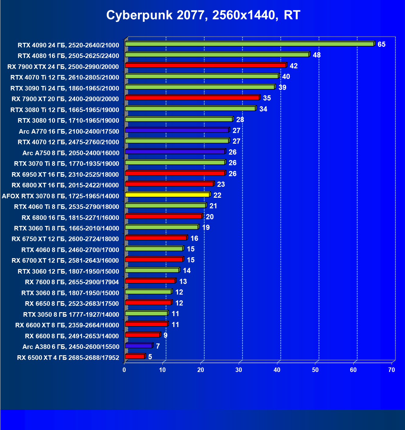 | 15 | Afox RTX 3070 8 ГБ, 1725—1965/14000 | 518 | 144 | 36 000 |