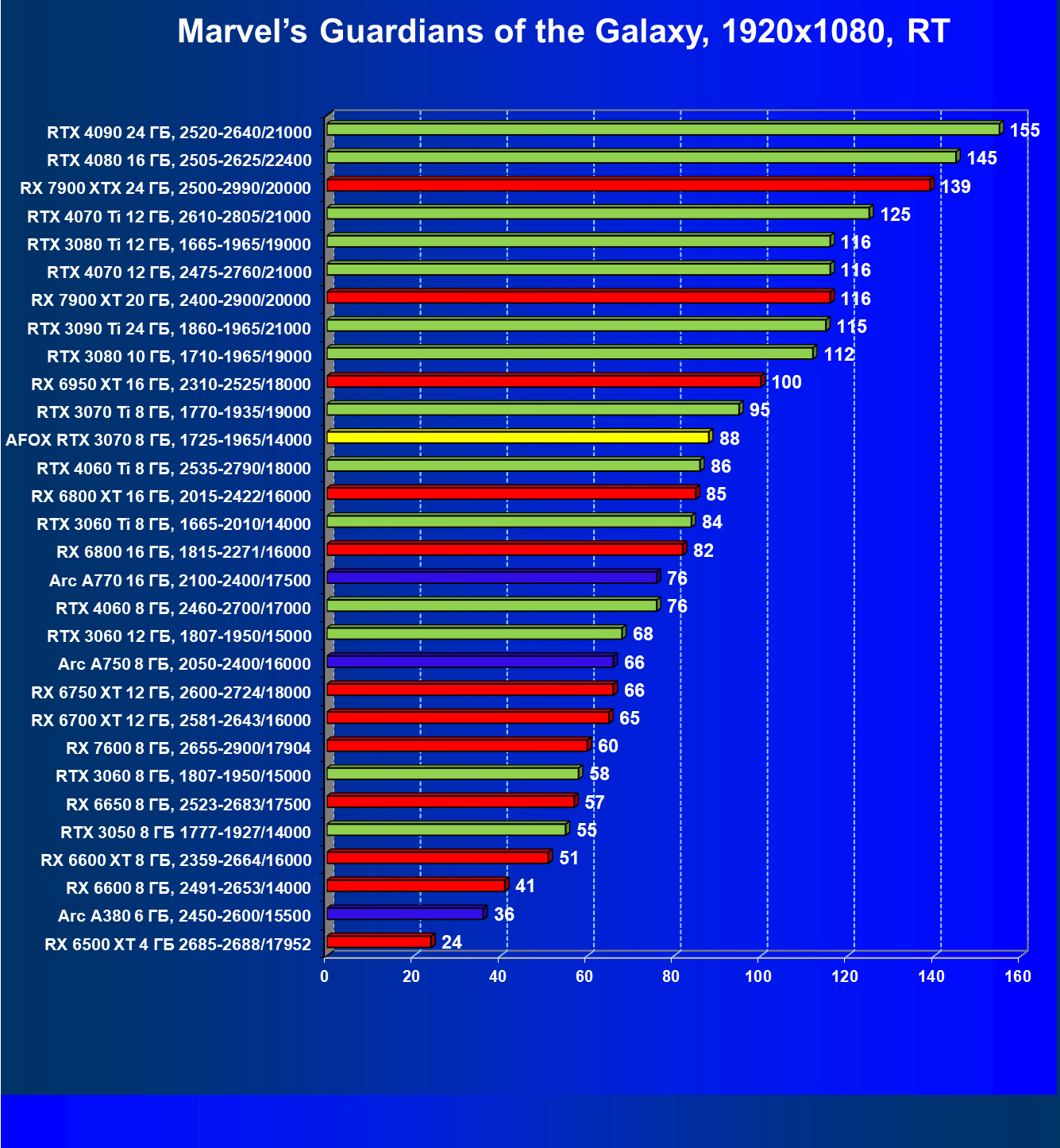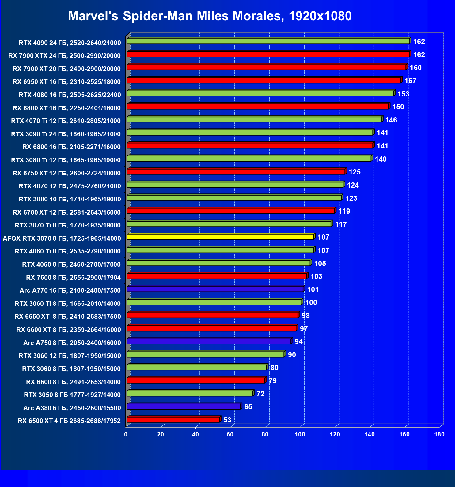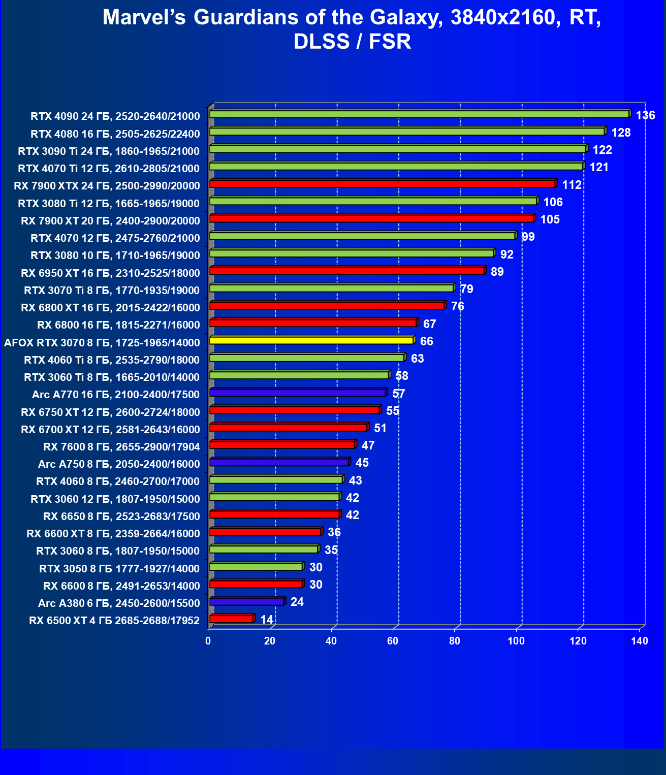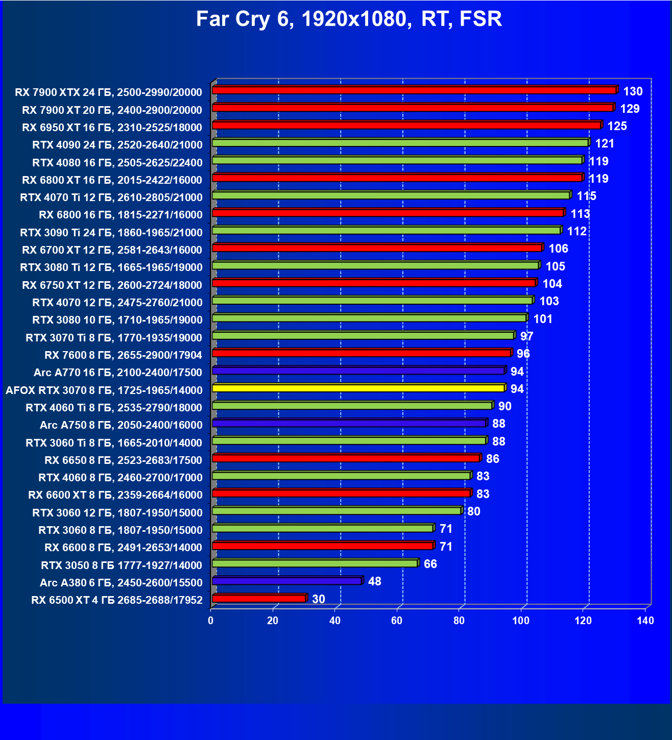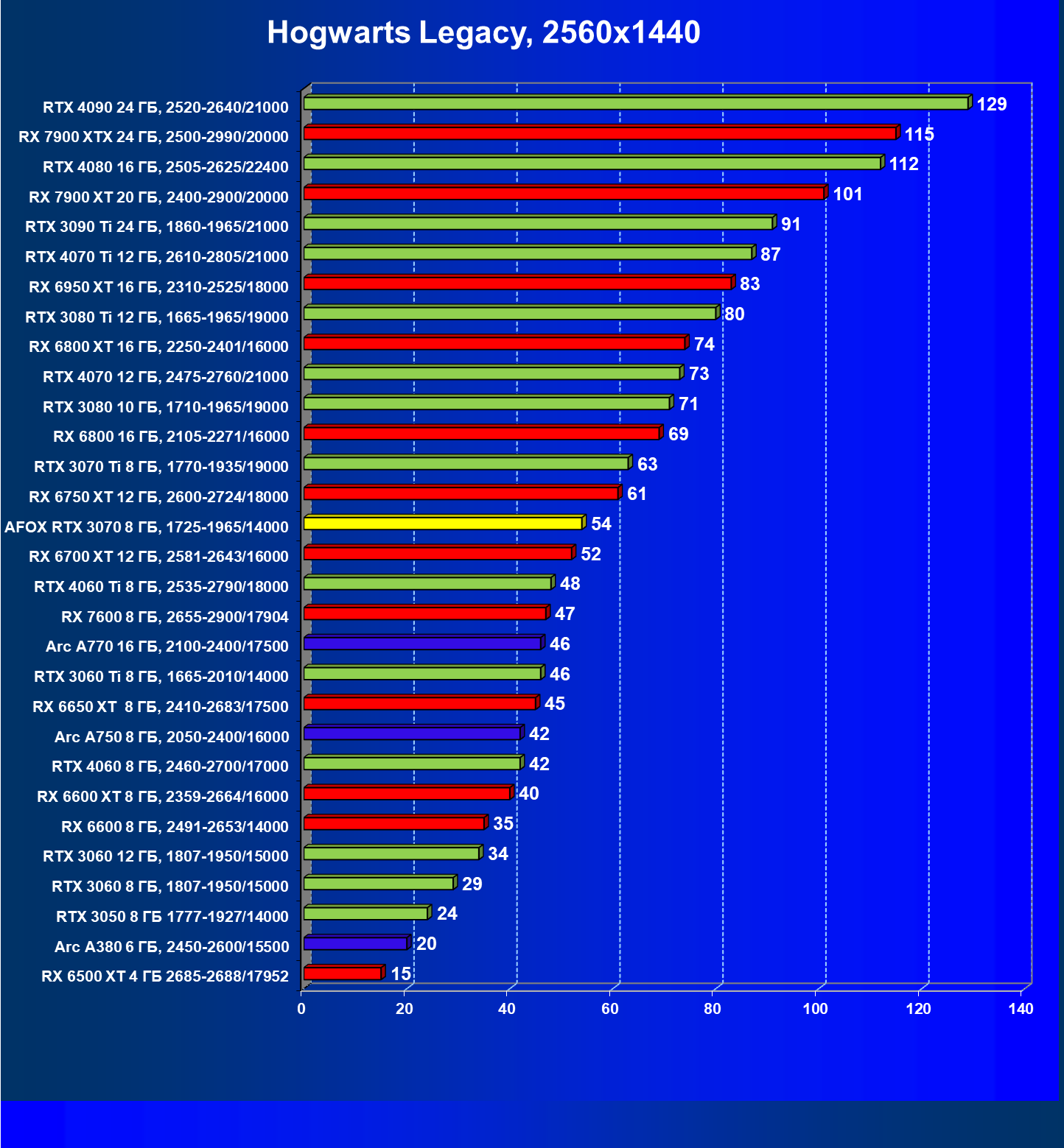 | 15 | Afox RTX 3070 8 ГБ, 1725—1965/14000 | 518 | 144 | 36 000 |