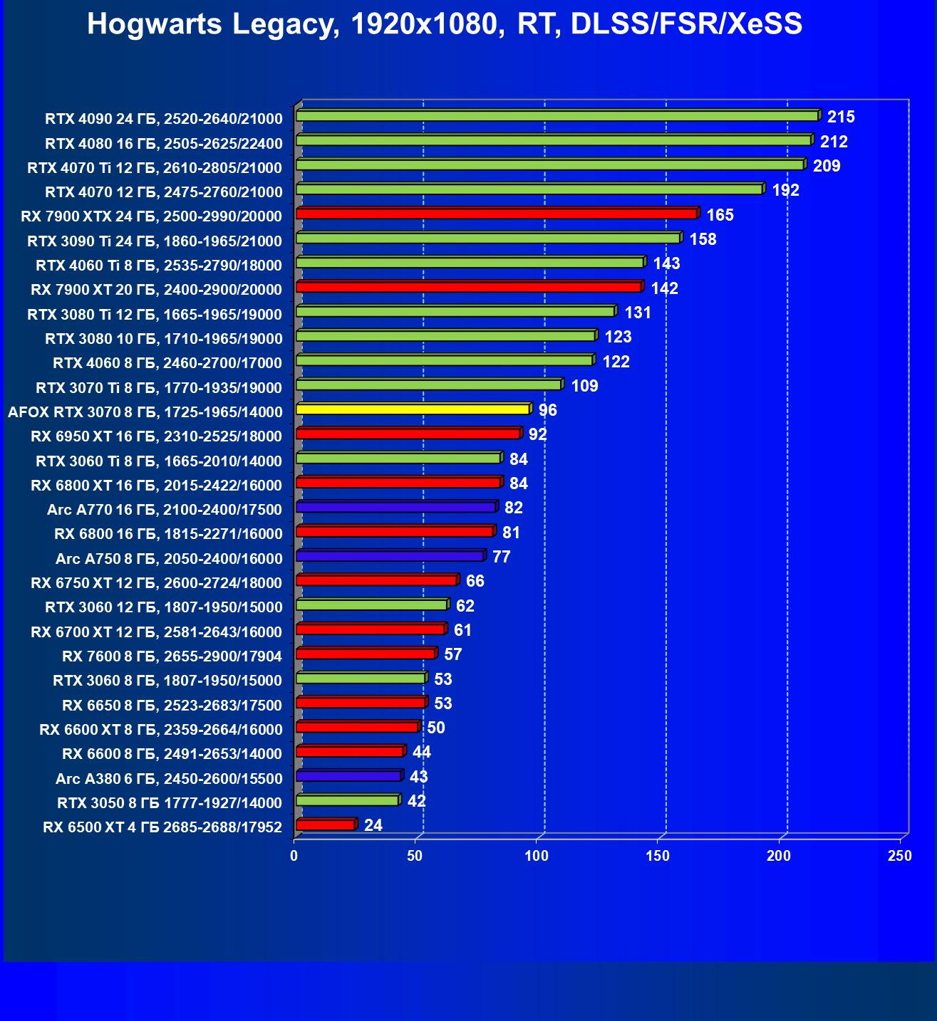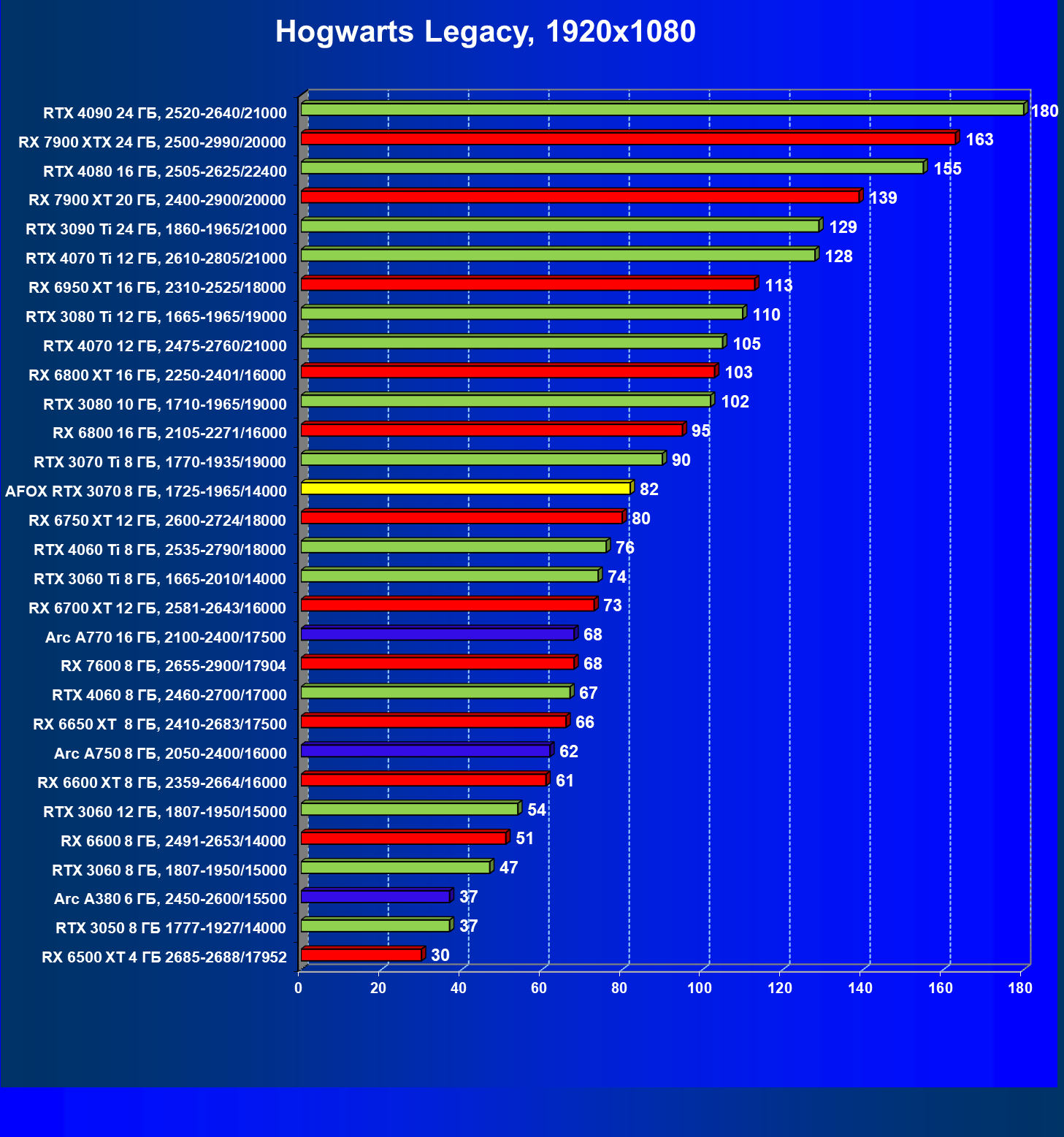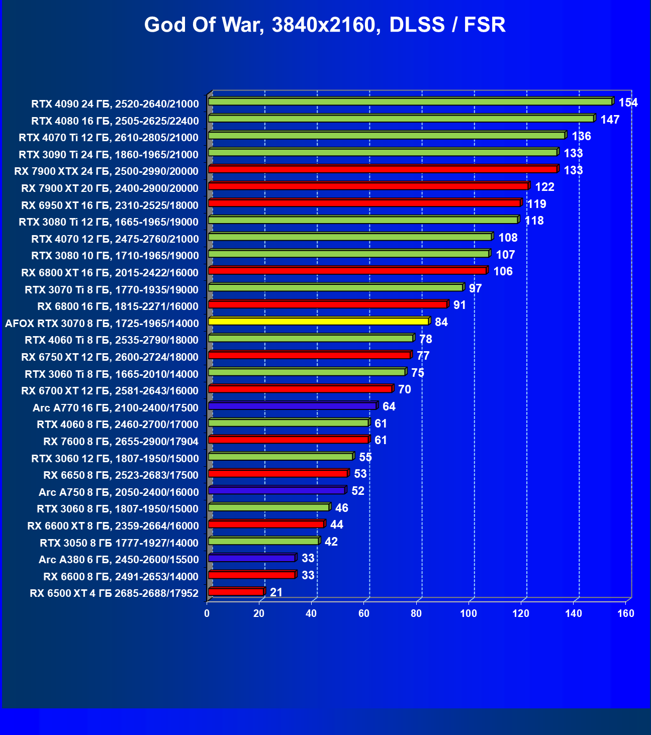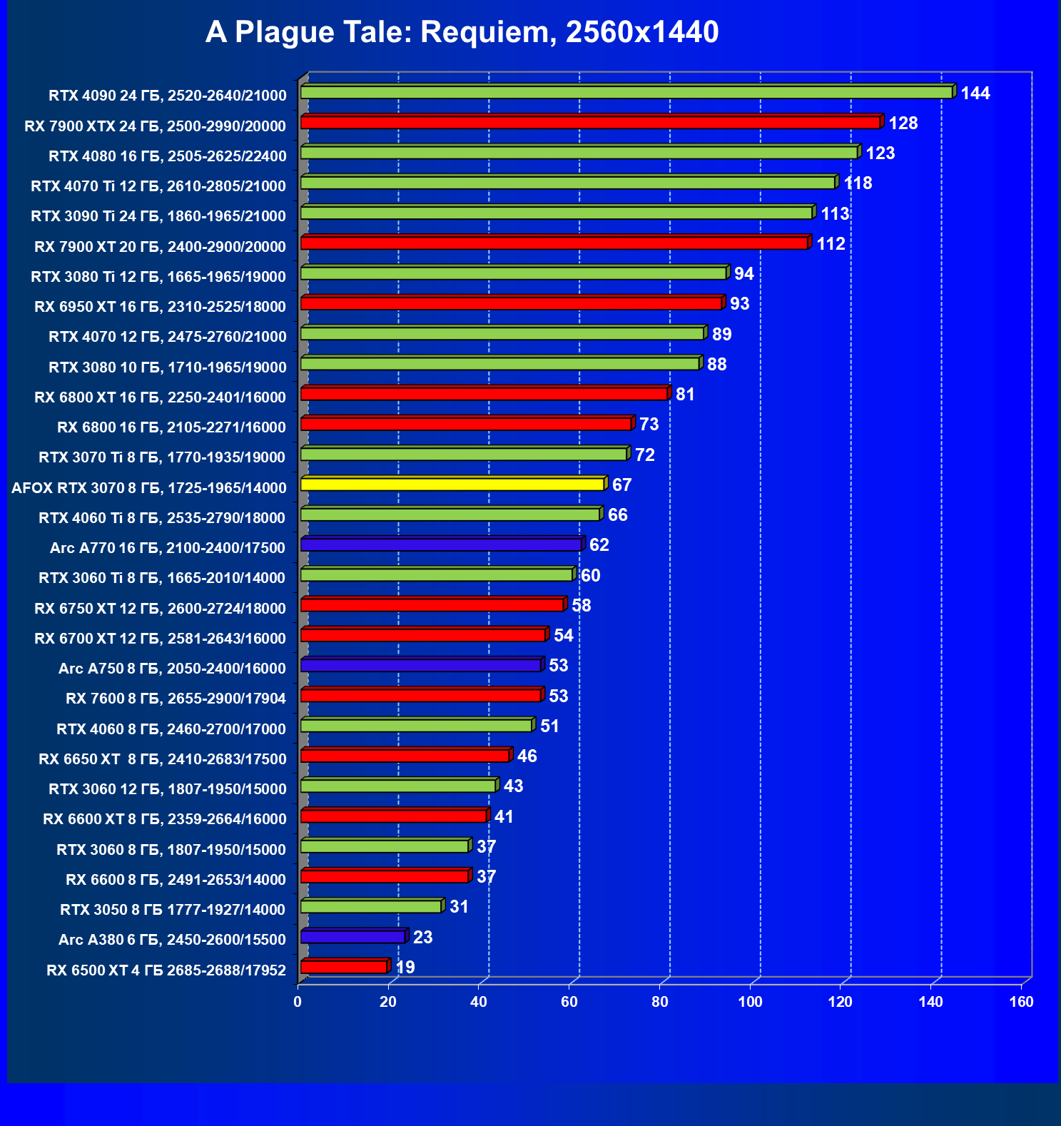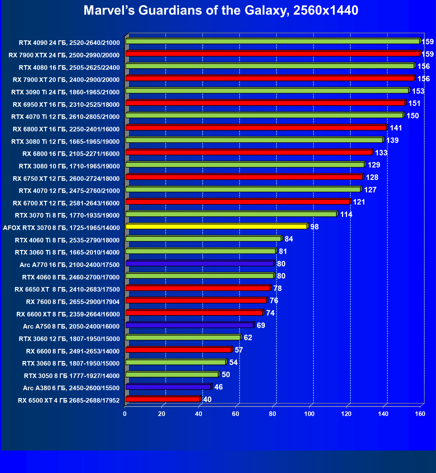 | 15 | Afox RTX 3070 8 ГБ, 1725—1965/14000 | 518 | 144 | 36 000 |