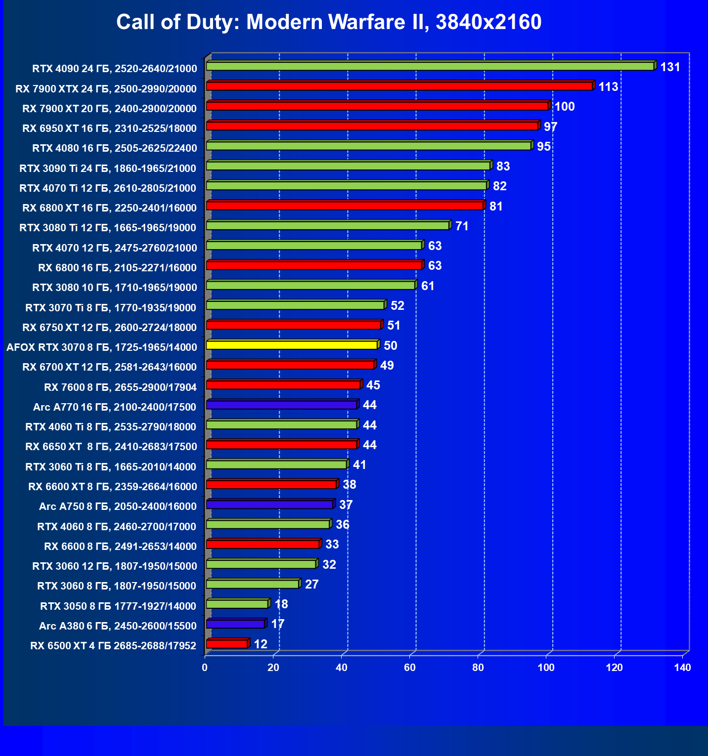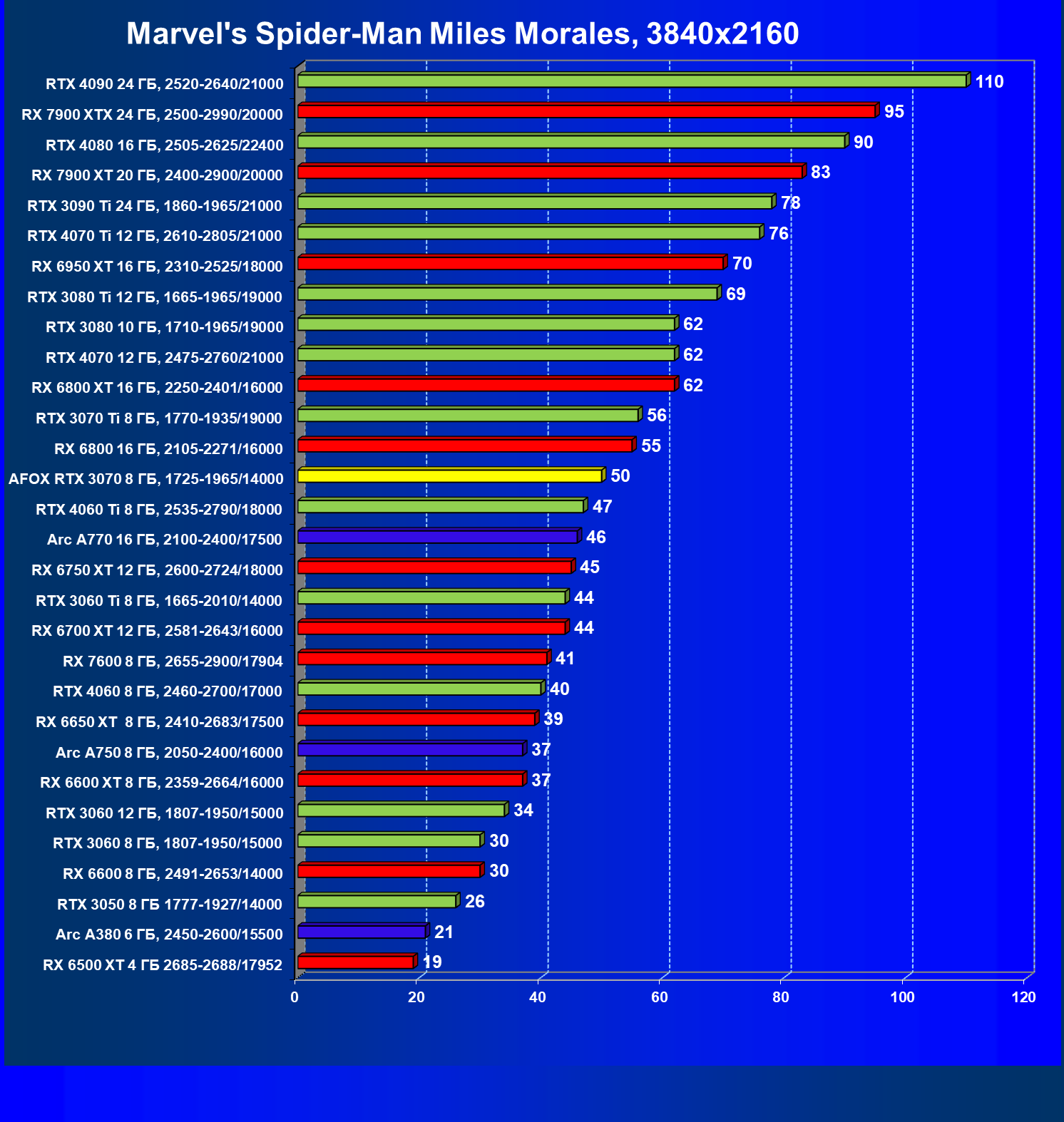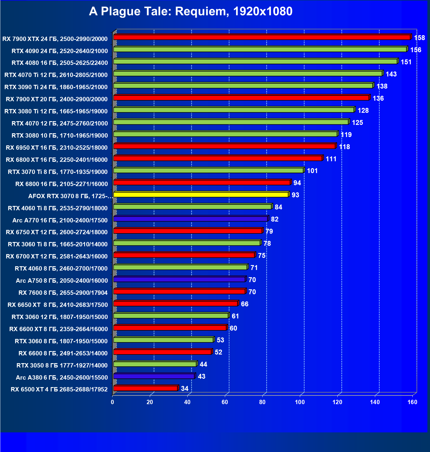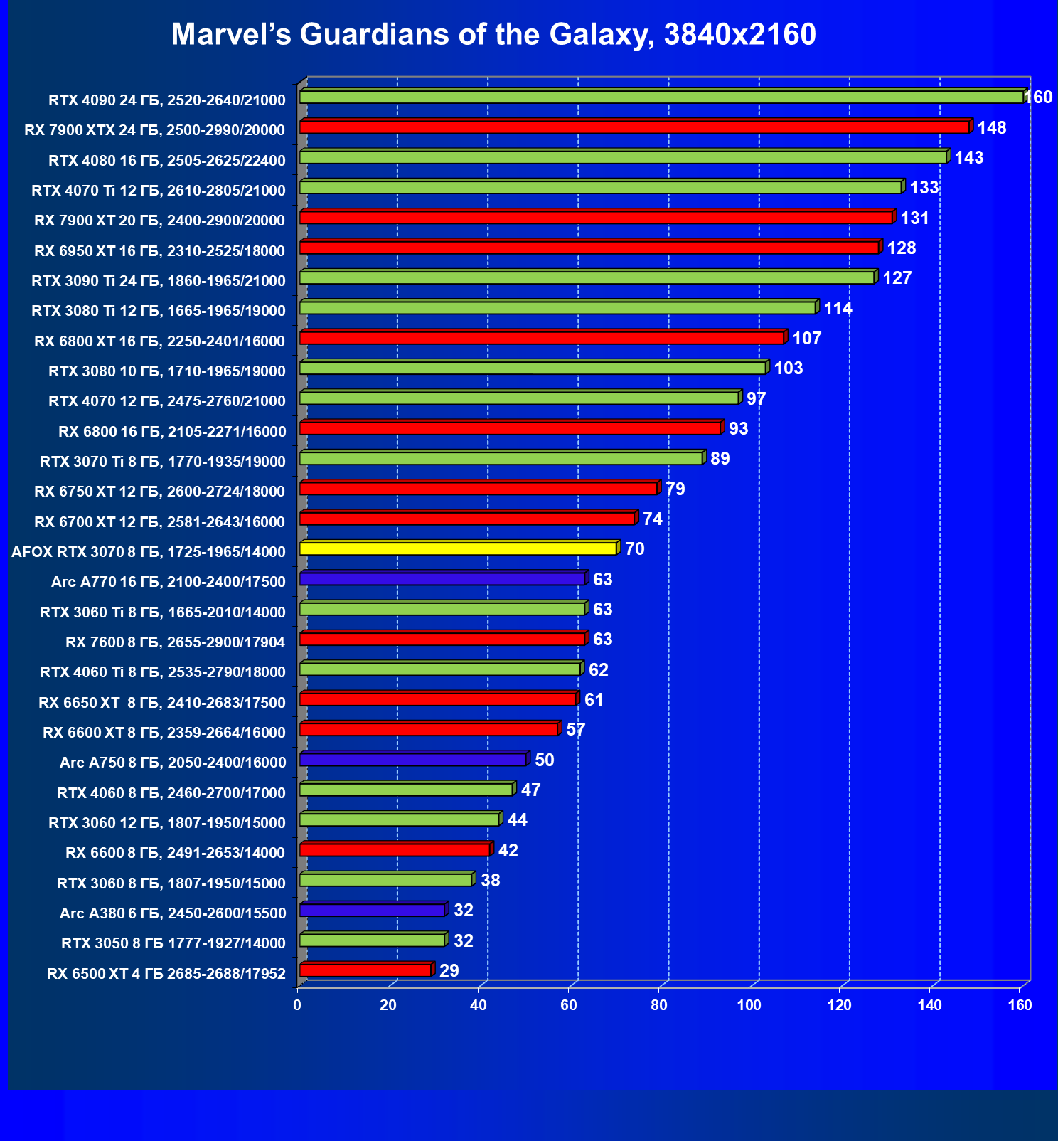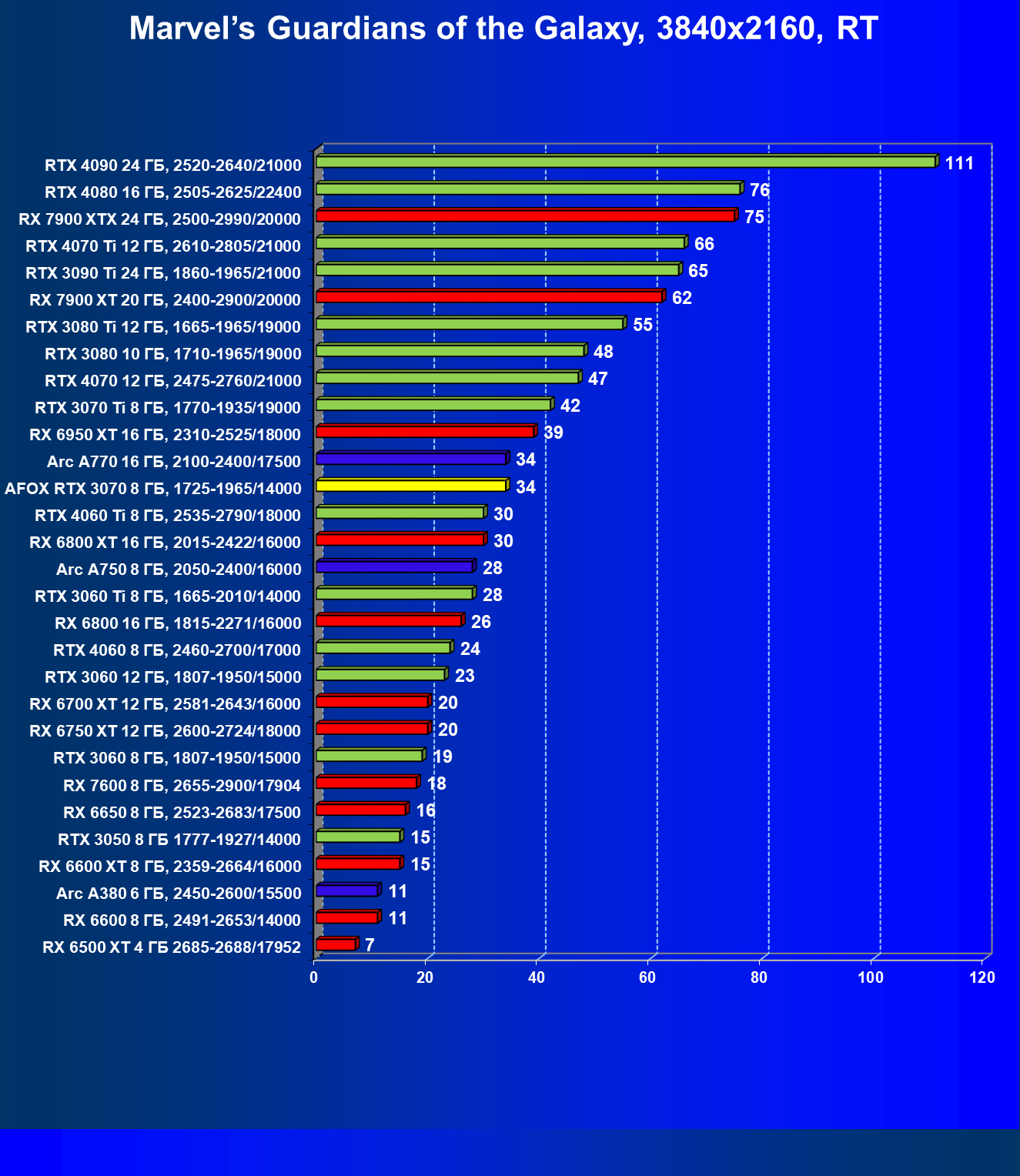 | 15 | Afox RTX 3070 8 ГБ, 1725—1965/14000 | 518 | 144 | 36 000 |