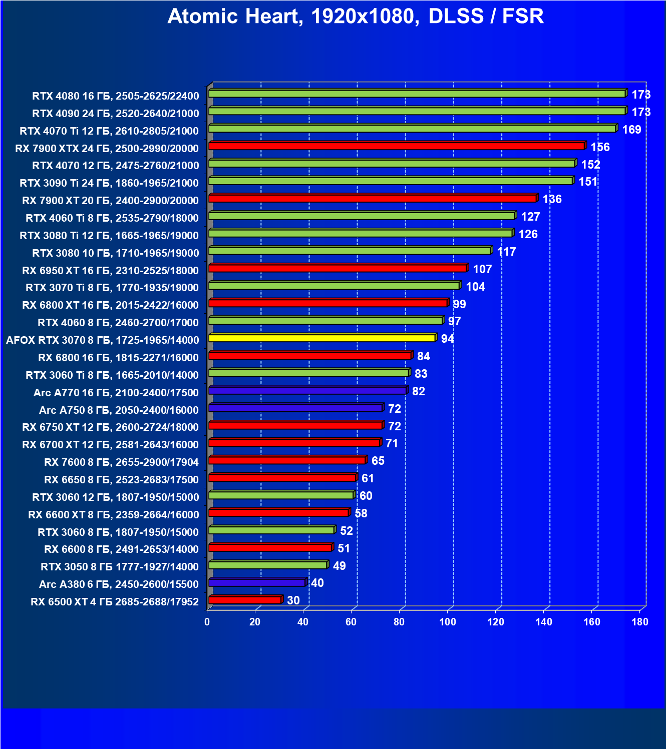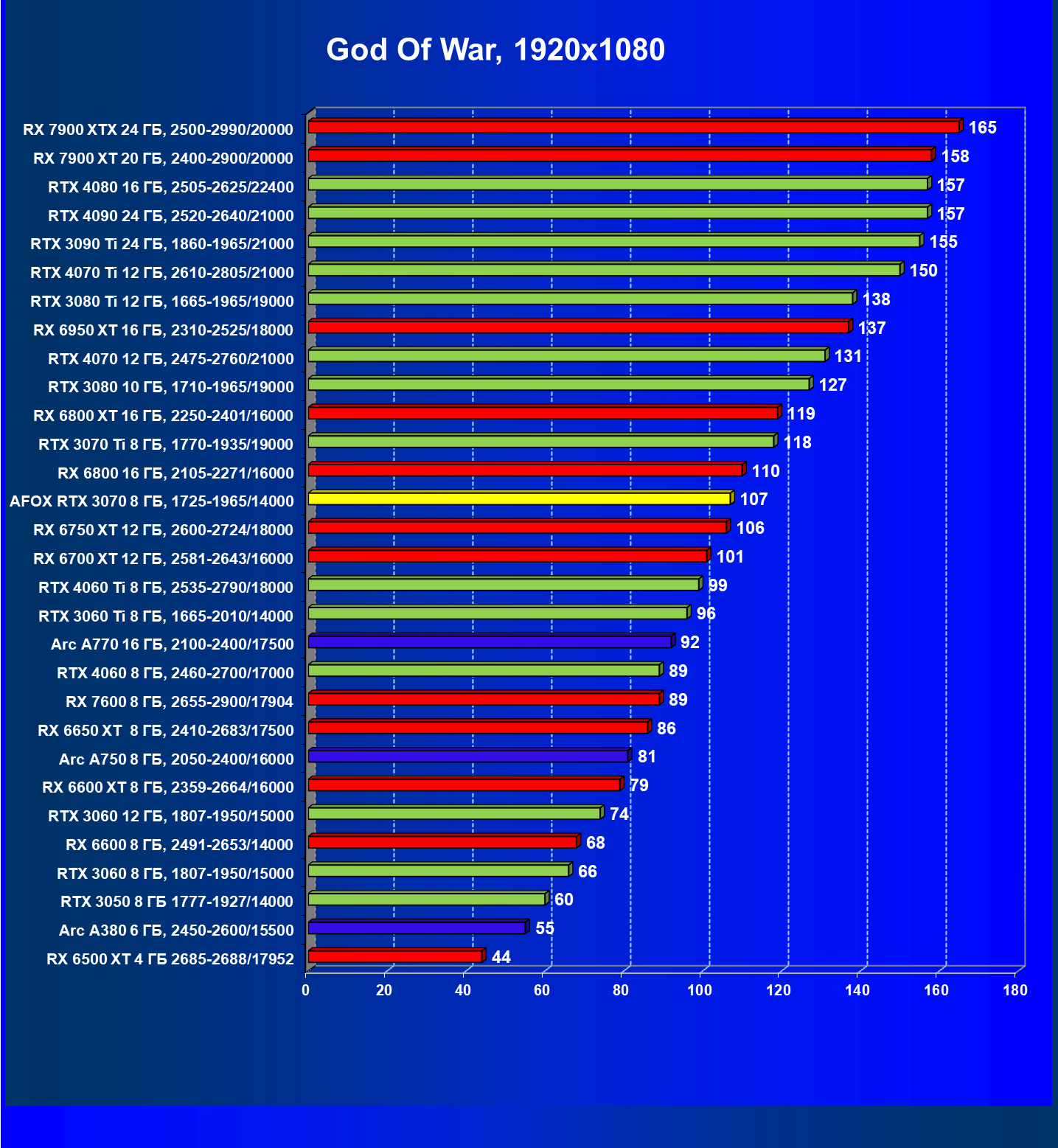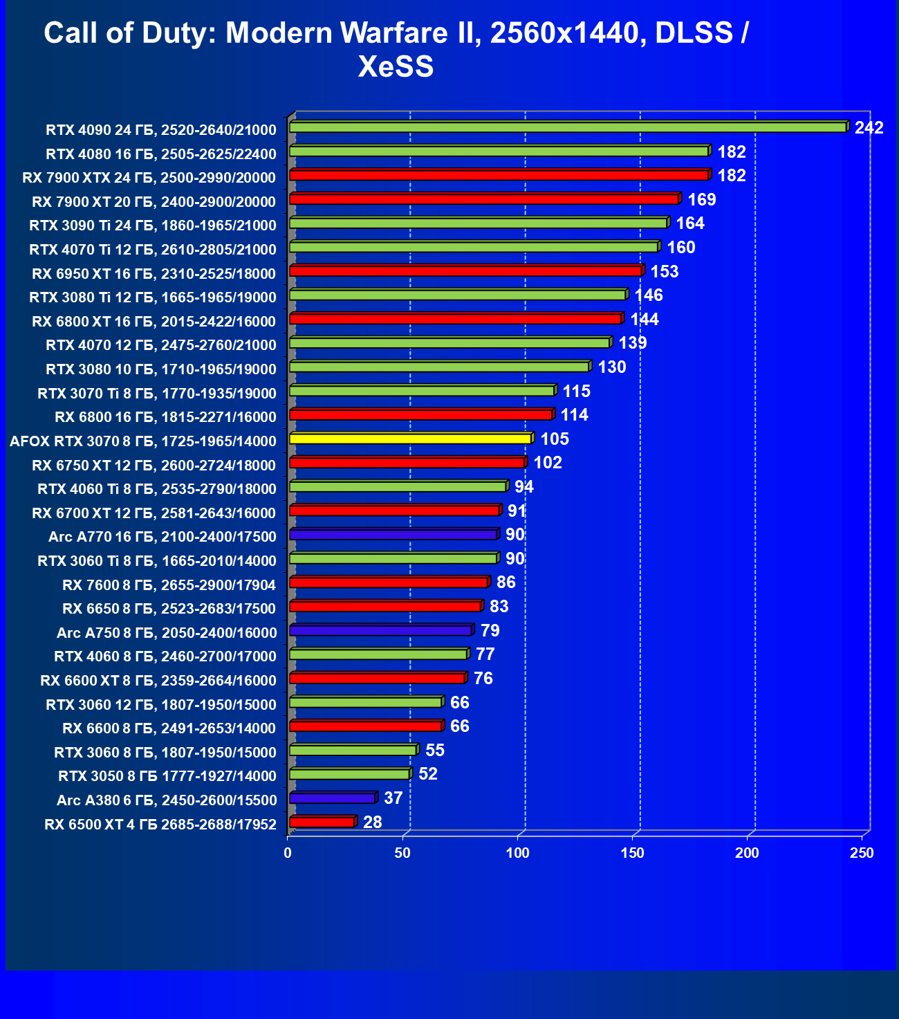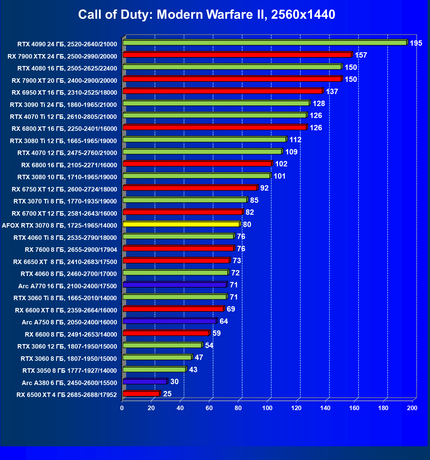 | 15 | Afox RTX 3070 8 ГБ, 1725—1965/14000 | 518 | 144 | 36 000 |