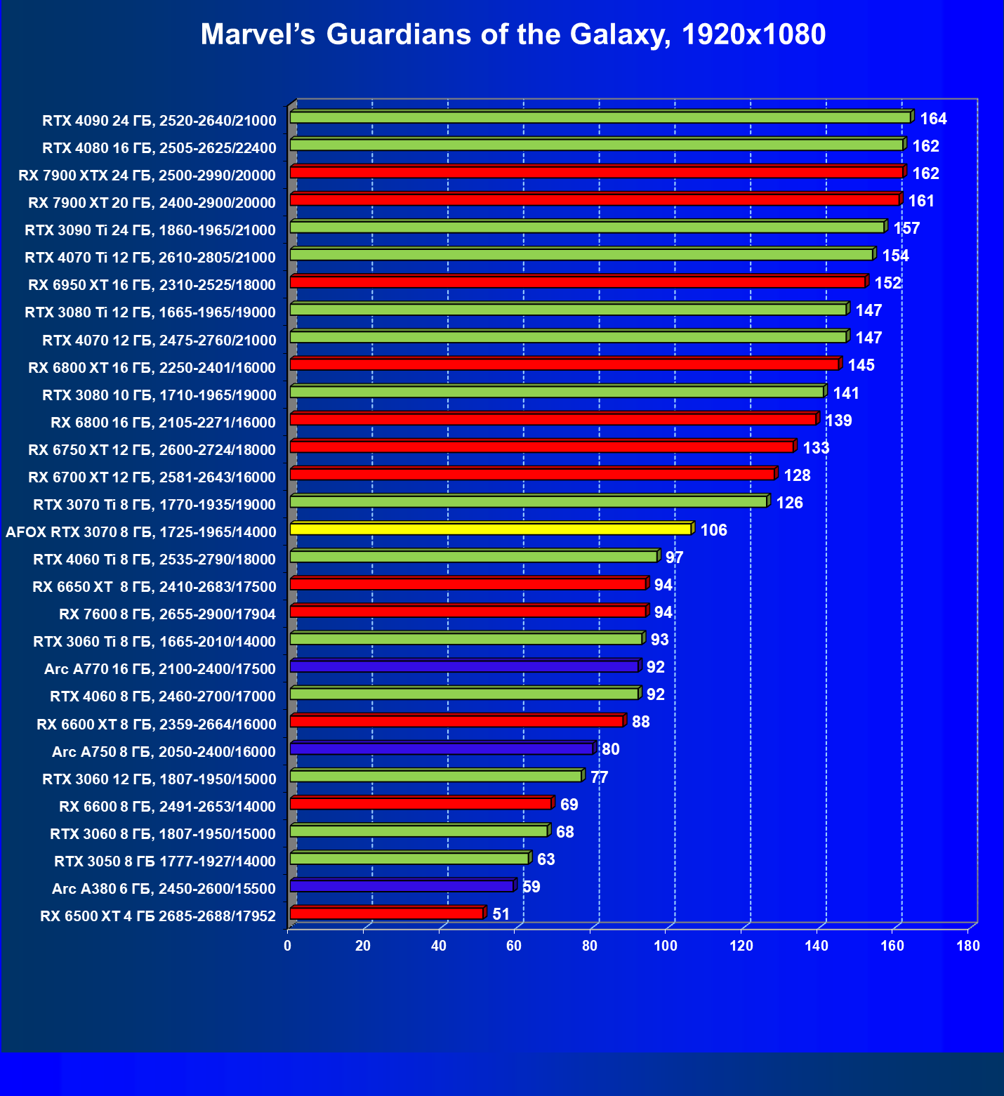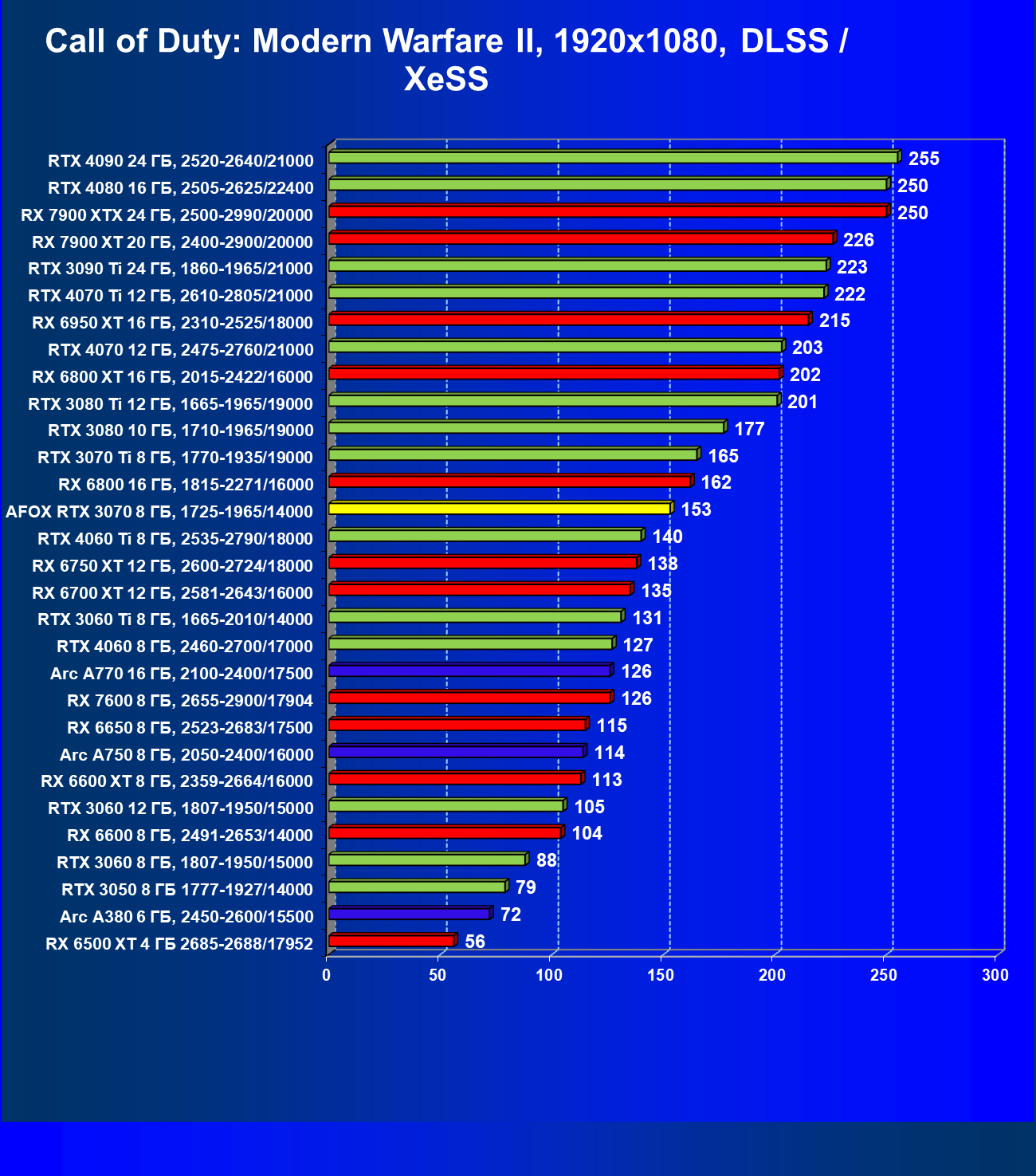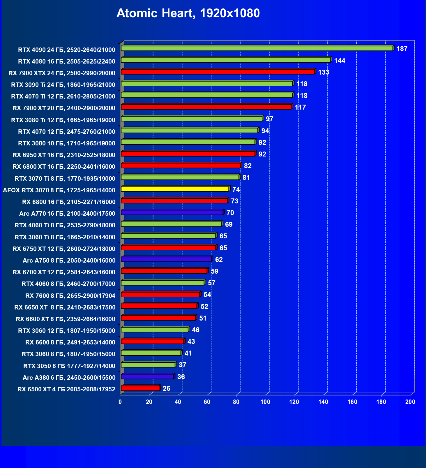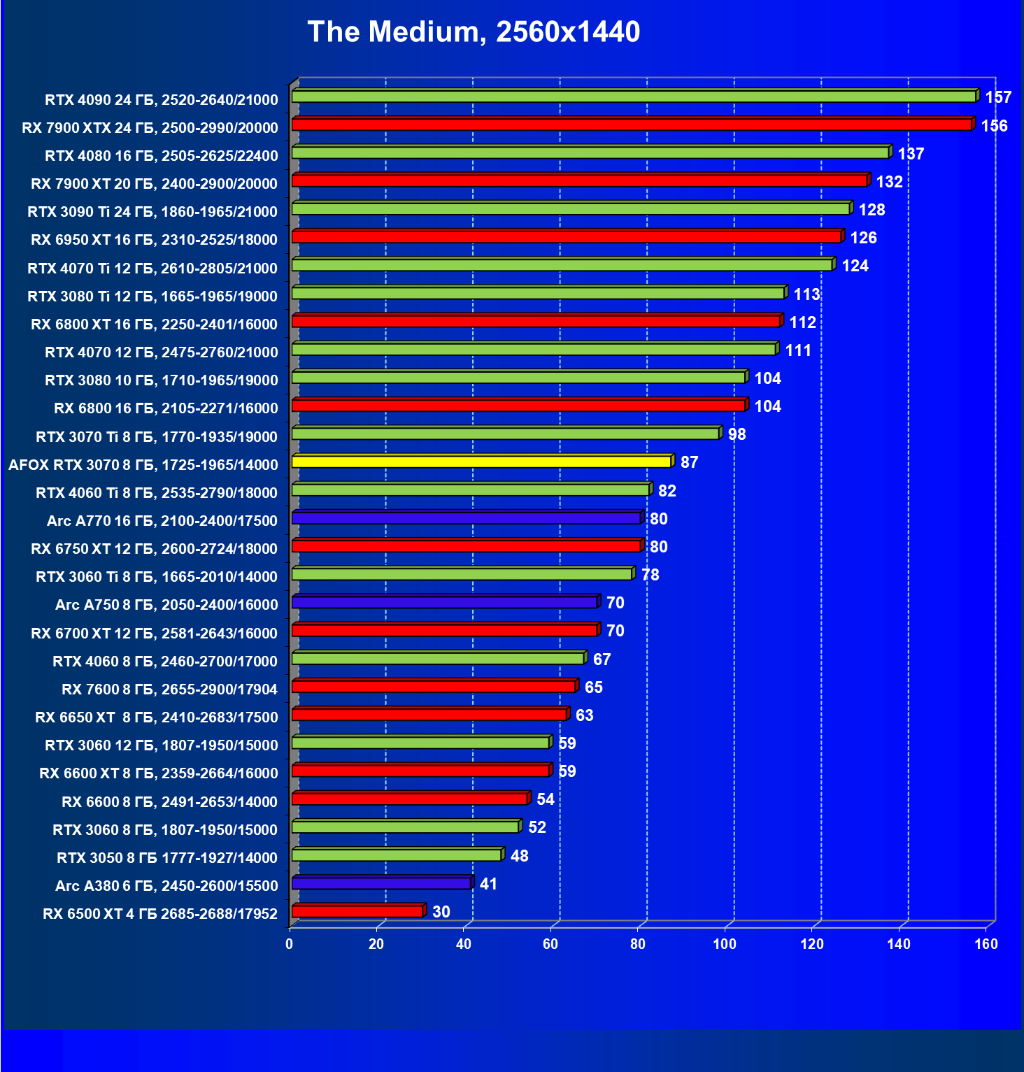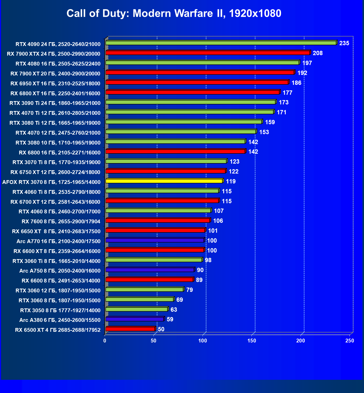 | 15 | Afox RTX 3070 8 ГБ, 1725—1965/14000 | 518 | 144 | 36 000 |