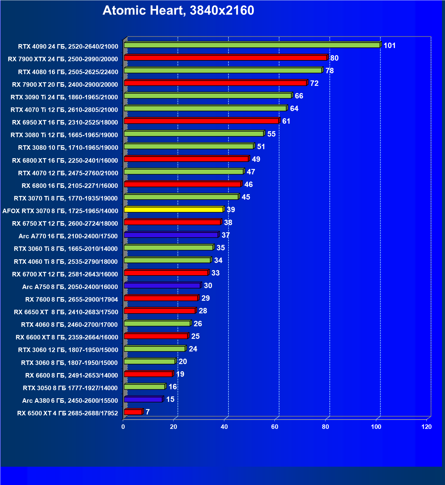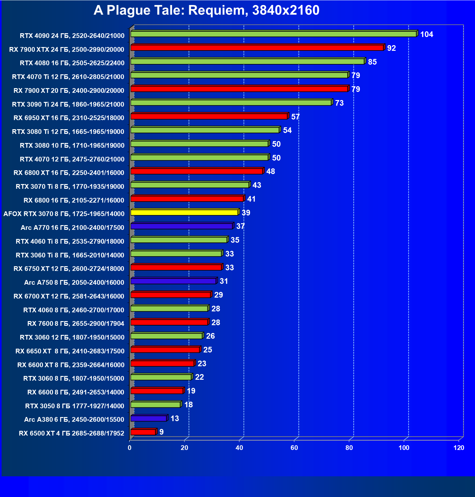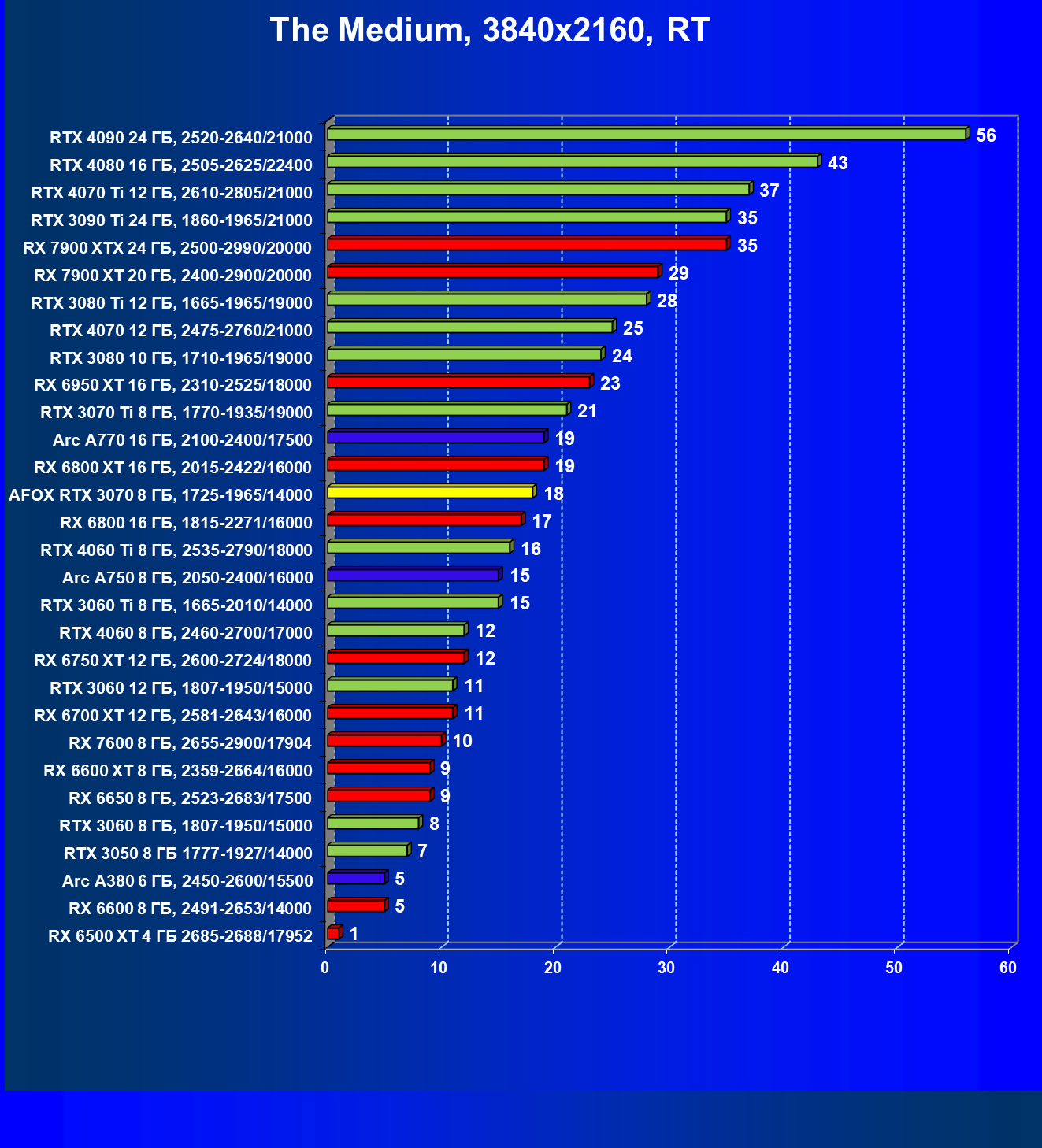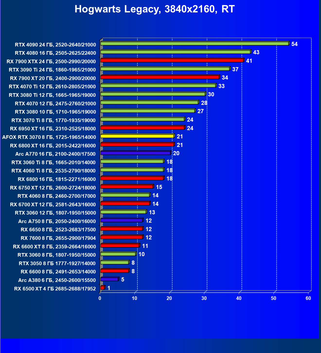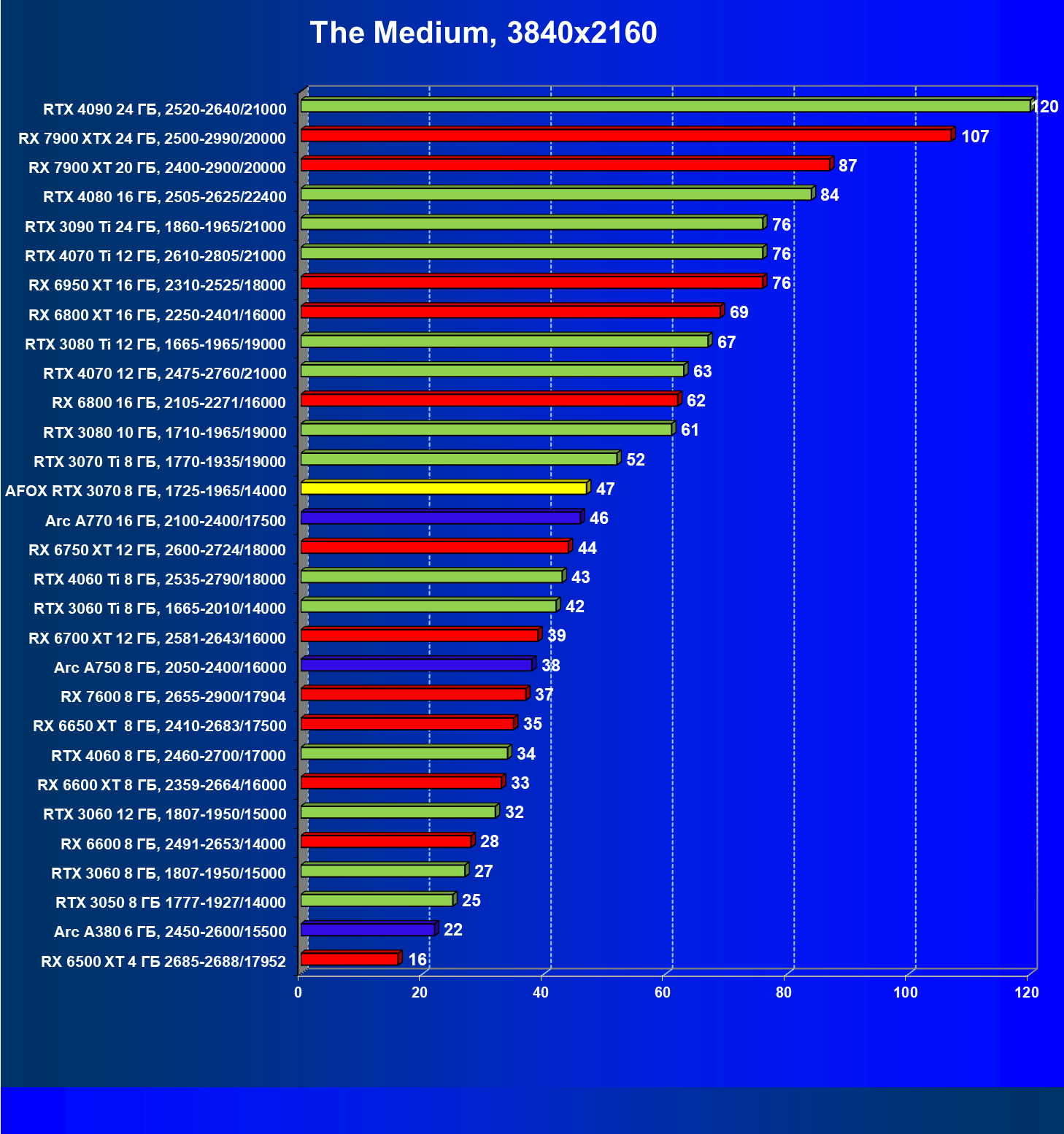 | 08 | Arc A770 16 ГБ, 2100—2400/17500 | 116 | 464 | 40 000 |
