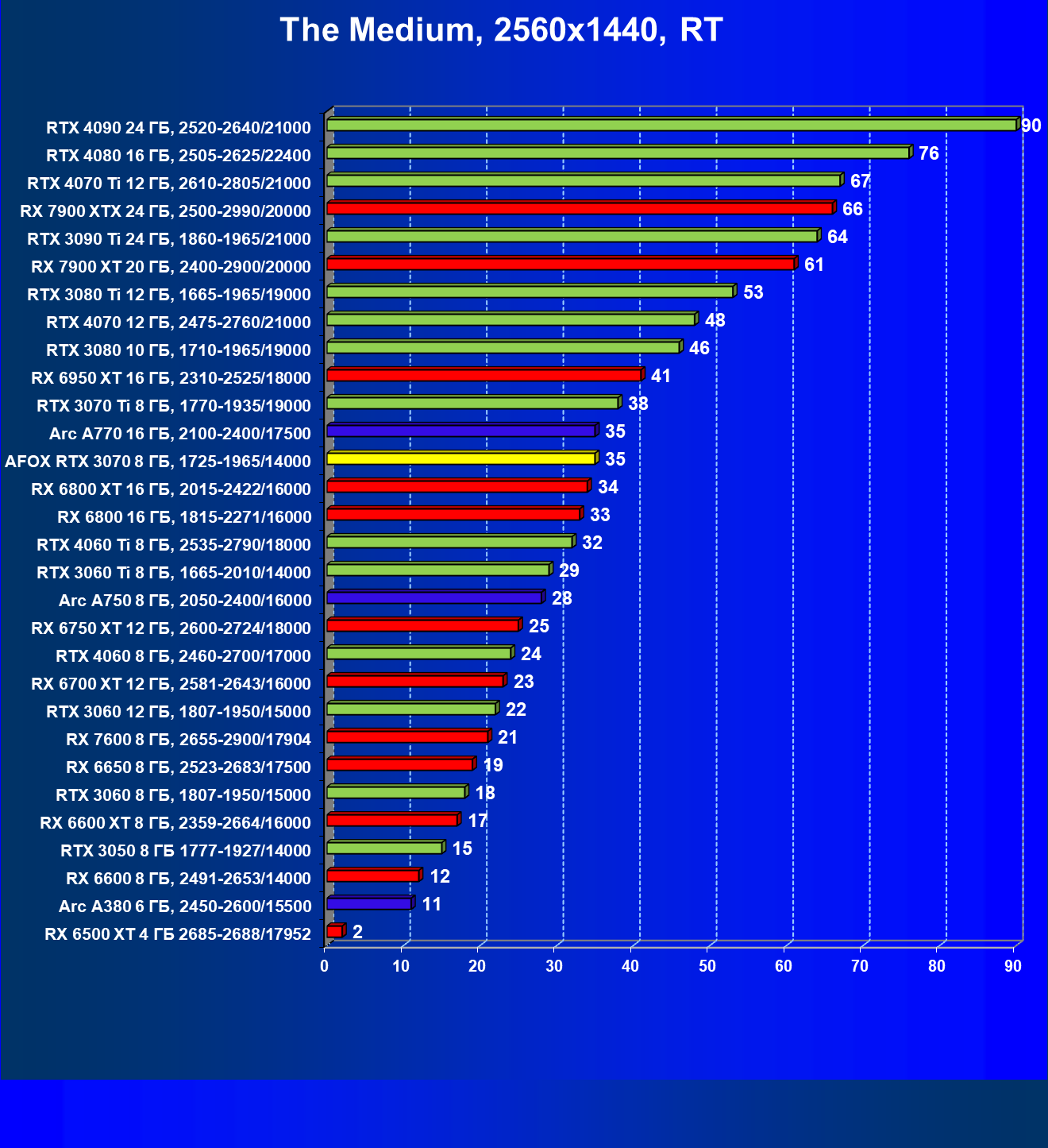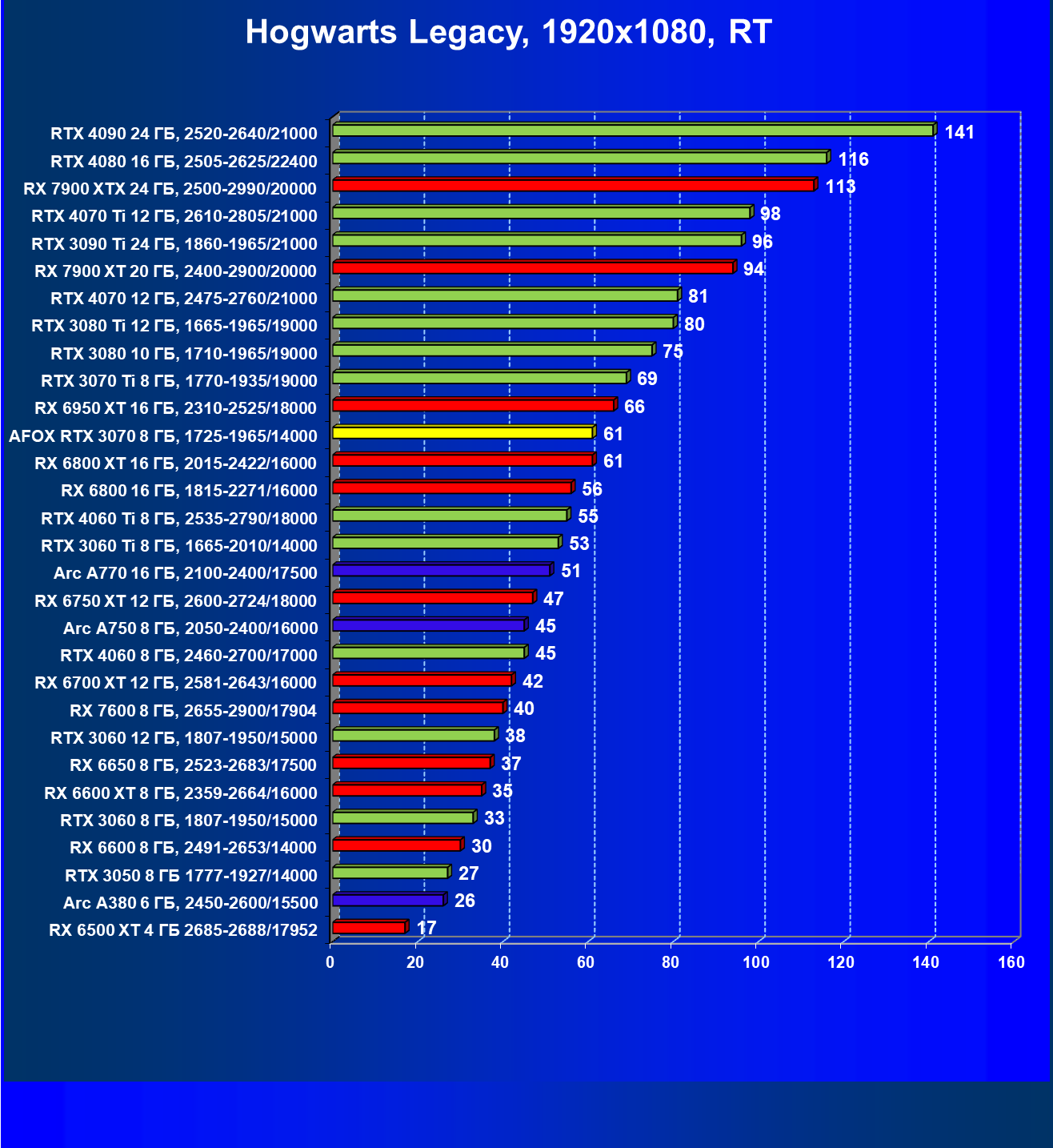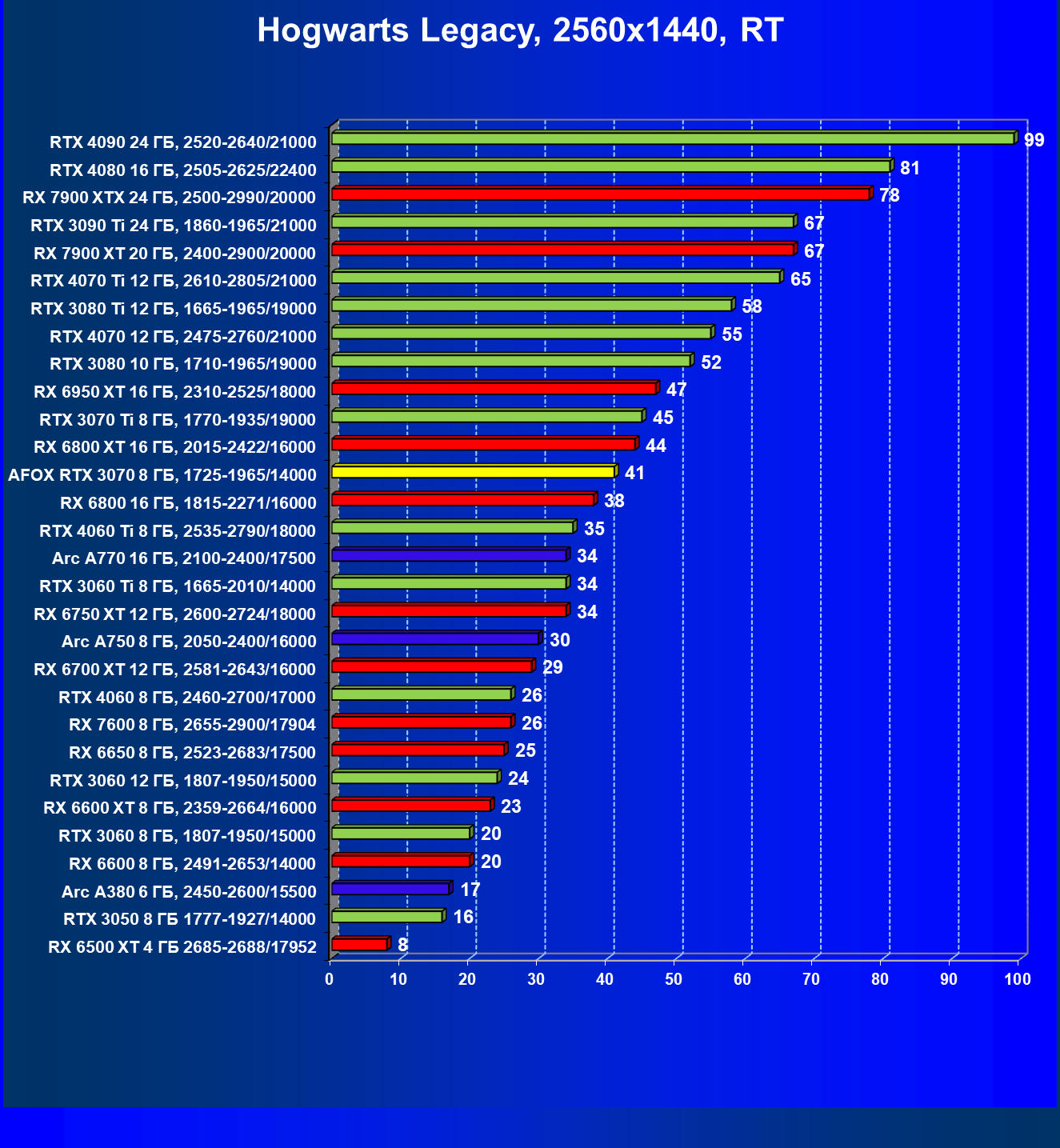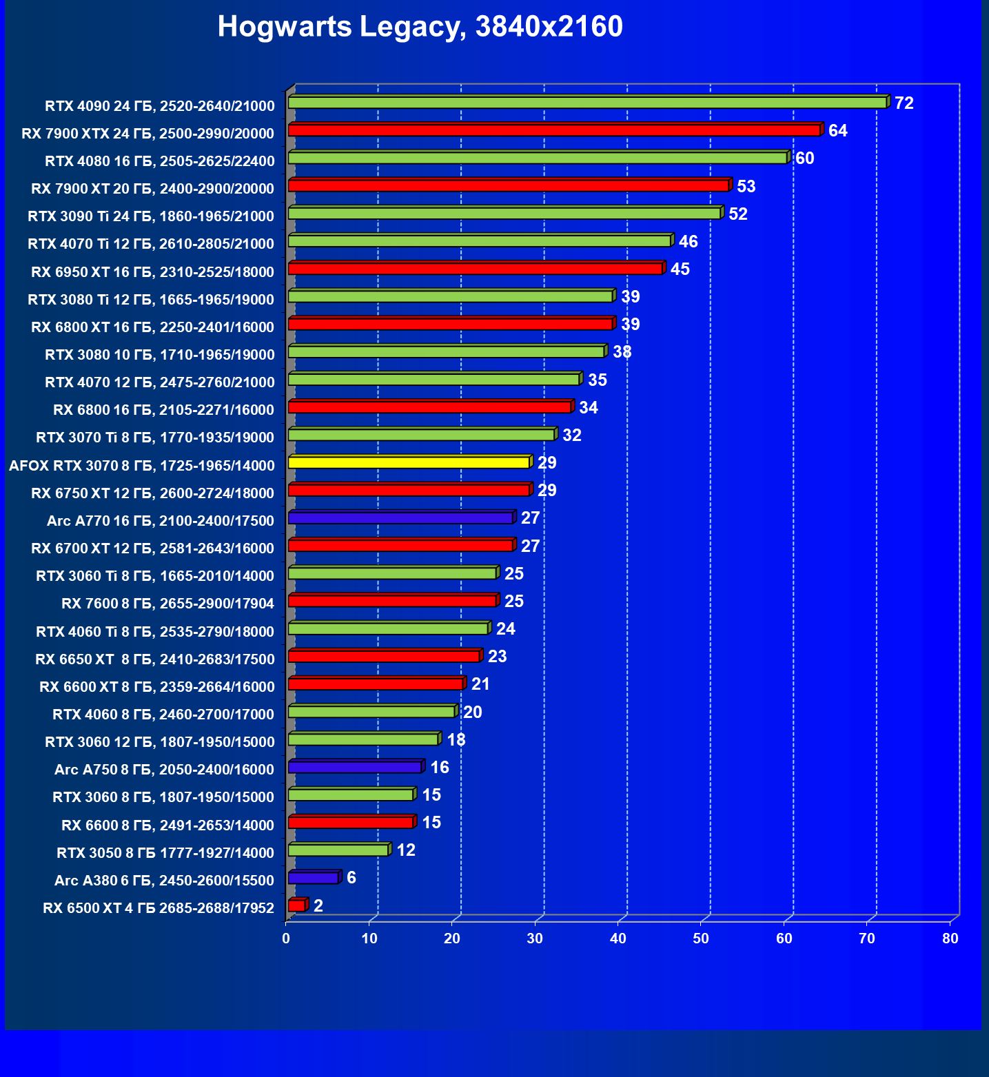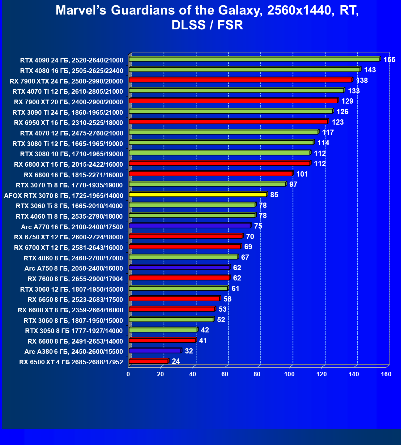 | 13 | Arc A770 16 ГБ, 2100—2400/17500 | 81 | 324 | 40 000 |