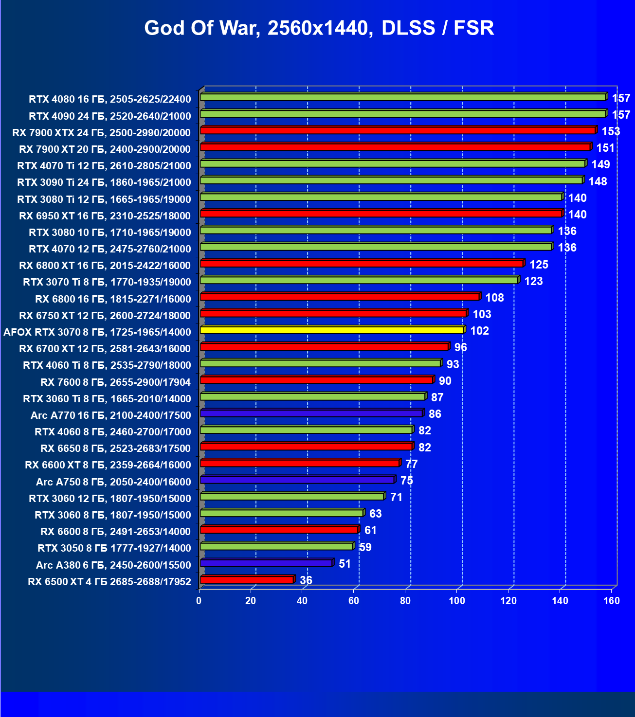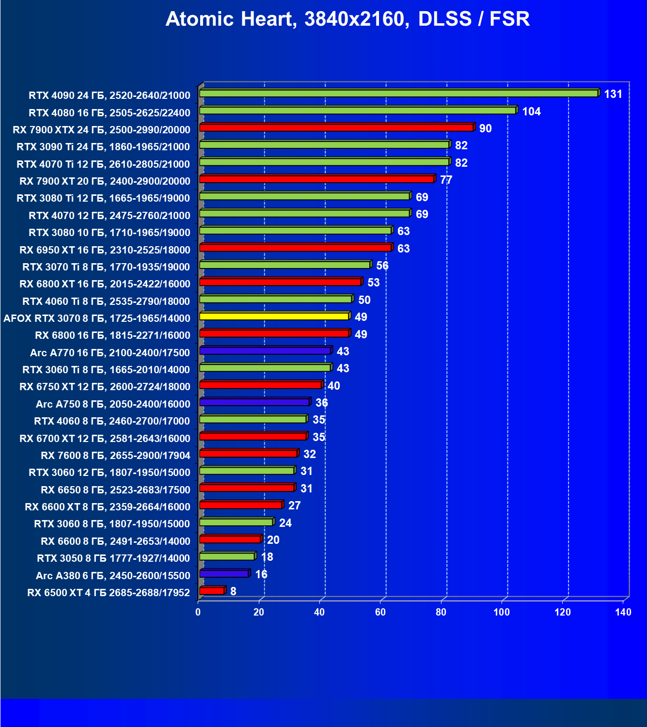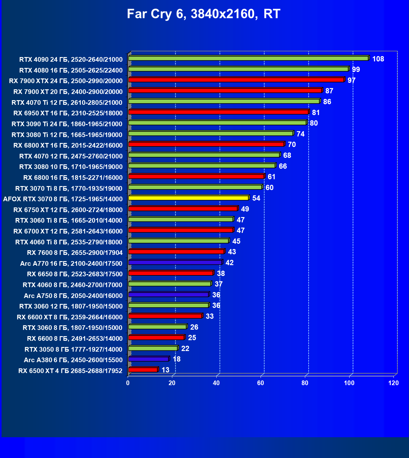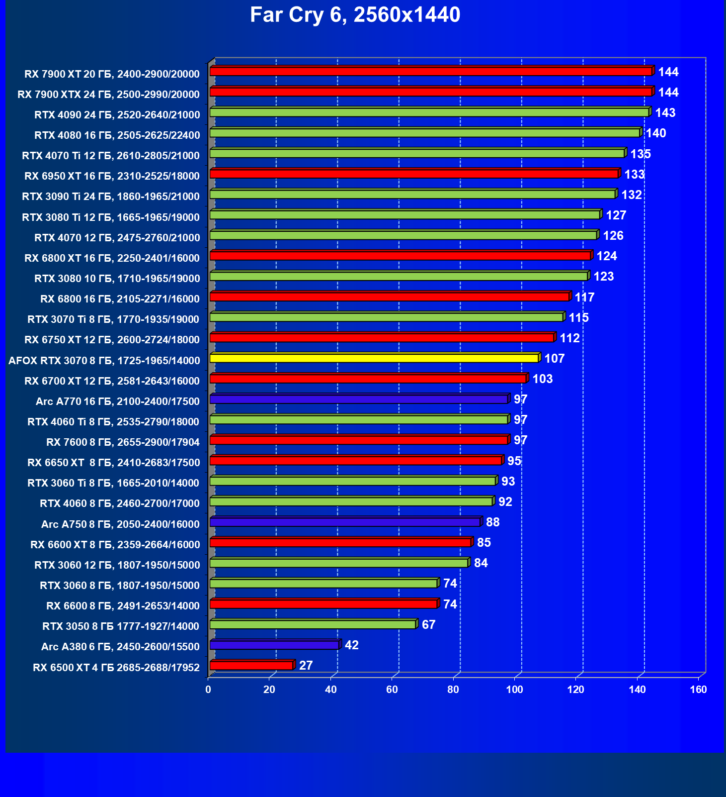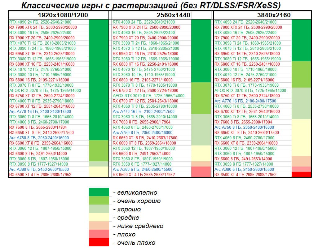 Мы давно уже знаем, что в целом GeForce RTX 3070 в классических играх на максимальных настройках качества обеспечивает полный комфорт в разрешении 2.5K и ниже. В ряд игр можно неплохо поиграть и в разрешении 4K, однако всё больше и больше игр при максимальном качестве графики в 4K требуют более 8 ГБ видеопамяти, так что GeForce RTX 3070 всё же больше подходит для 2.5K. Конкурентом является Radeon RX 6750 XT.