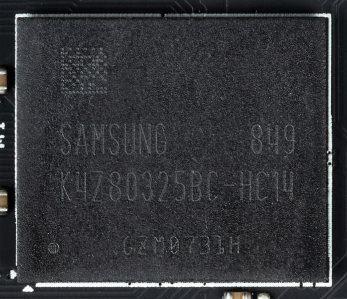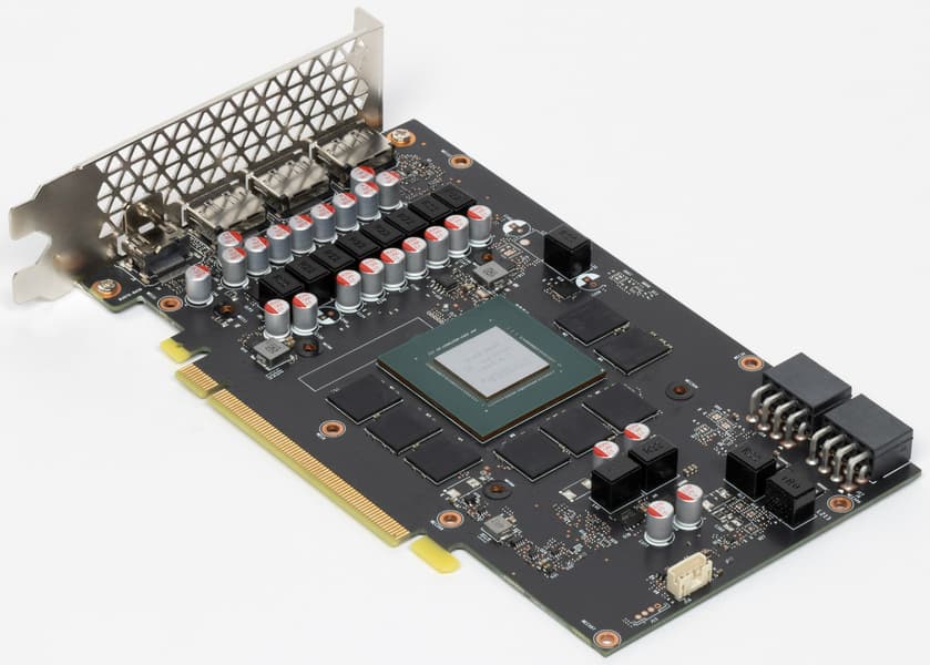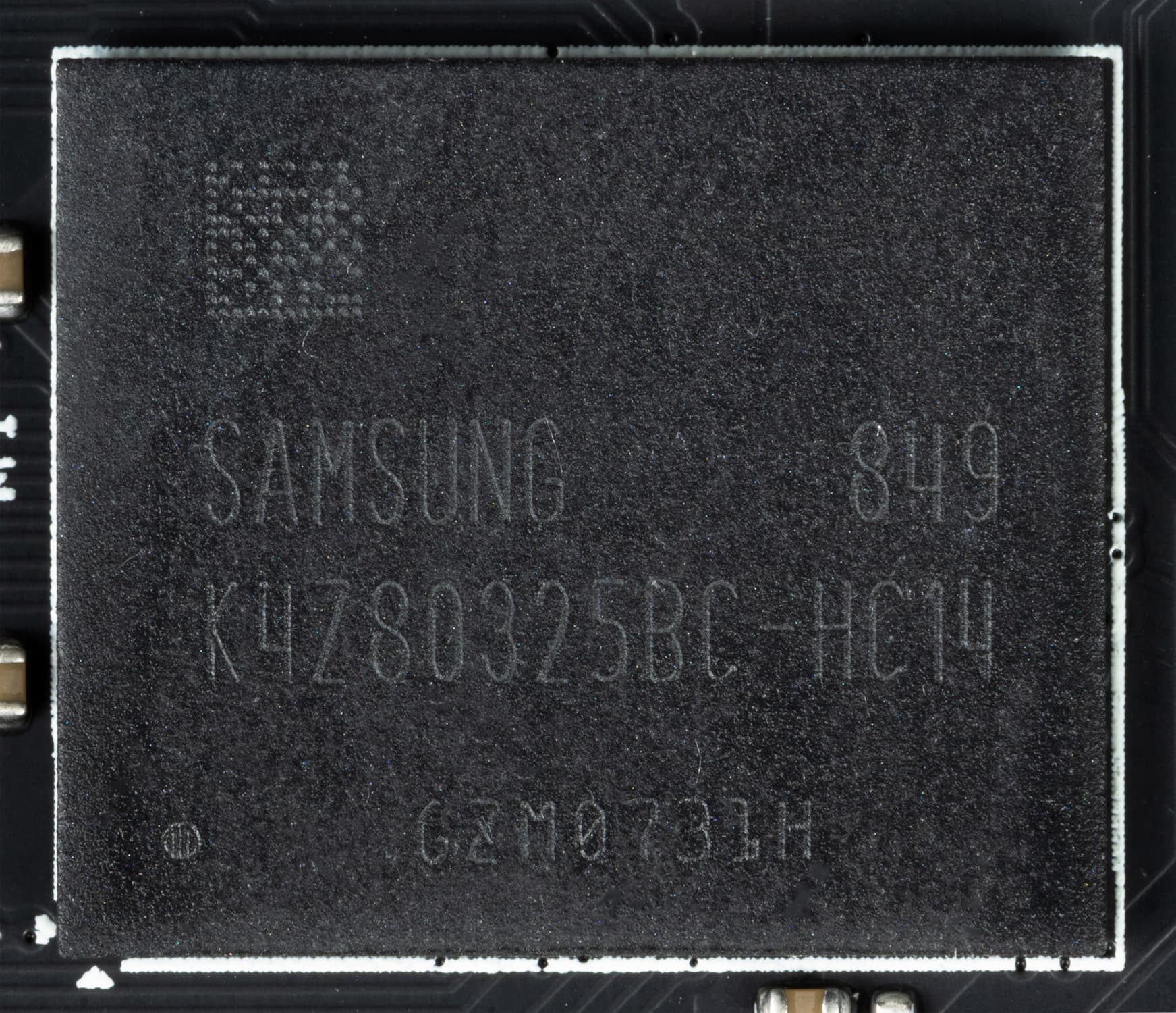 Карта имеет 8 ГБ памяти GDDR6 SDRAM, размещенной в 8 микросхемах по 8 Гбит на лицевой стороне PCB. Микросхемы памяти Samsung (K4Z80325BC-HC14) рассчитаны на условную номинальную частоту работы в 3500 (14000) МГц.