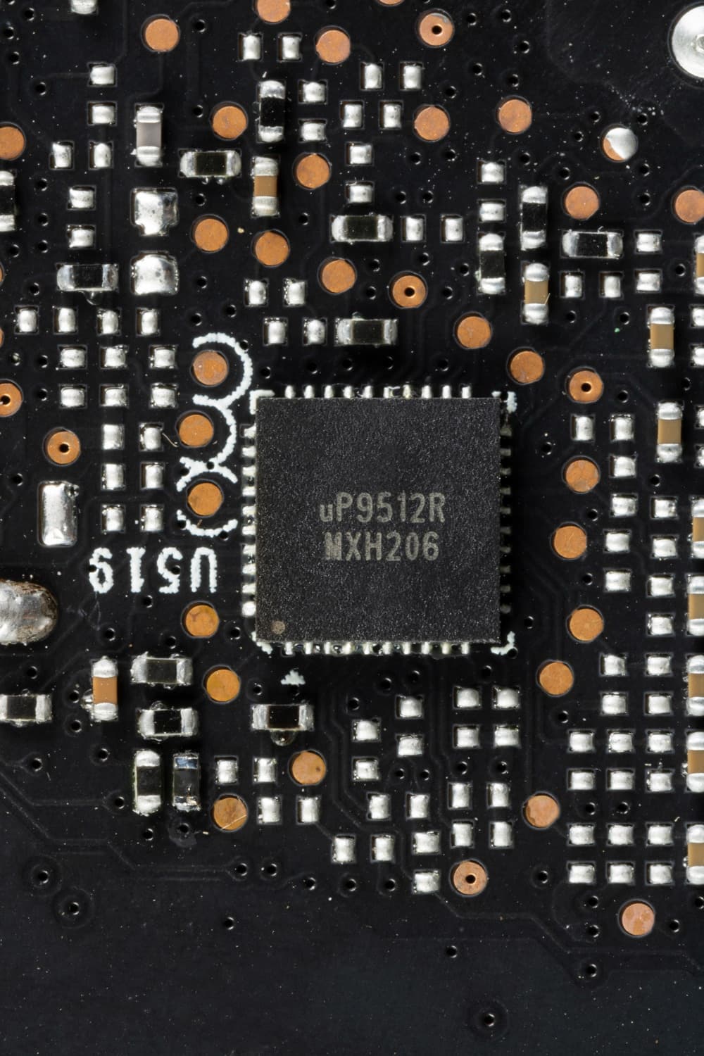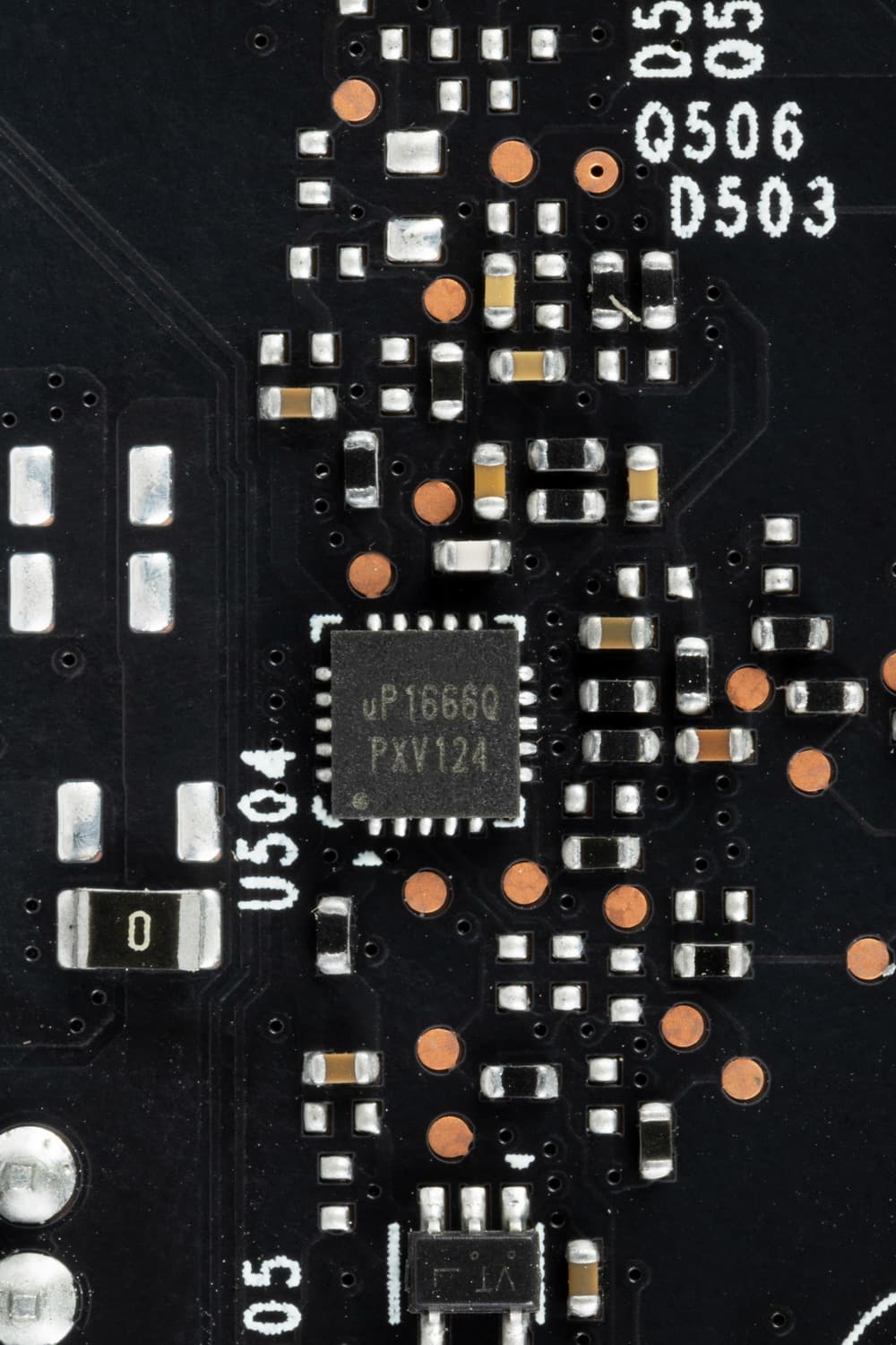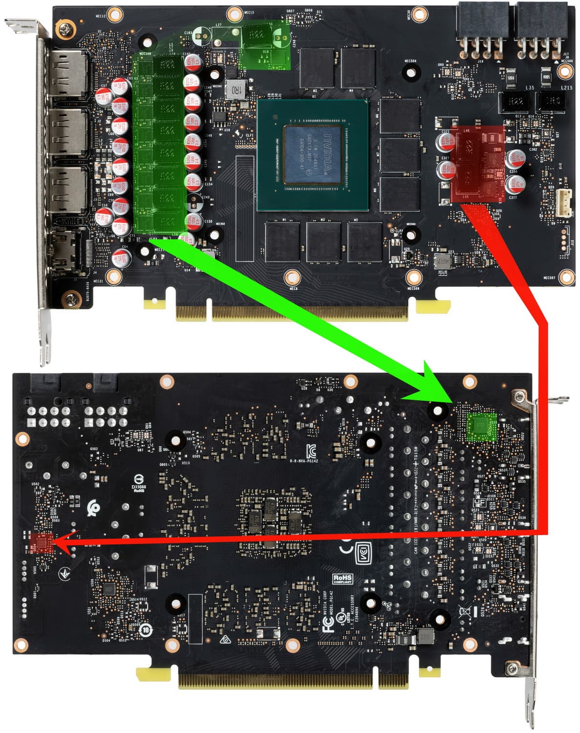 Зеленым цветом отмечены фазы питания графического ядра, а также их ШИМ-контроллер, а красным — то же для микросхем памяти. Для управления схемой питания ядра используется ШИМ-контроллер uP9512R (uPI Semiconductor), он расположен на оборотной стороне платы.