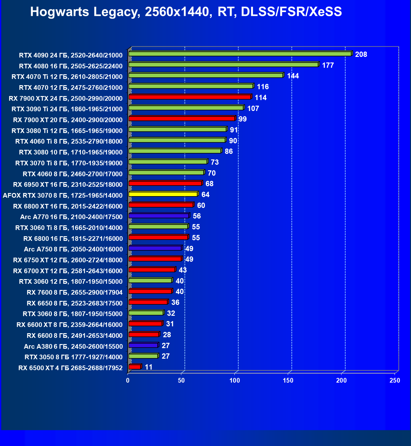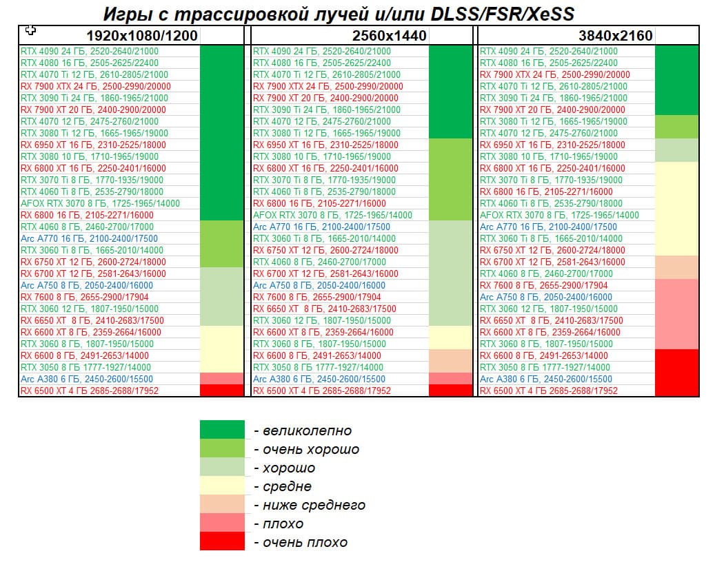 - Результаты тестов со включенной аппаратной трассировкой лучей и/или DLSS/FSR/XeSS в разрешениях 1920×1080, 2560×1440 и 3840×2160