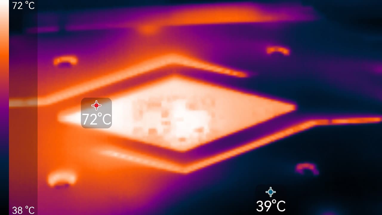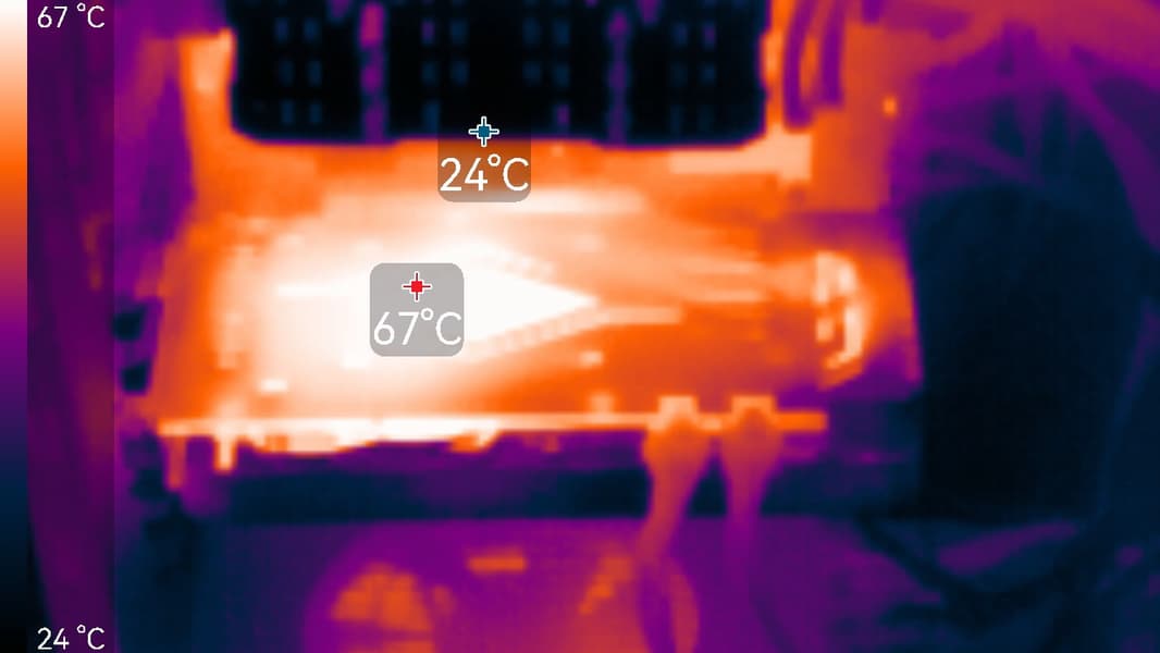 Максимальный нагрев наблюдался в районе GPU и преобразователей питания VRM.