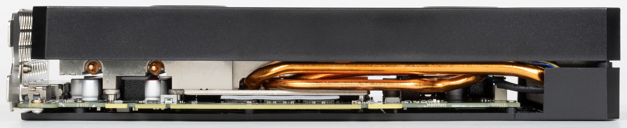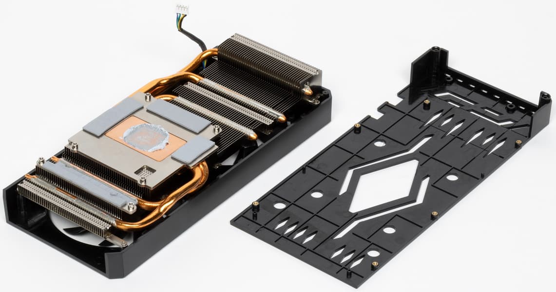 Трубки припаяны к медной подошве, которая прижимается к GPU. Микросхемы памяти (через термопрокладки) охлаждаются той же подошвой. А для охлаждения преобразователей питания VRM имеется своя подошва на радиаторе.