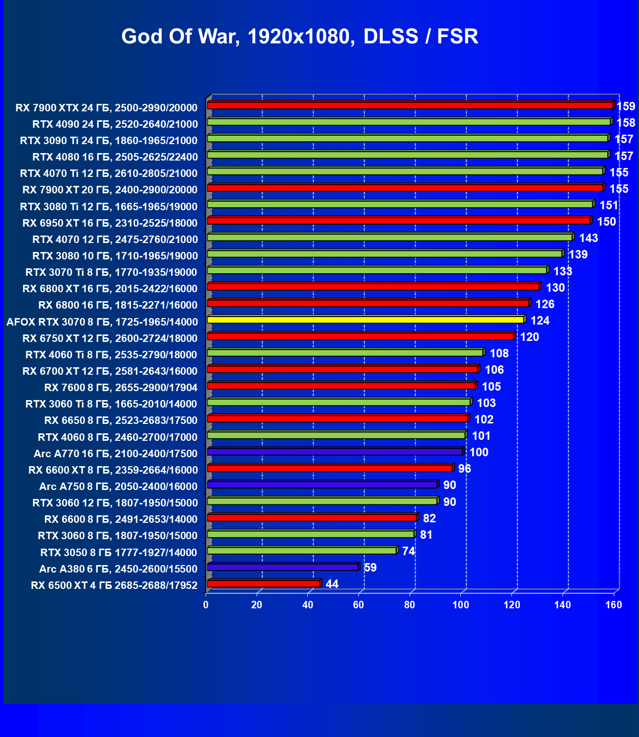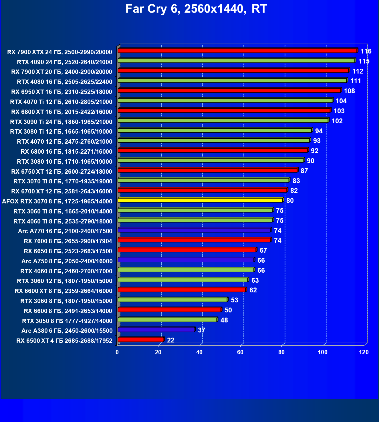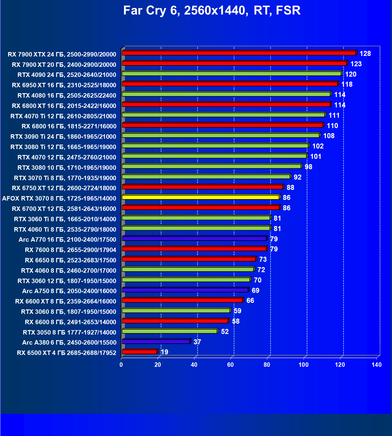 | 12 | RX 6700 XT 12 ГБ, 2581—2643/16000 | 81 | 326 | 40 000 |