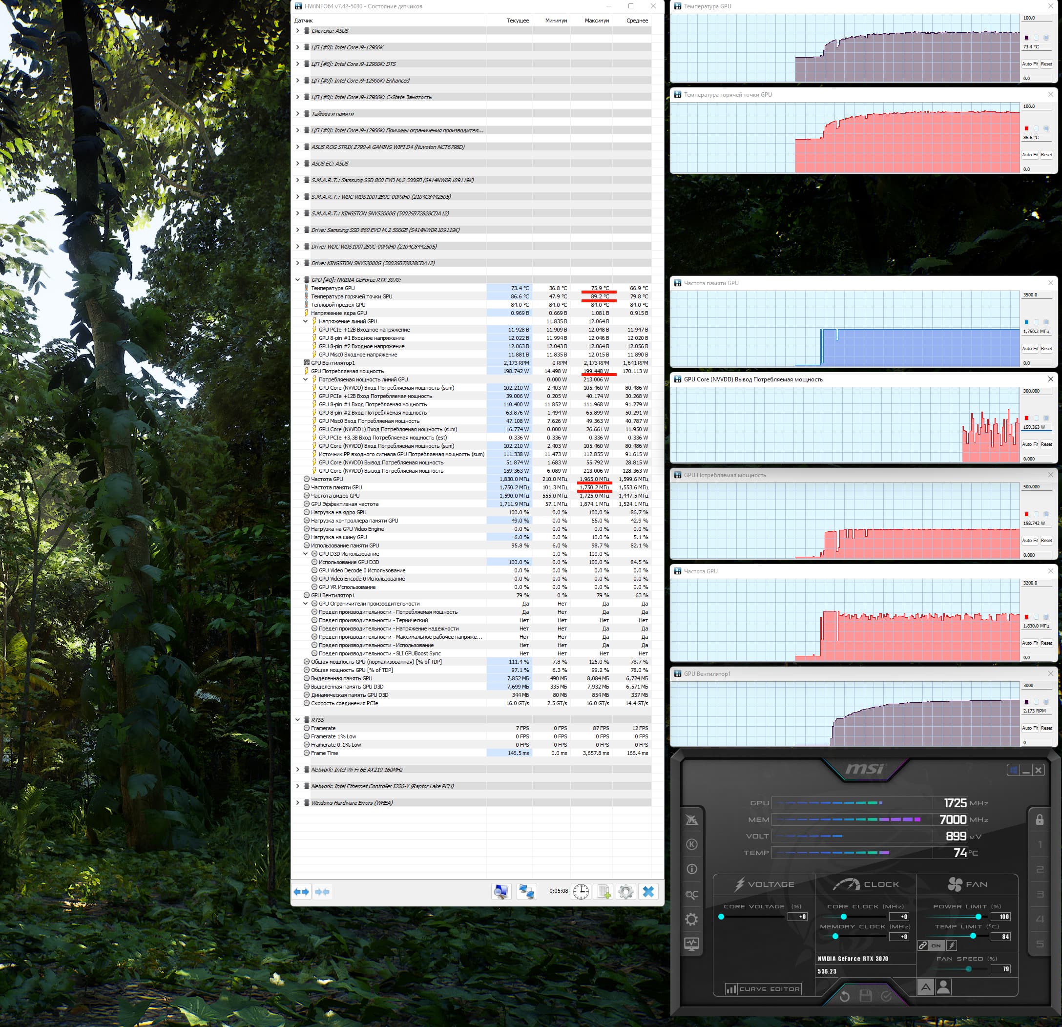 В режиме максимальной нагрузки в 3D температура достигала 76/89 °C (ядро/hot spot). Вентиляторы при этом раскручивались до 2173 оборотов в минуту, шум вырастал до 38,3 дБА: это уже громко, но еще терпимо. Аудиозапись шума — здесь.