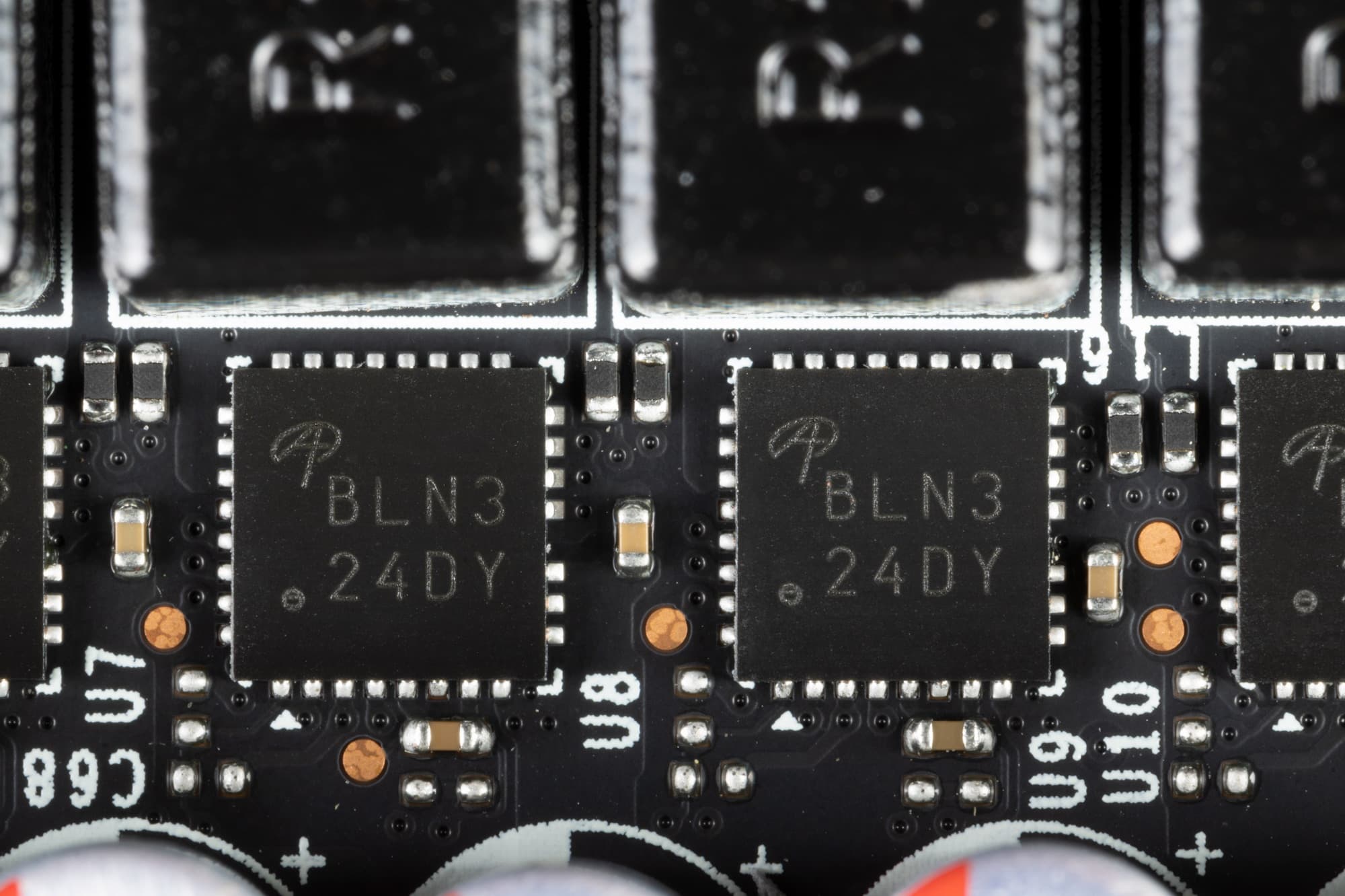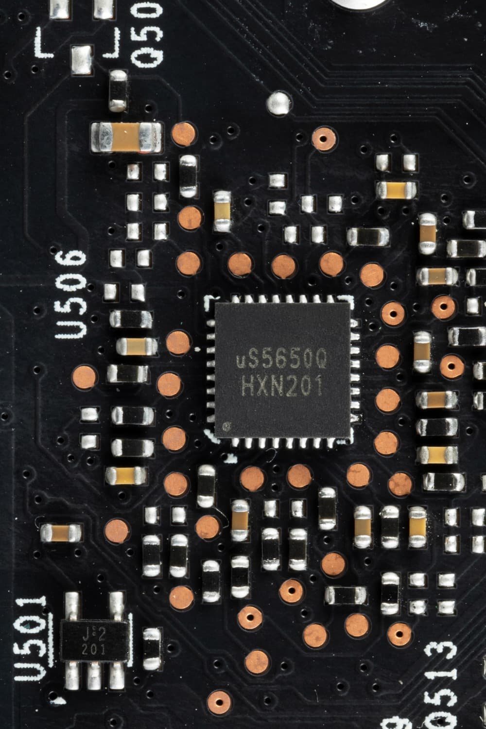 Также имеется контроллер uS5650Q (uPI Semiconductor), отвечающий за мониторинг карты (слежение за напряжением и температурой). Он расположен на лицевой стороне PCB.