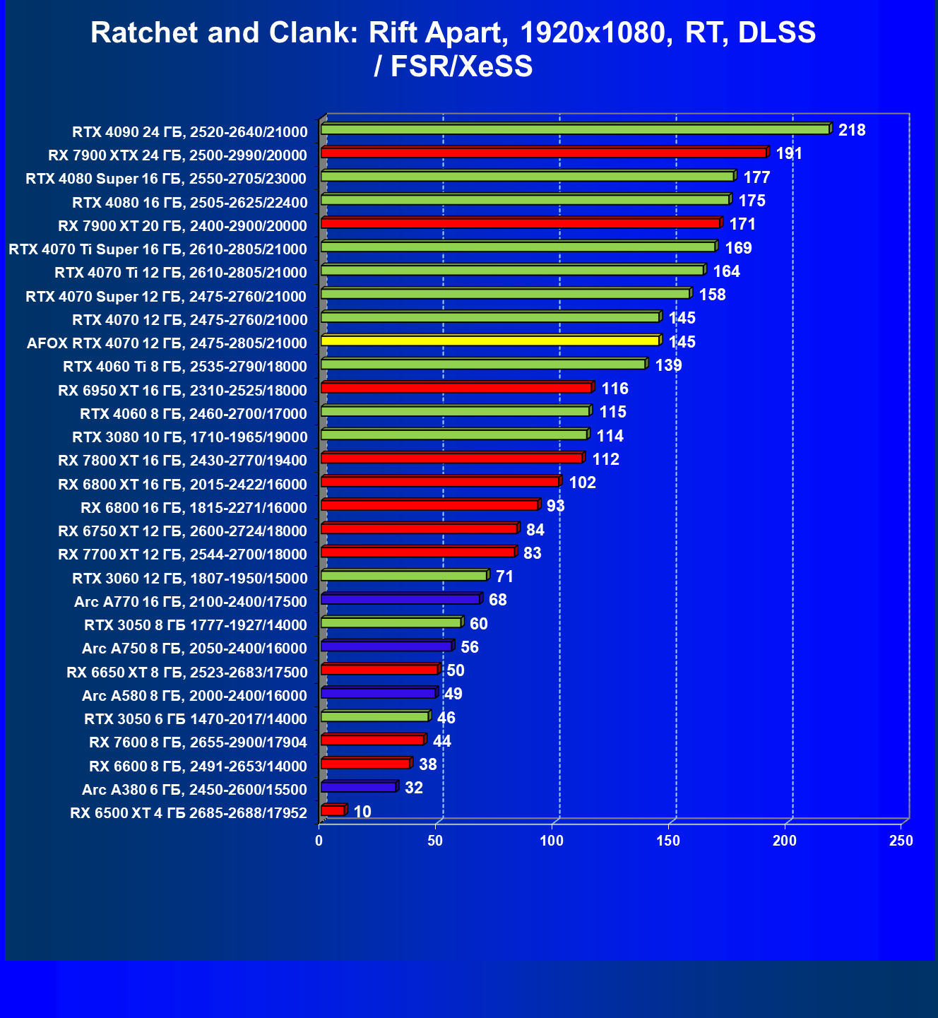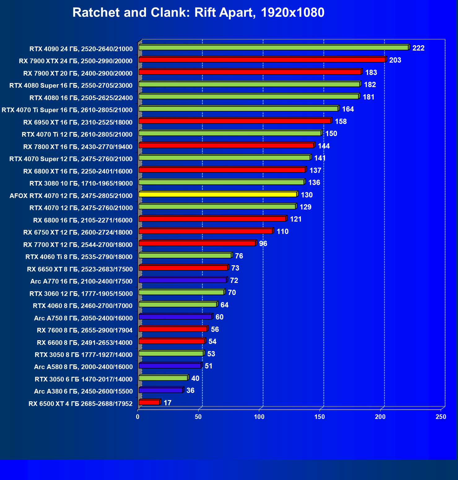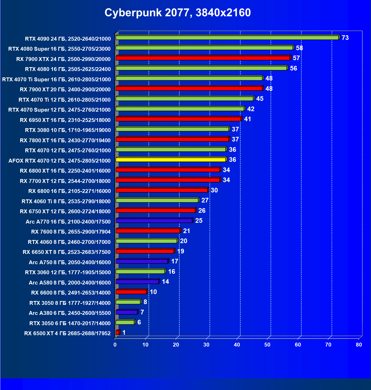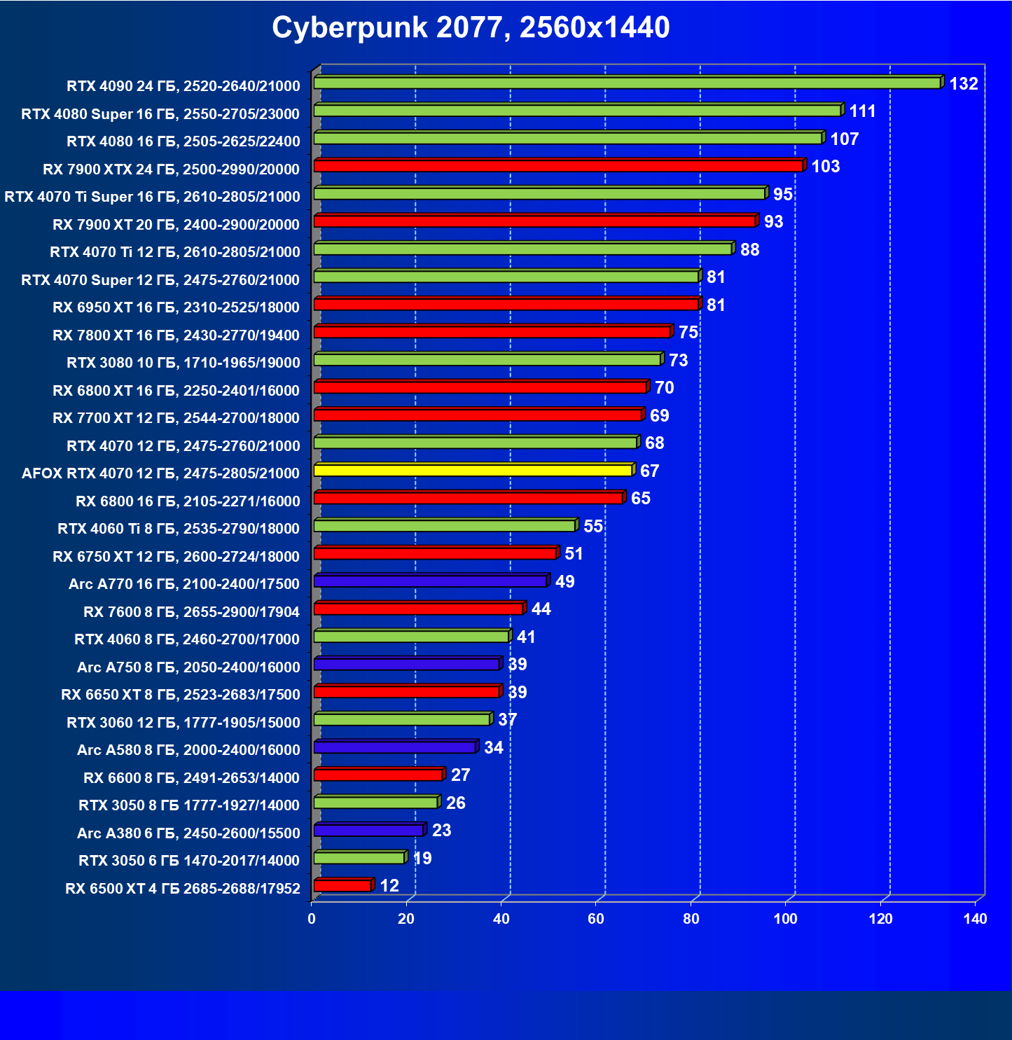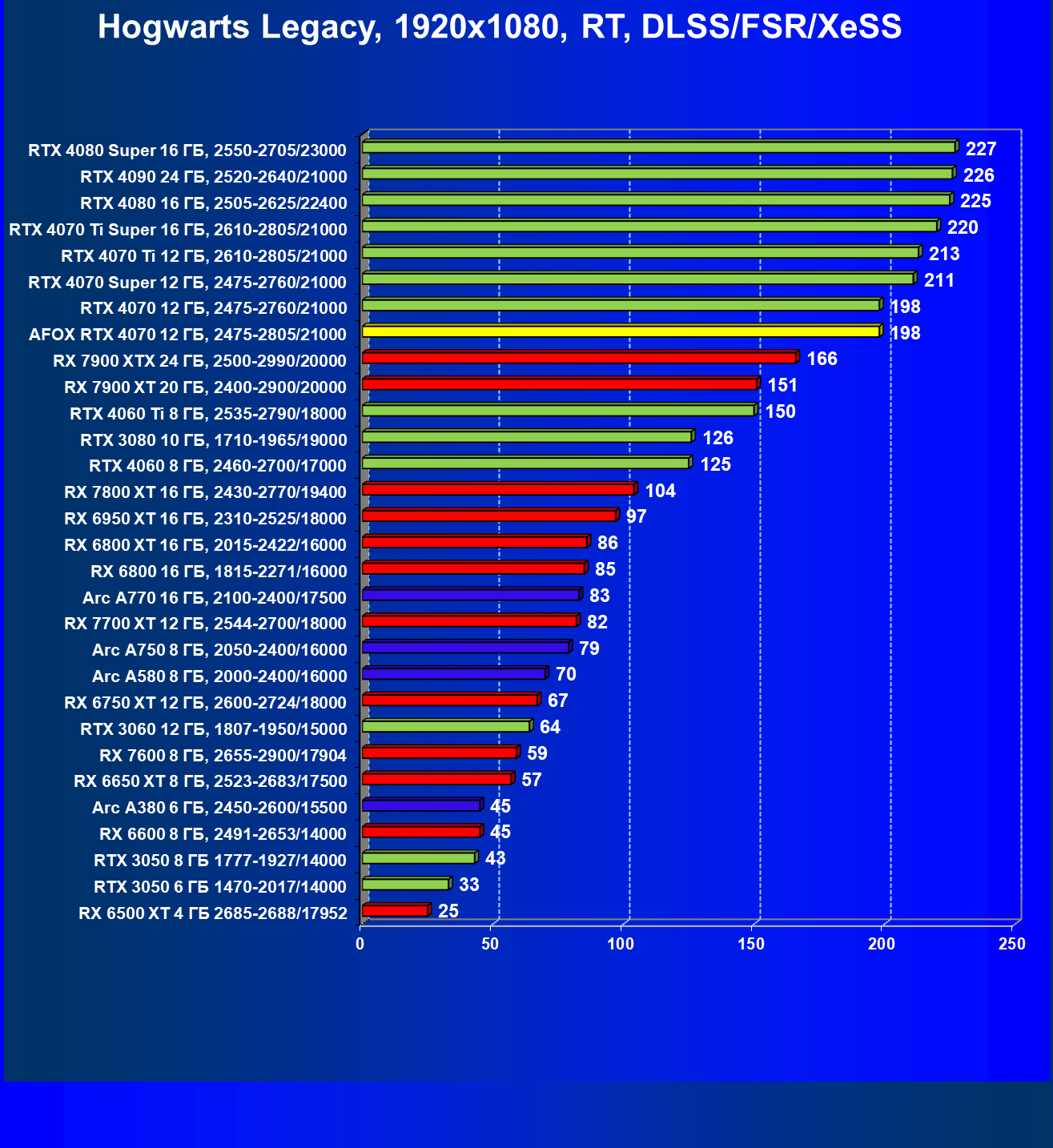 | 09 | Afox RTX 4070 12 ГБ, 2475—2805/21000 | 1322 | 228 | 58 000 |
