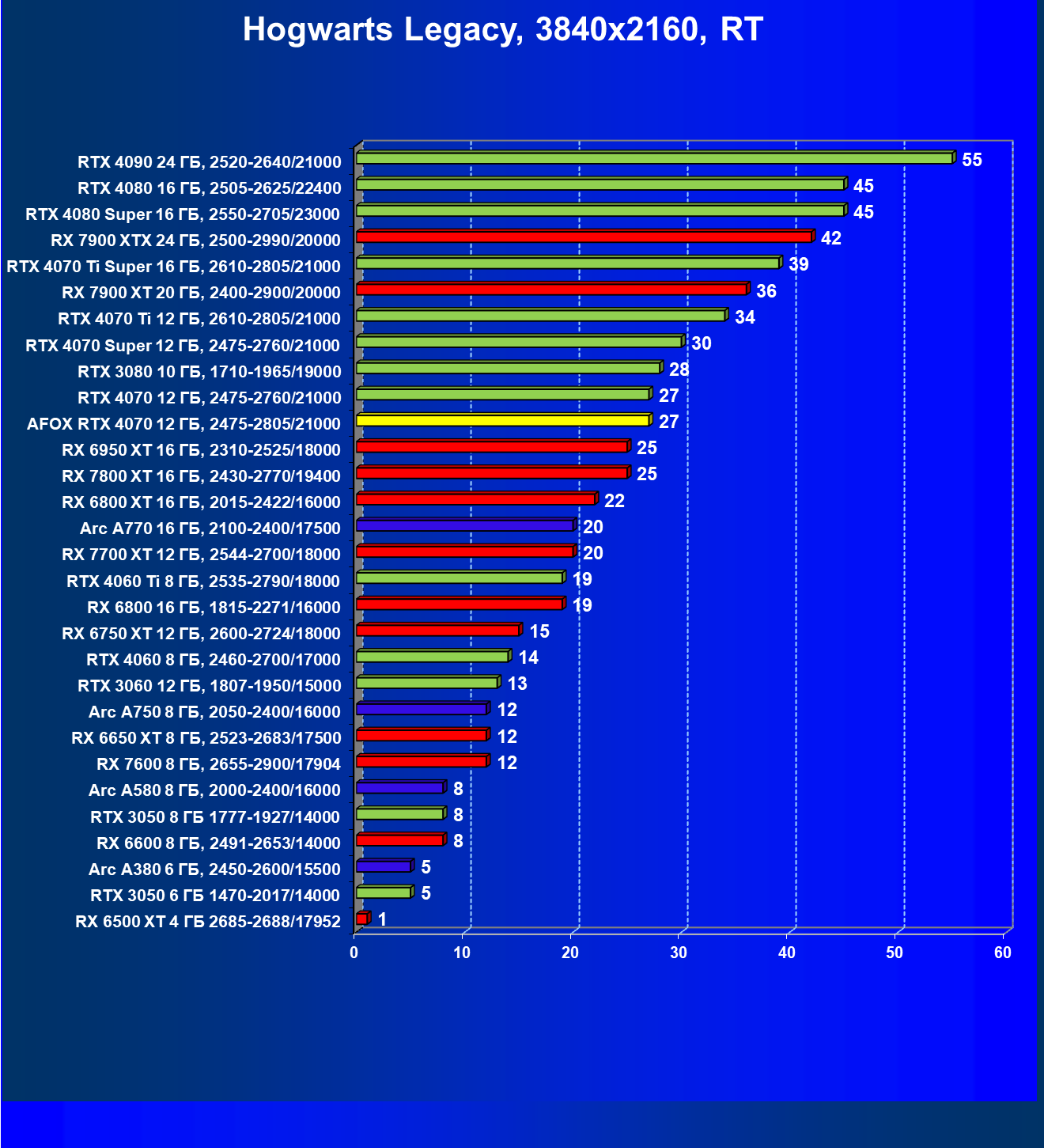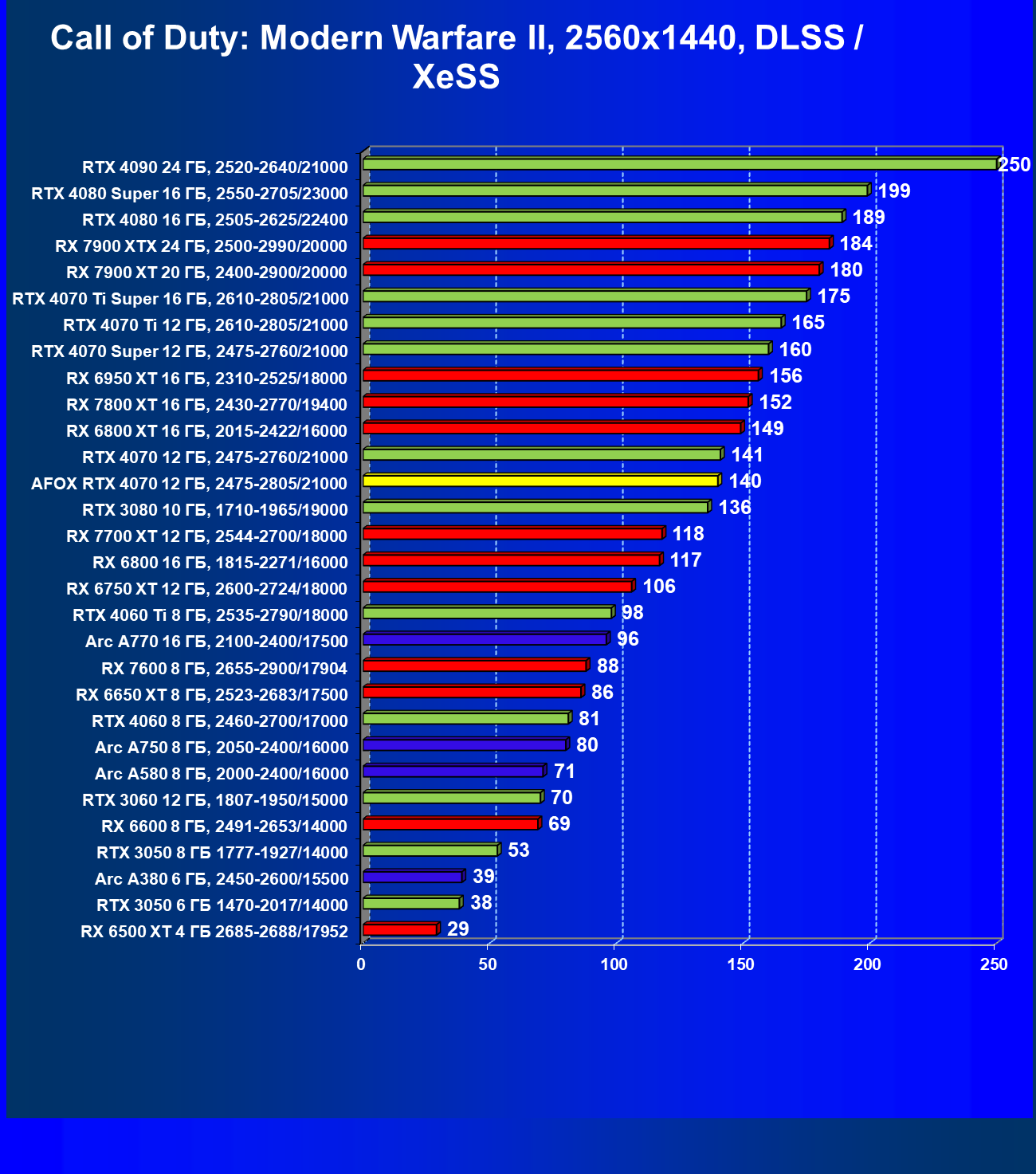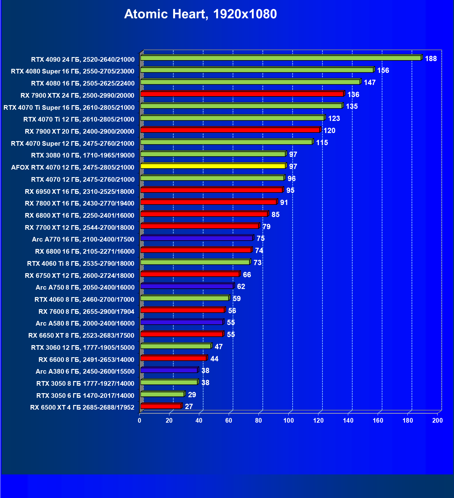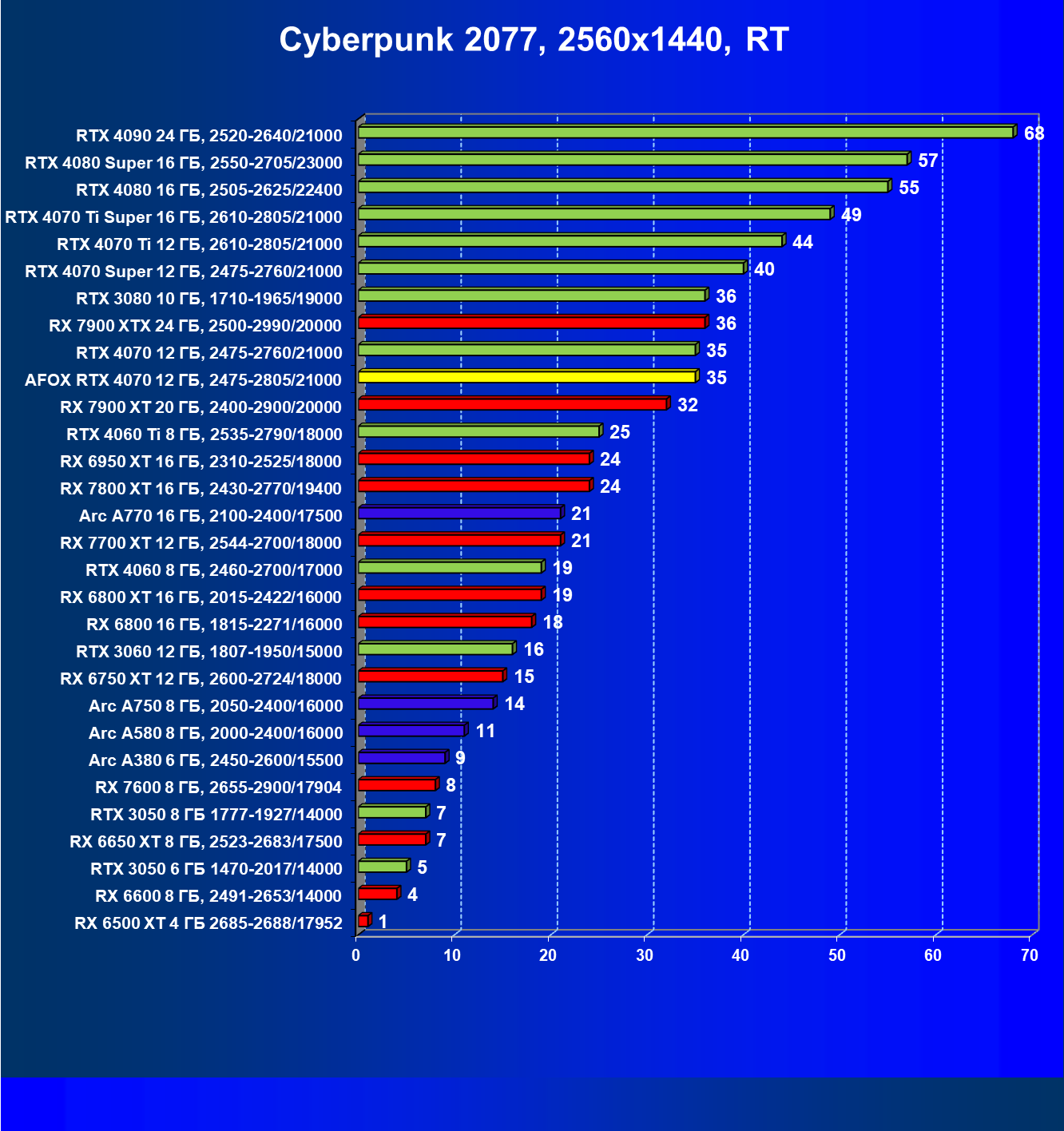 | 09 | Afox RTX 4070 12 ГБ, 2475—2805/21000 | 1322 | 228 | 58 000 |