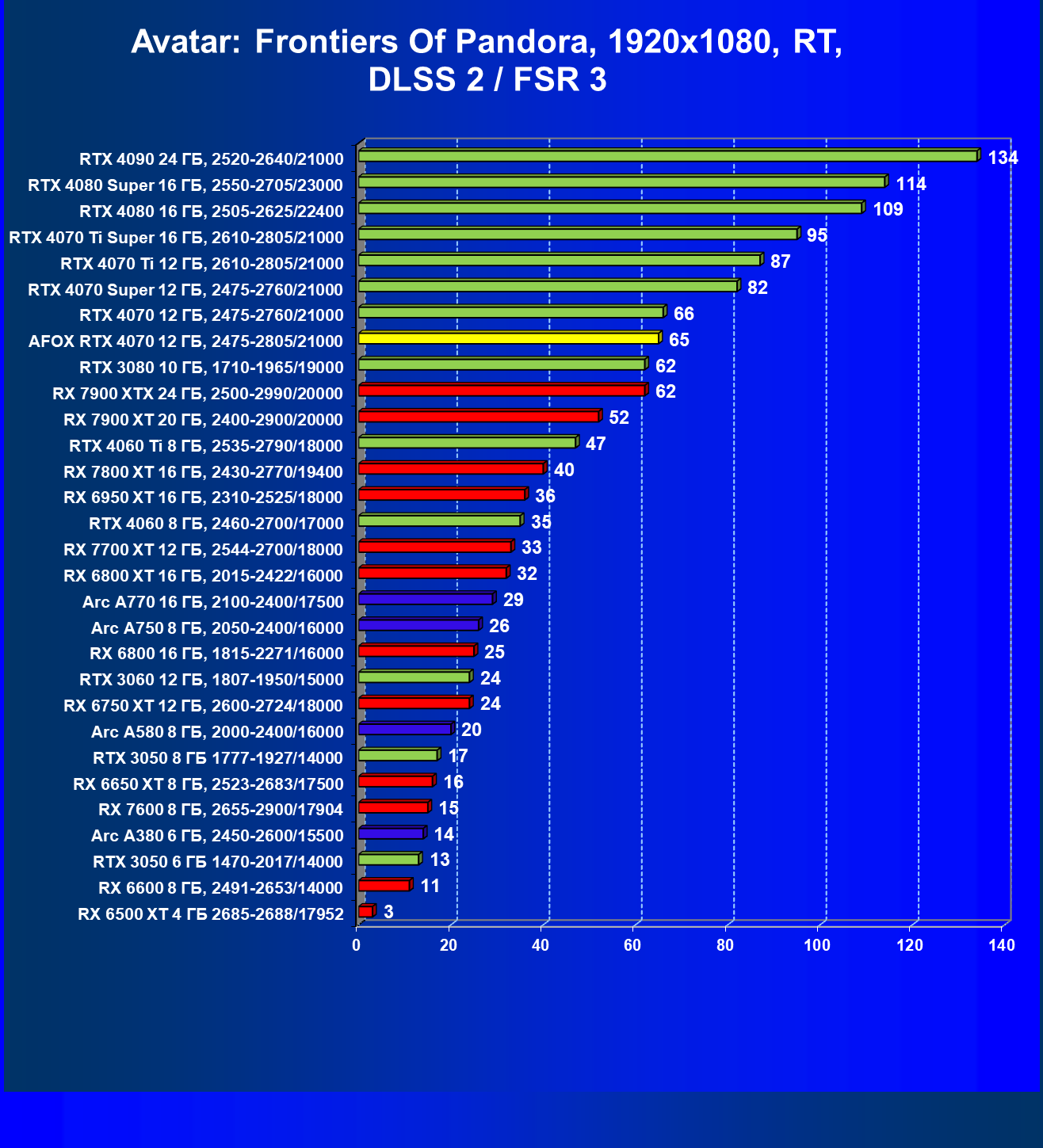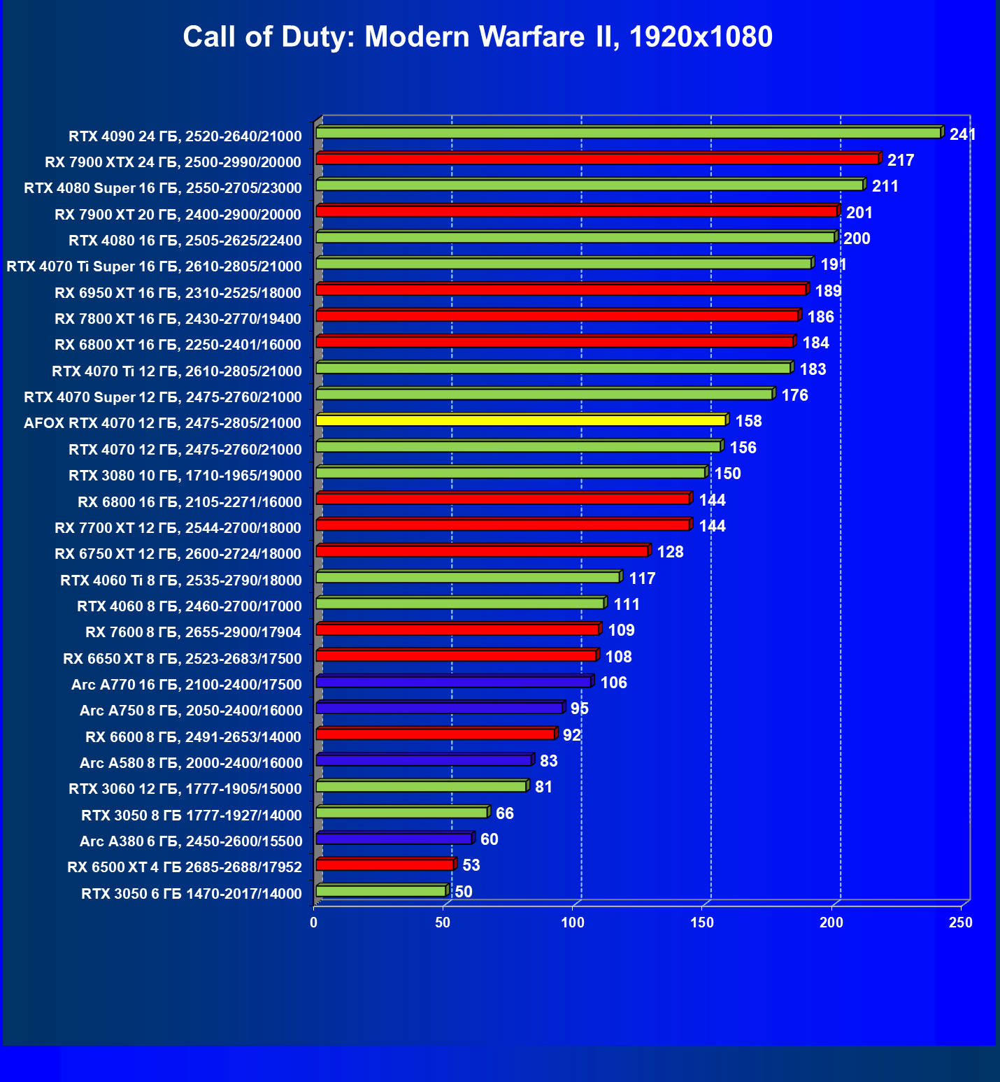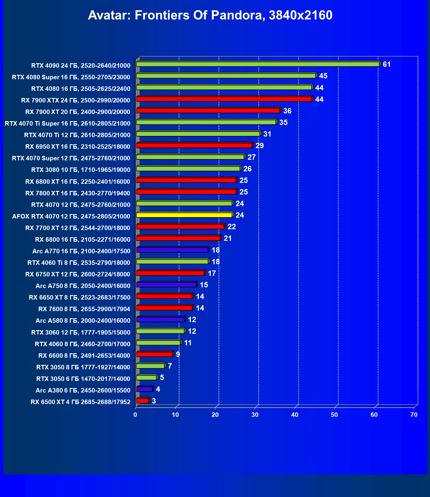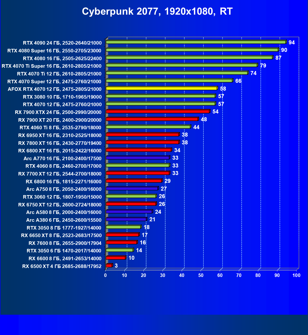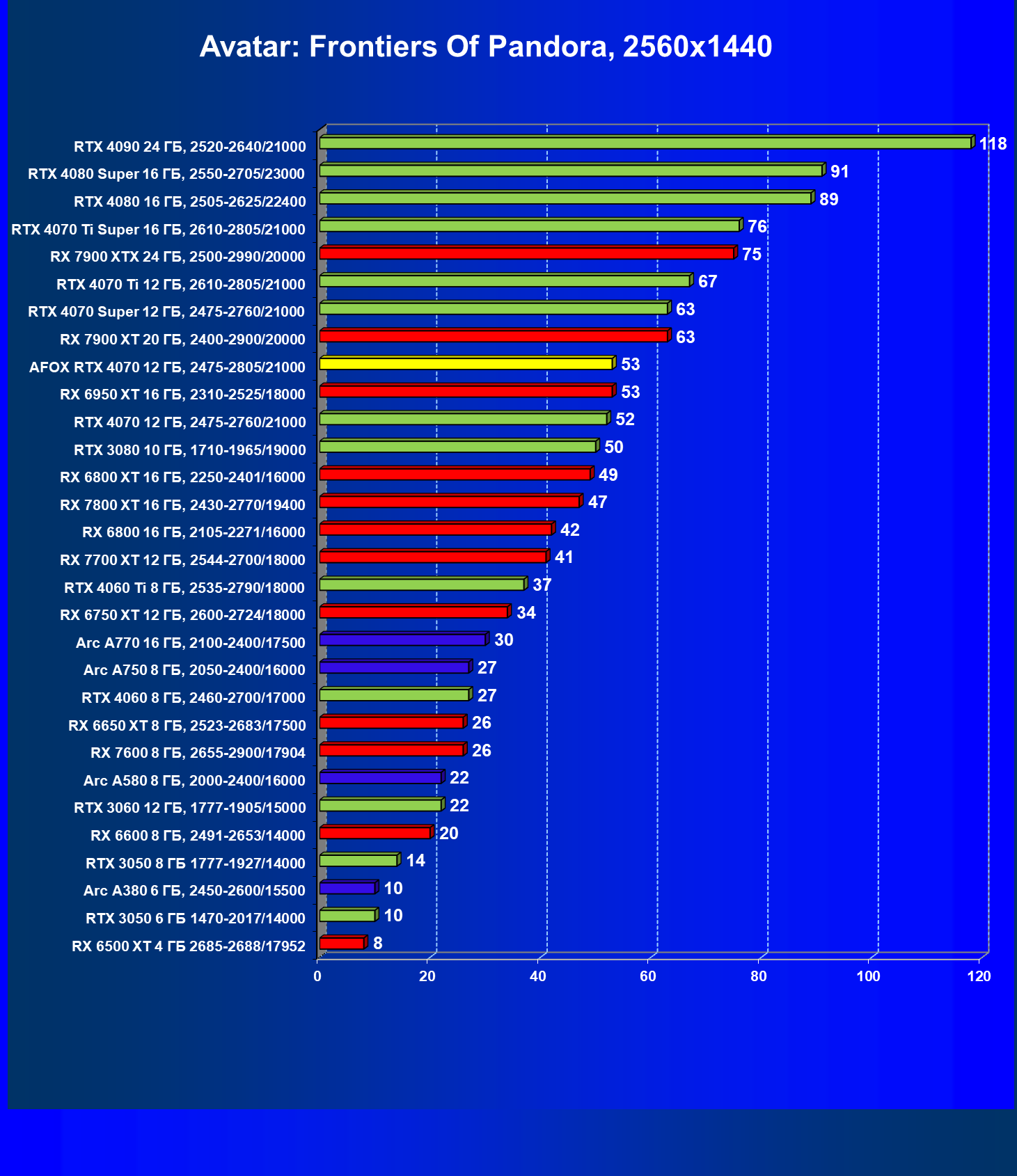 | 09 | Afox RTX 4070 12 ГБ, 2475—2805/21000 | 1322 | 228 | 58 000 |