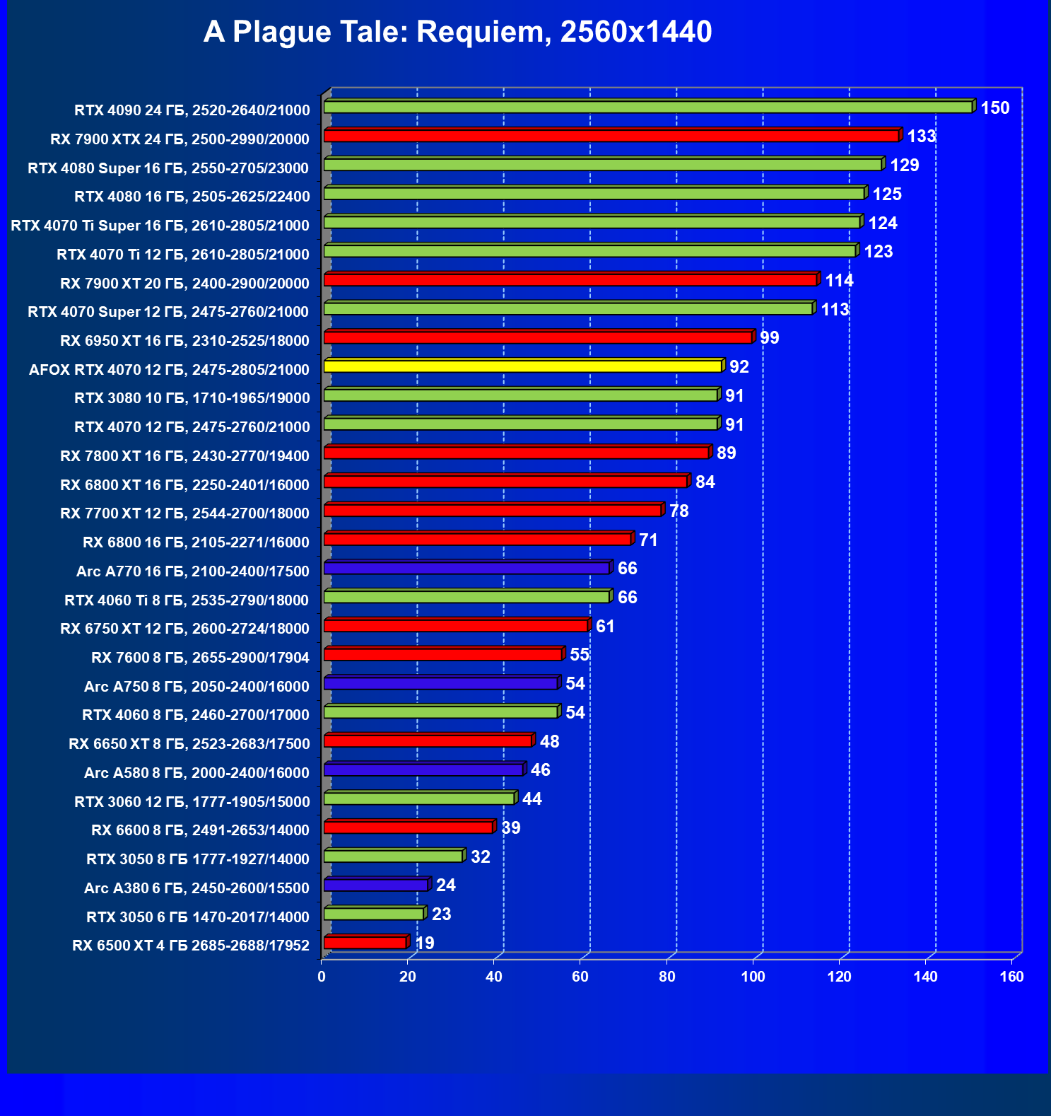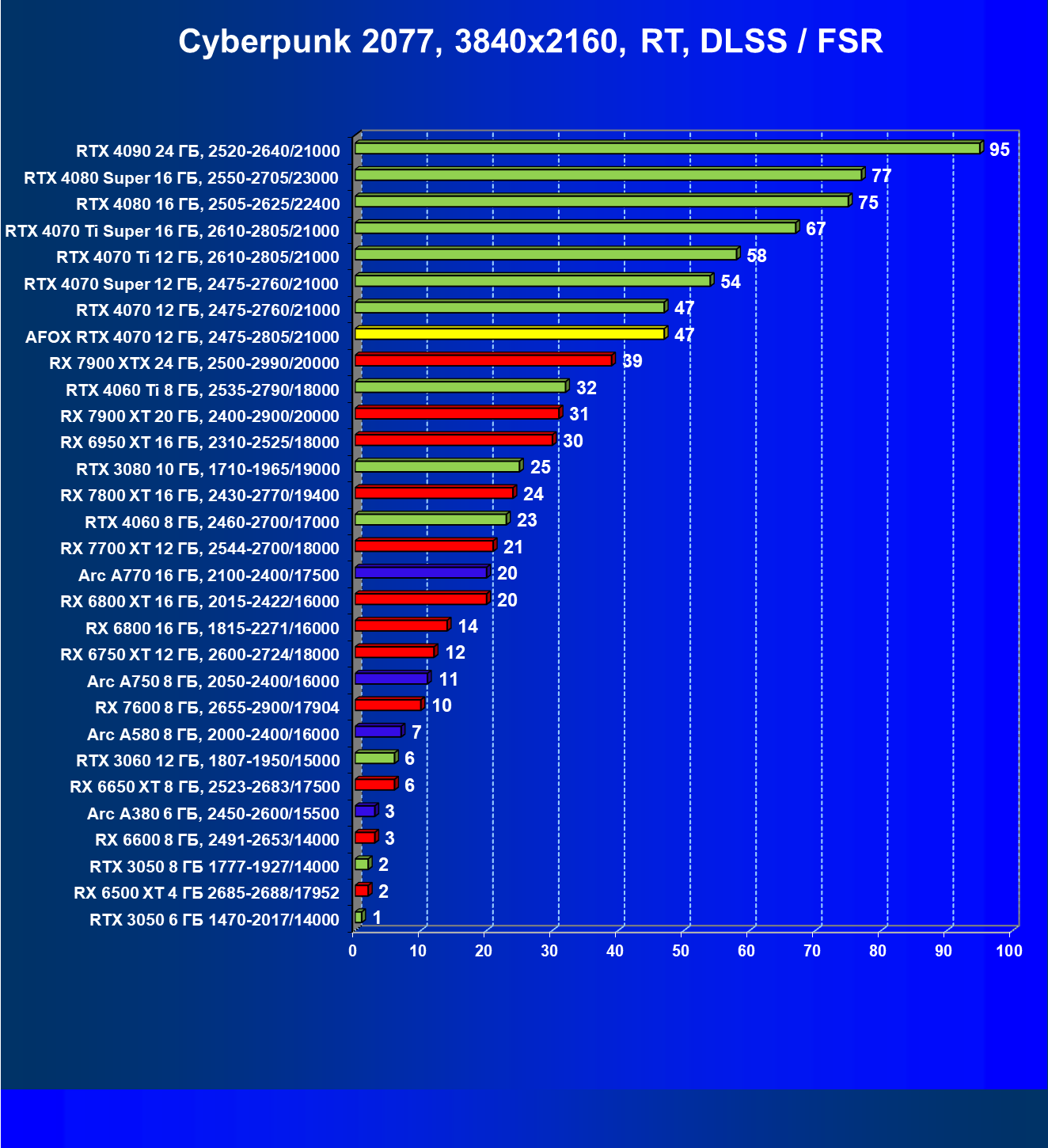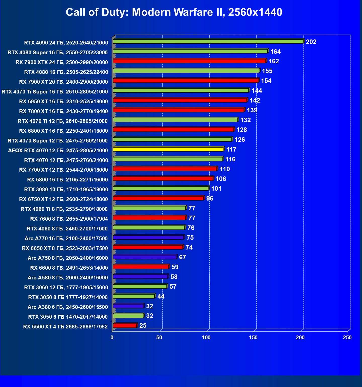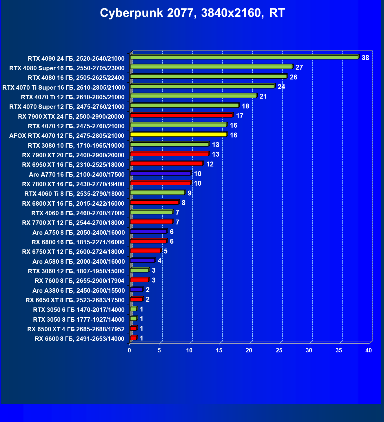 | 09 | Afox RTX 4070 12 ГБ, 2475—2805/21000 | 1322 | 228 | 58 000 |