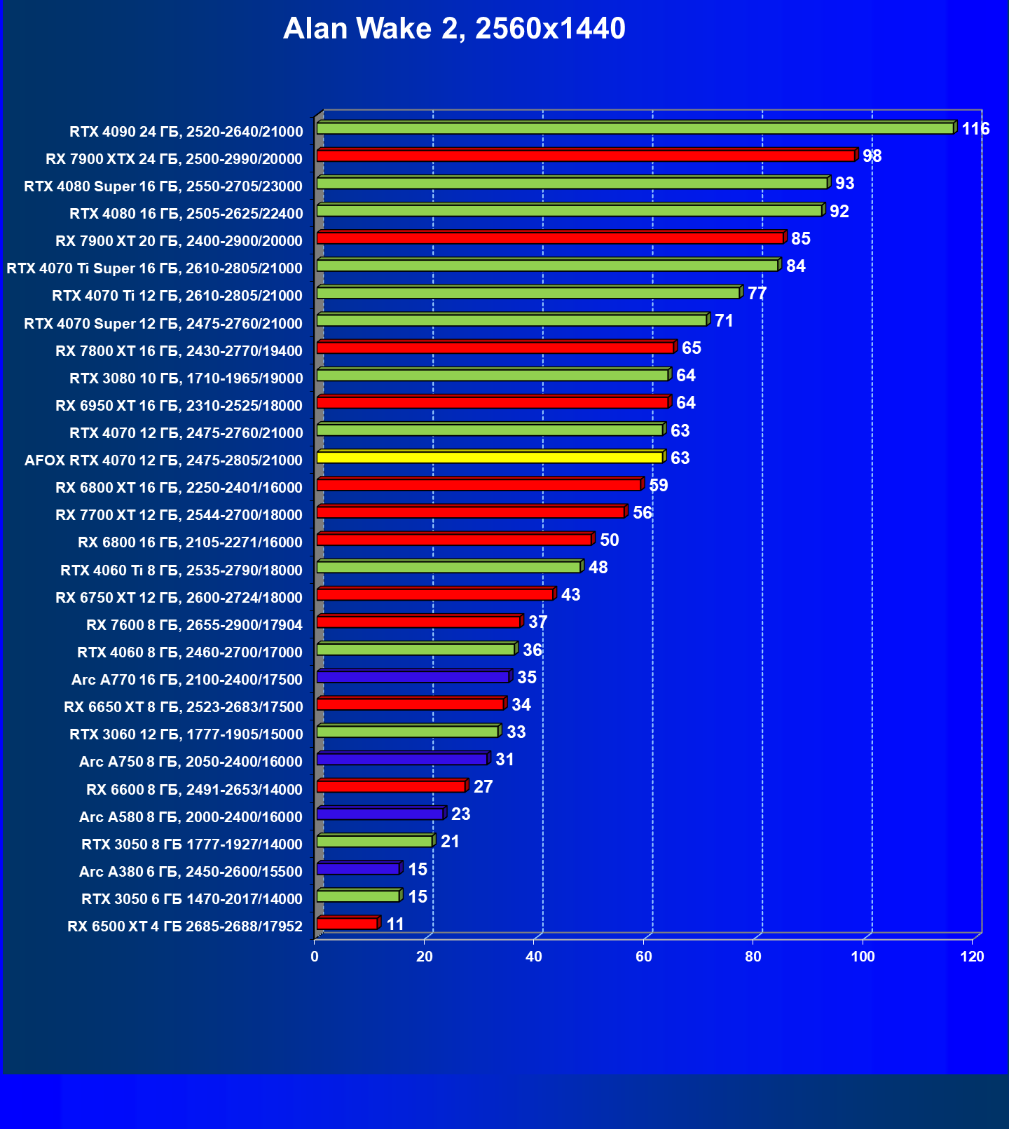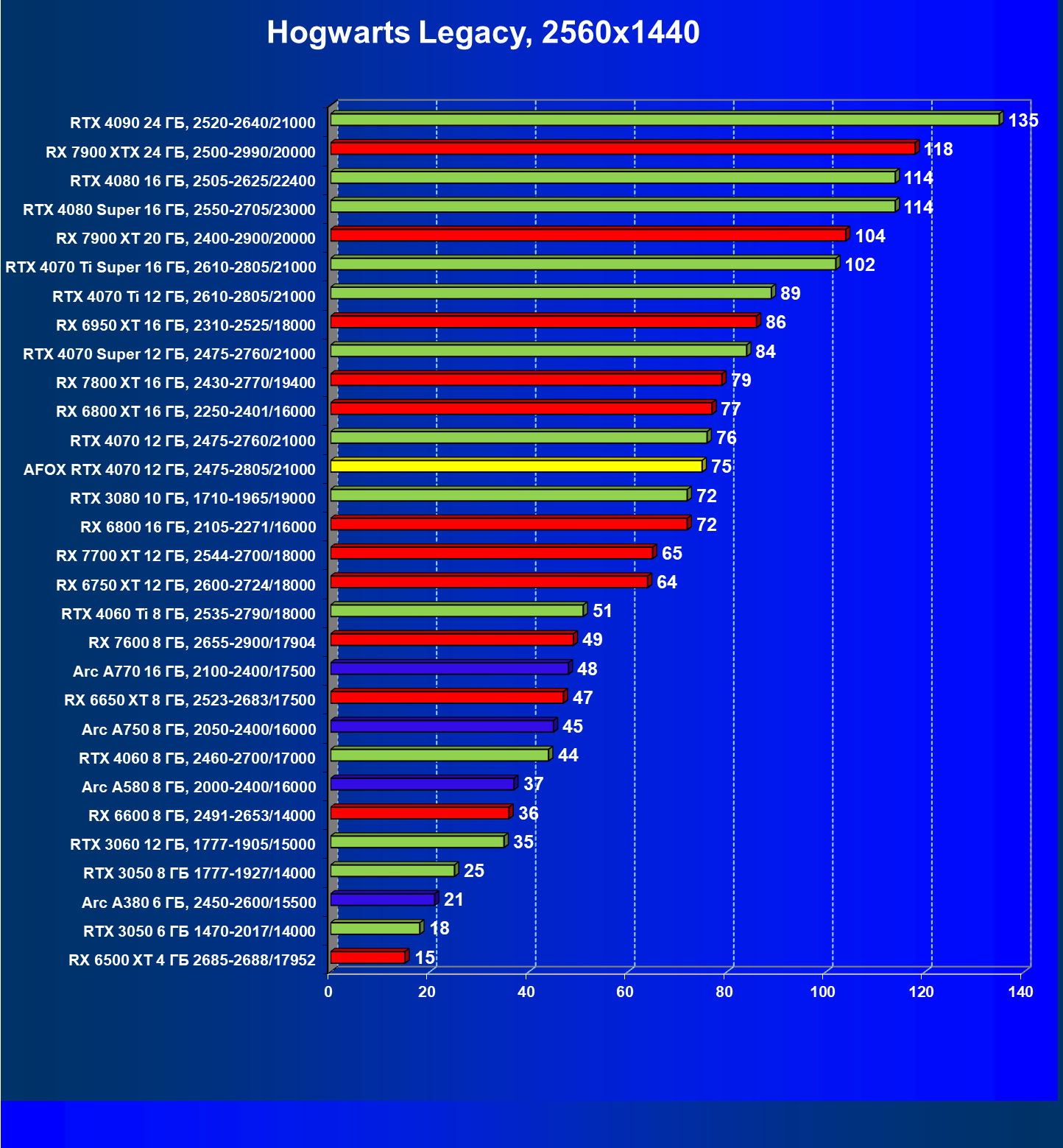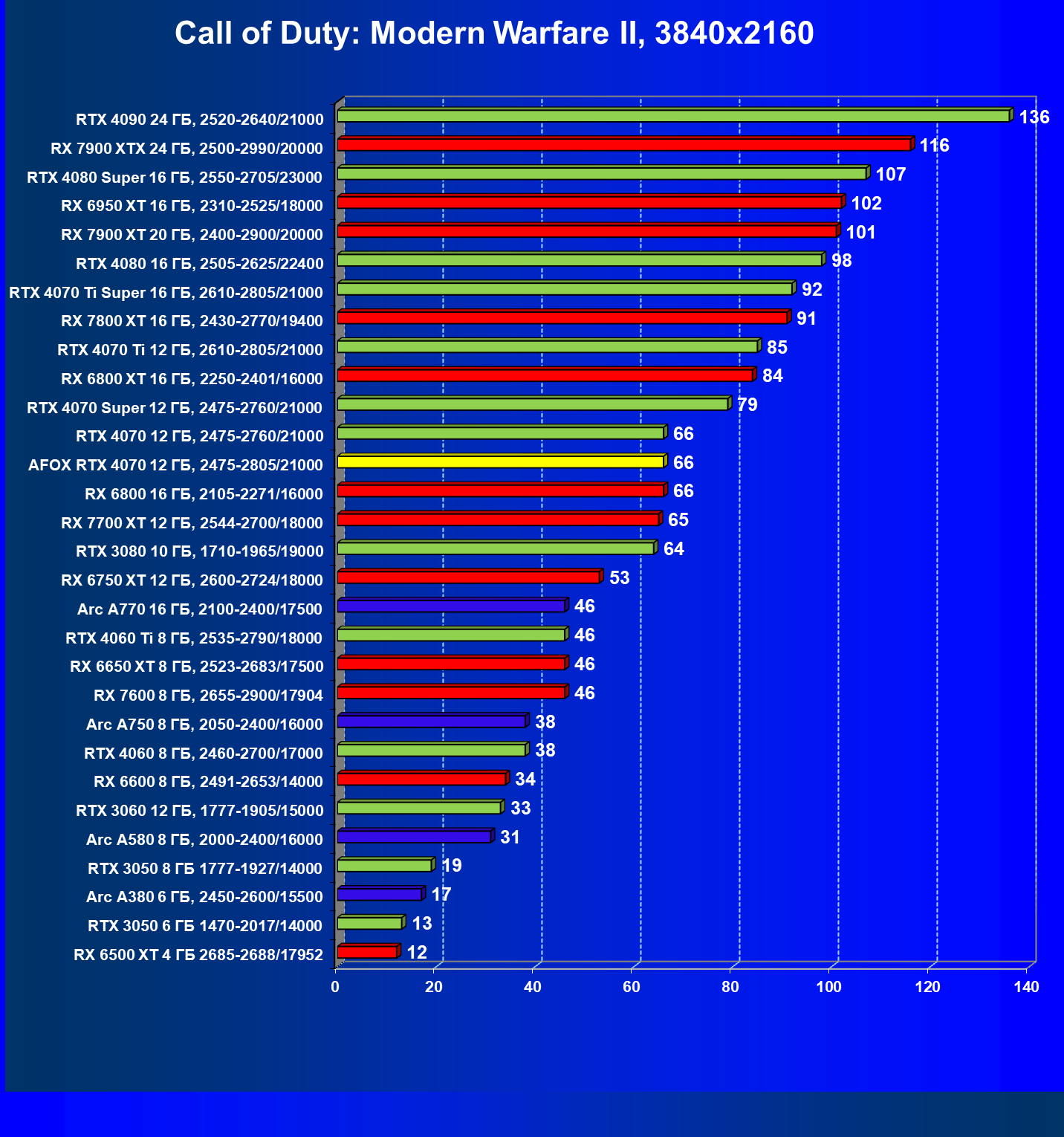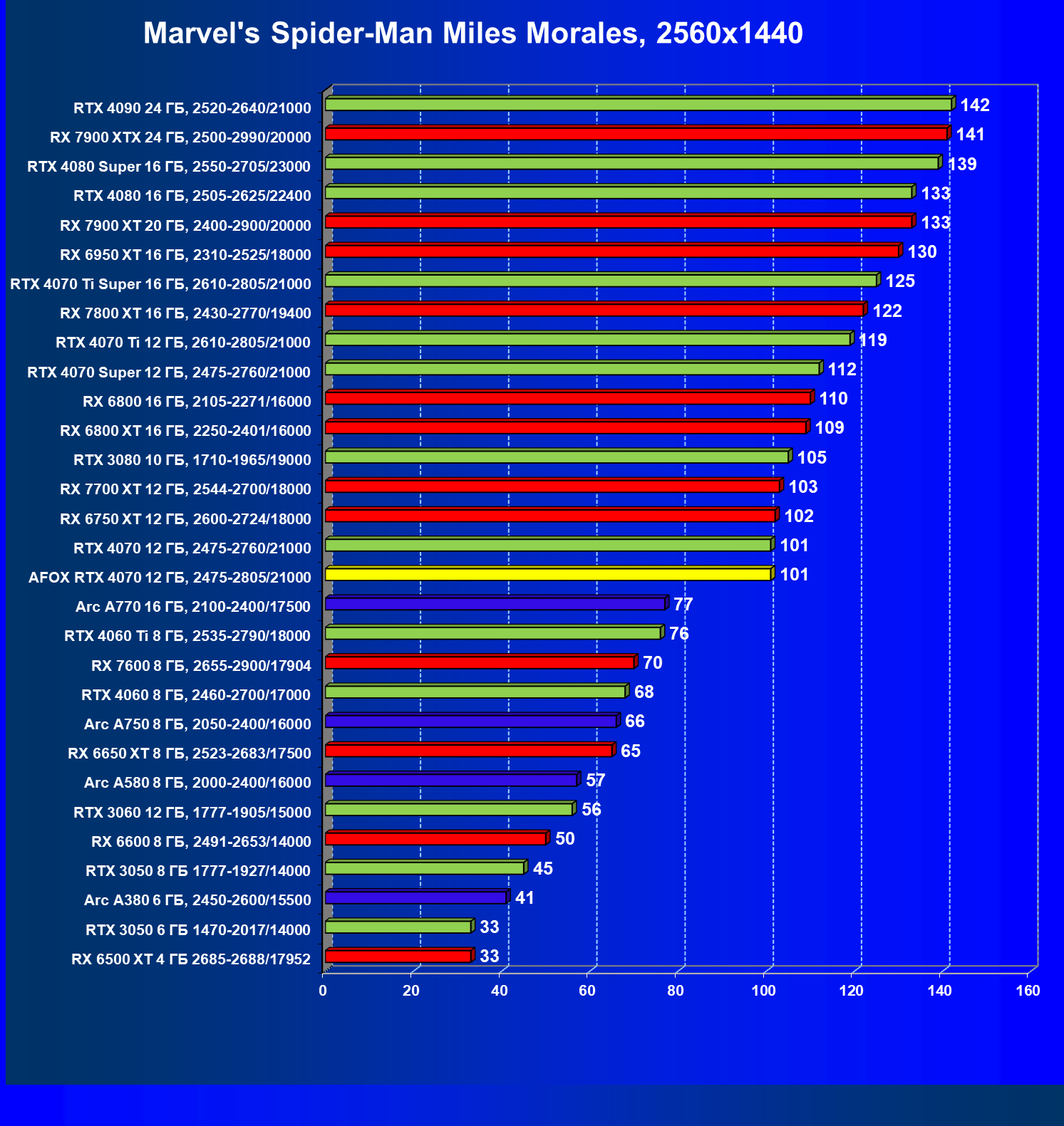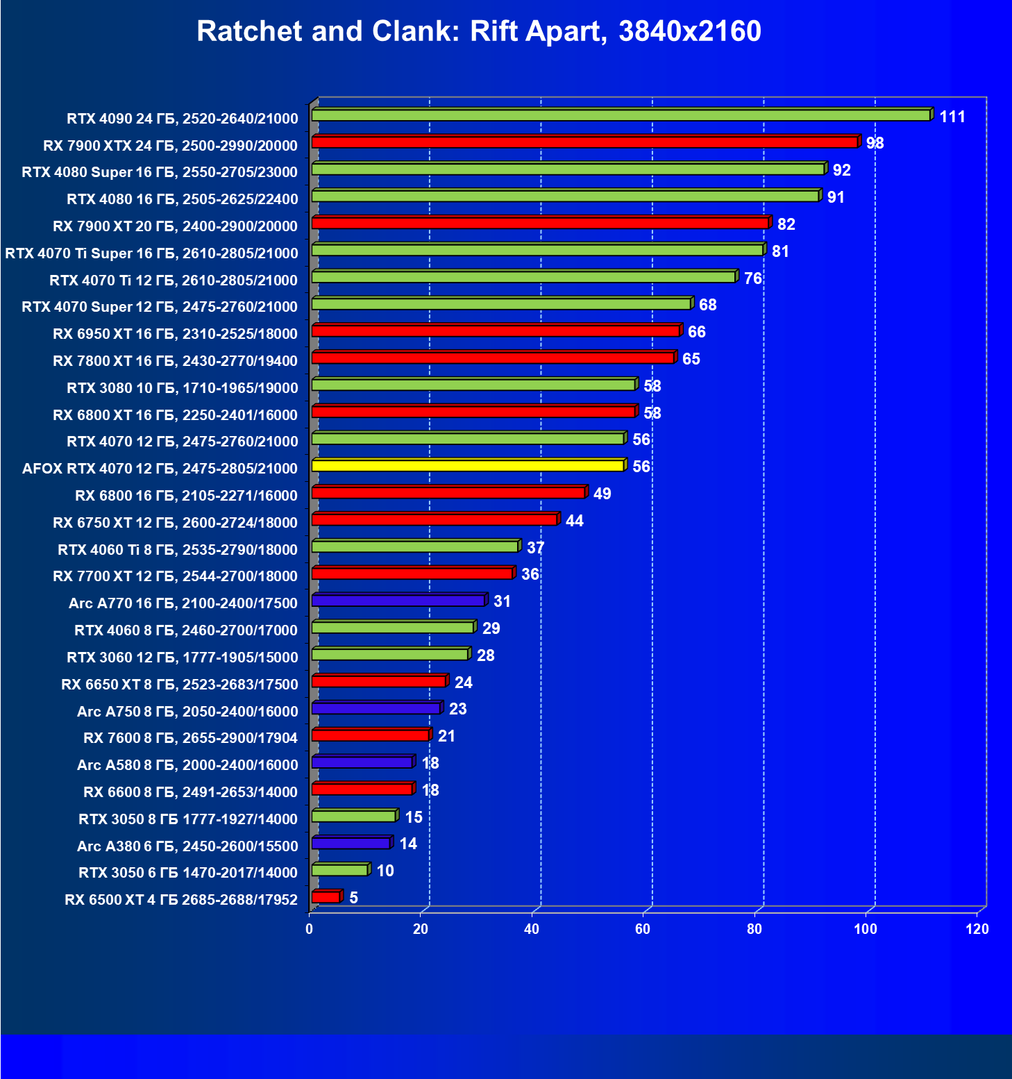 | 09 | Afox RTX 4070 12 ГБ, 2475—2805/21000 | 1322 | 228 | 58 000 |